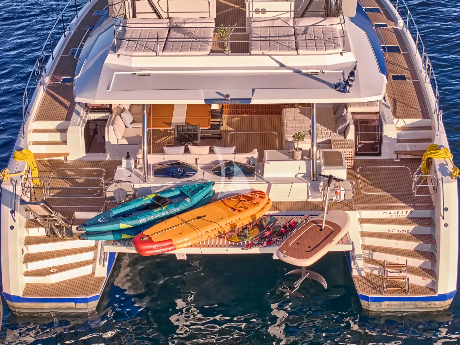 For those seeking adventure, Majesty of Greece boasts a wide range of water toys, ensuring endless fun on the water. And thanks to the hydraulic aft bathing platform, accessing the sea has never been easier—perfect for swimming, lounging, or launching your favorite toys.