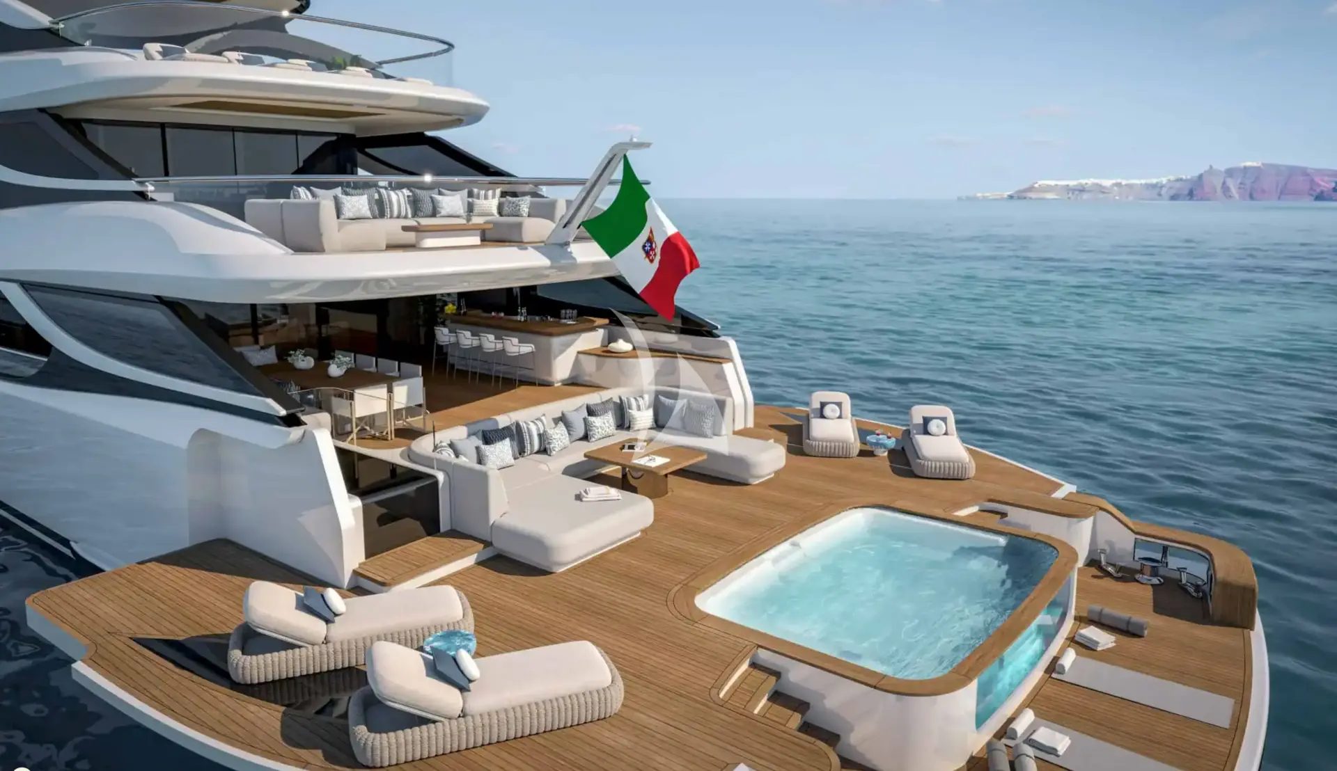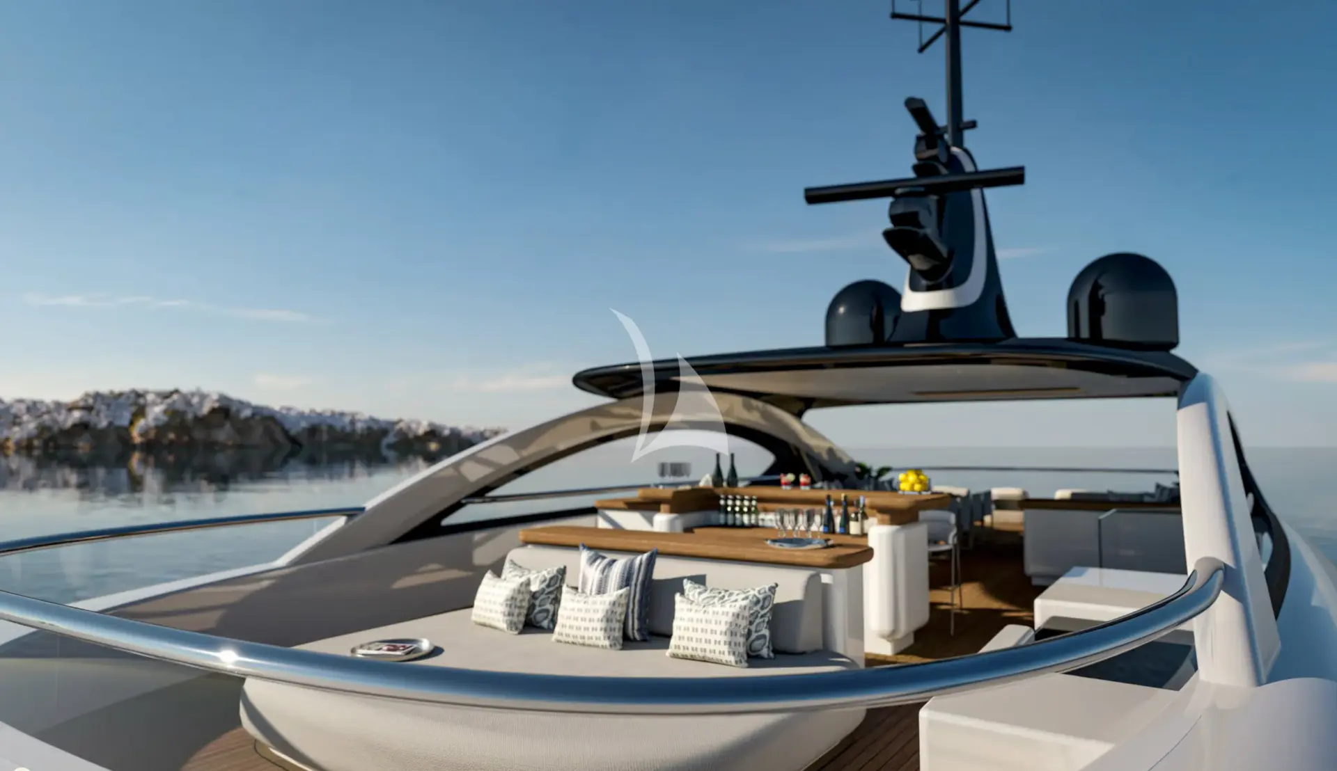 Outdoor living is at the heart of the experience. The main deck aft features a striking infinity pool, creating a natural social hub with direct connection to the sea, while the sundeck offers a jacuzzi and multiple areas for lounging and dining with panoramic views. Forward, a spacious bow lounge transforms into an open-air cinema, providing a unique setting for relaxed evenings on board.