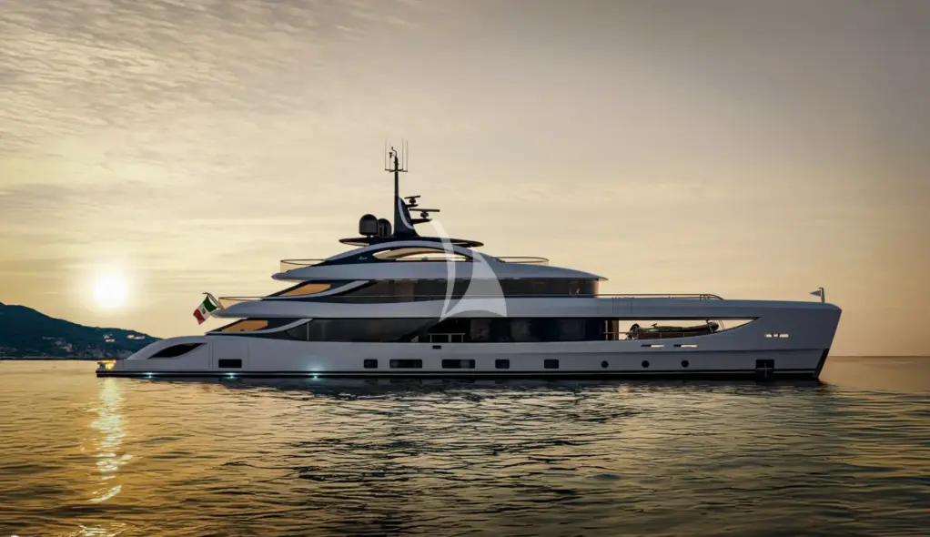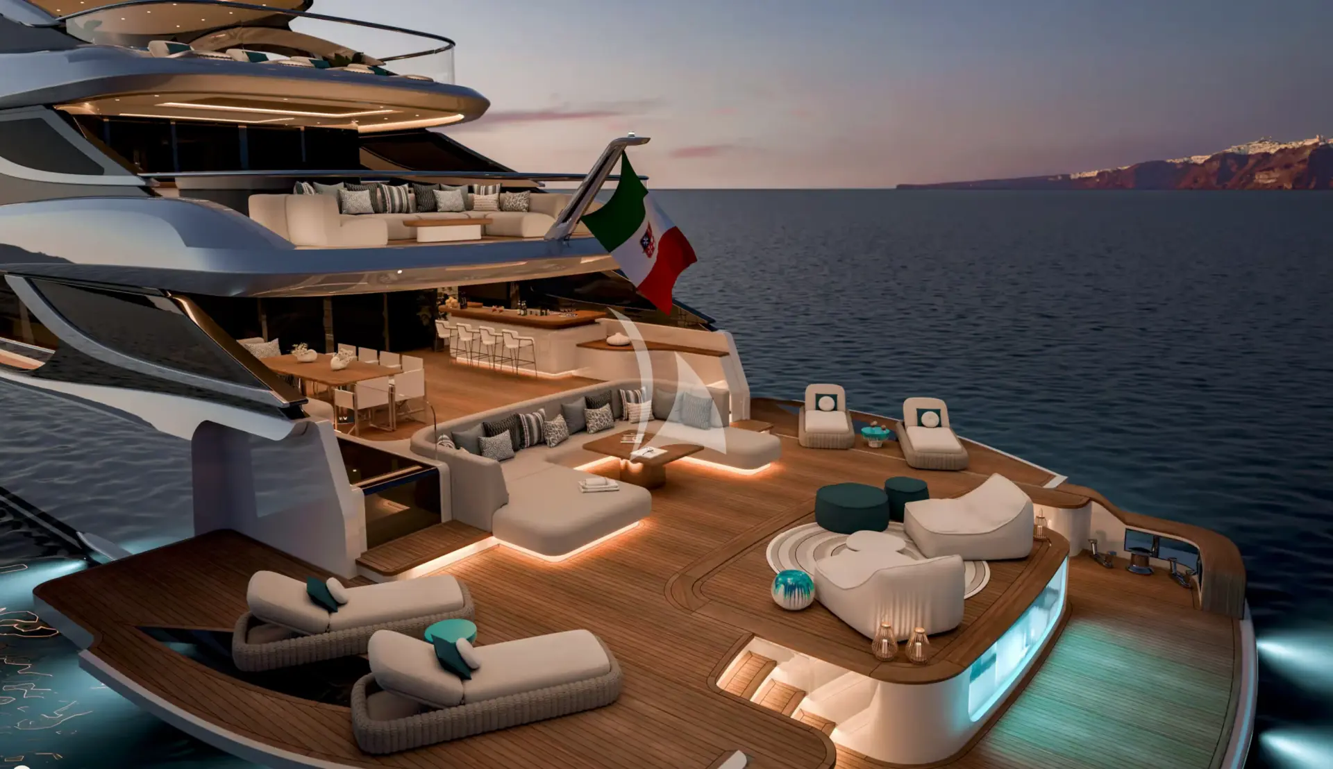 At water level, a generous 36-square-meter beach club with a balcony door and steam room offers a dedicated space for wellness and relaxation, enhancing the yacht’s seamless indoor-outdoor flow.