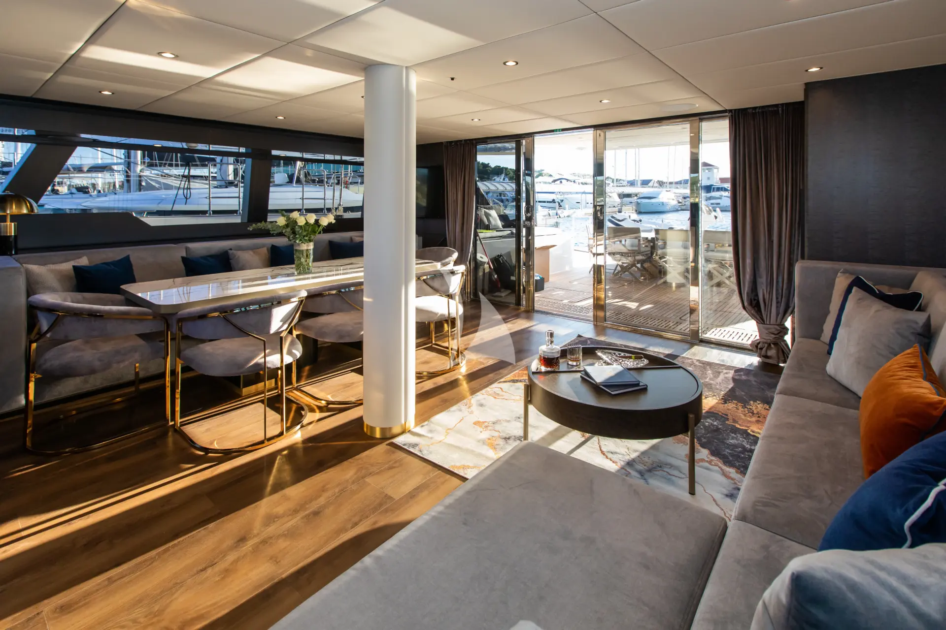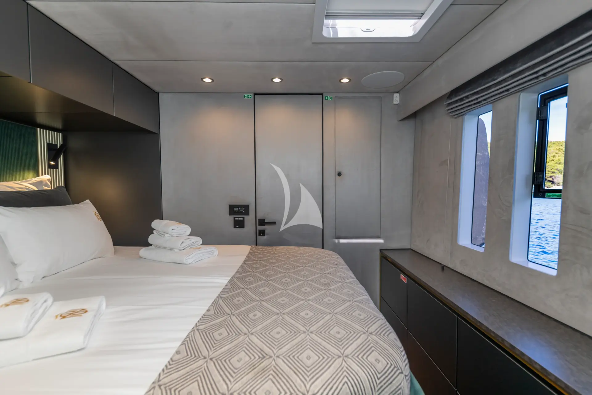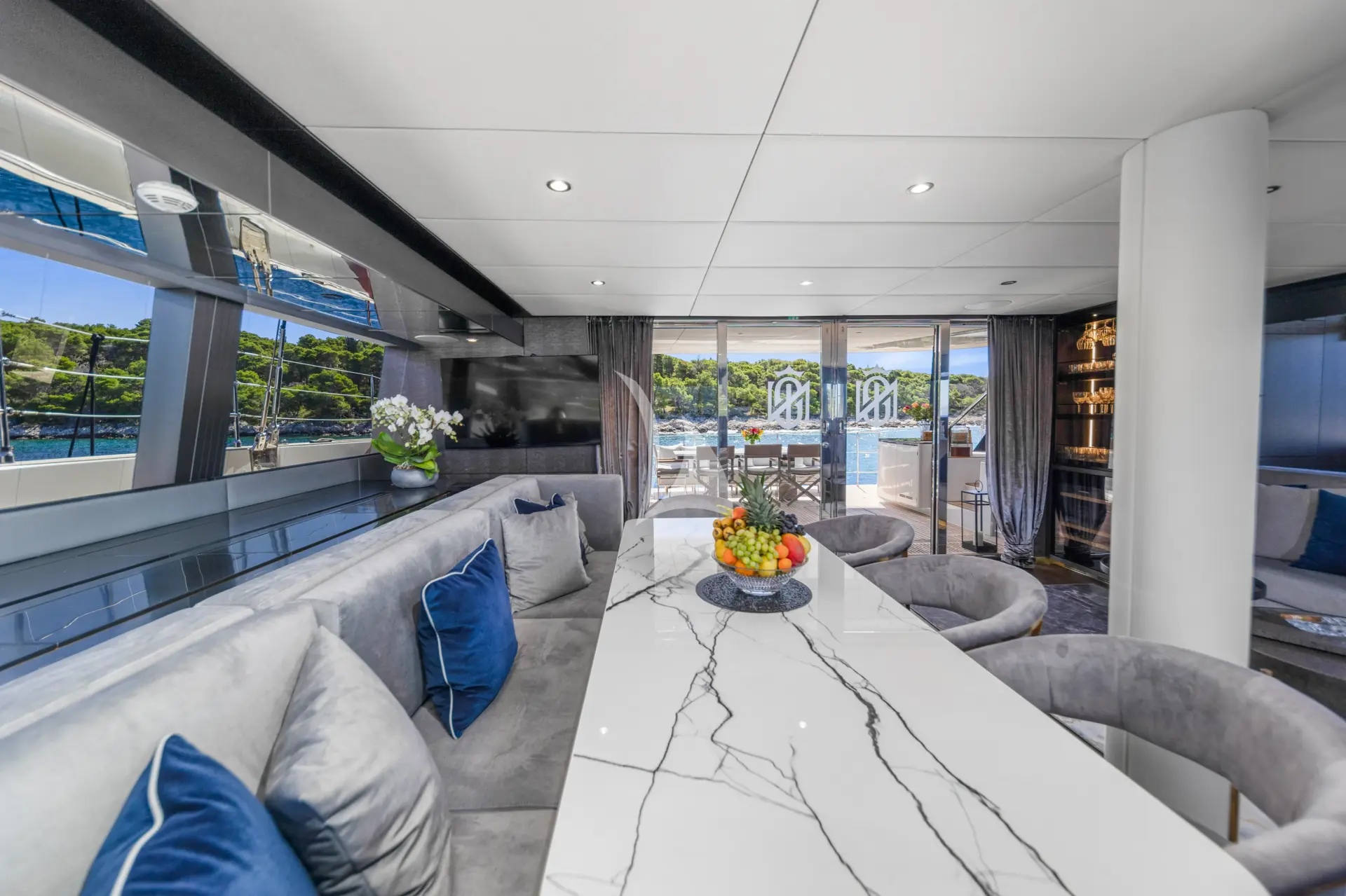 MR.SI is a luxurious and contemporary Sunreef 60 that combines sleek design with spacious comfort. Expansive windows fill the saloon with natural light and offer panoramic views, while sliding glass doors seamlessly connect indoor and outdoor living areas. Each cabin features a private ensuite, individual climate control, and personalized settings, allowing guests to wake up and fall asleep to enchanting sea views in both the Master and Guest rooms.