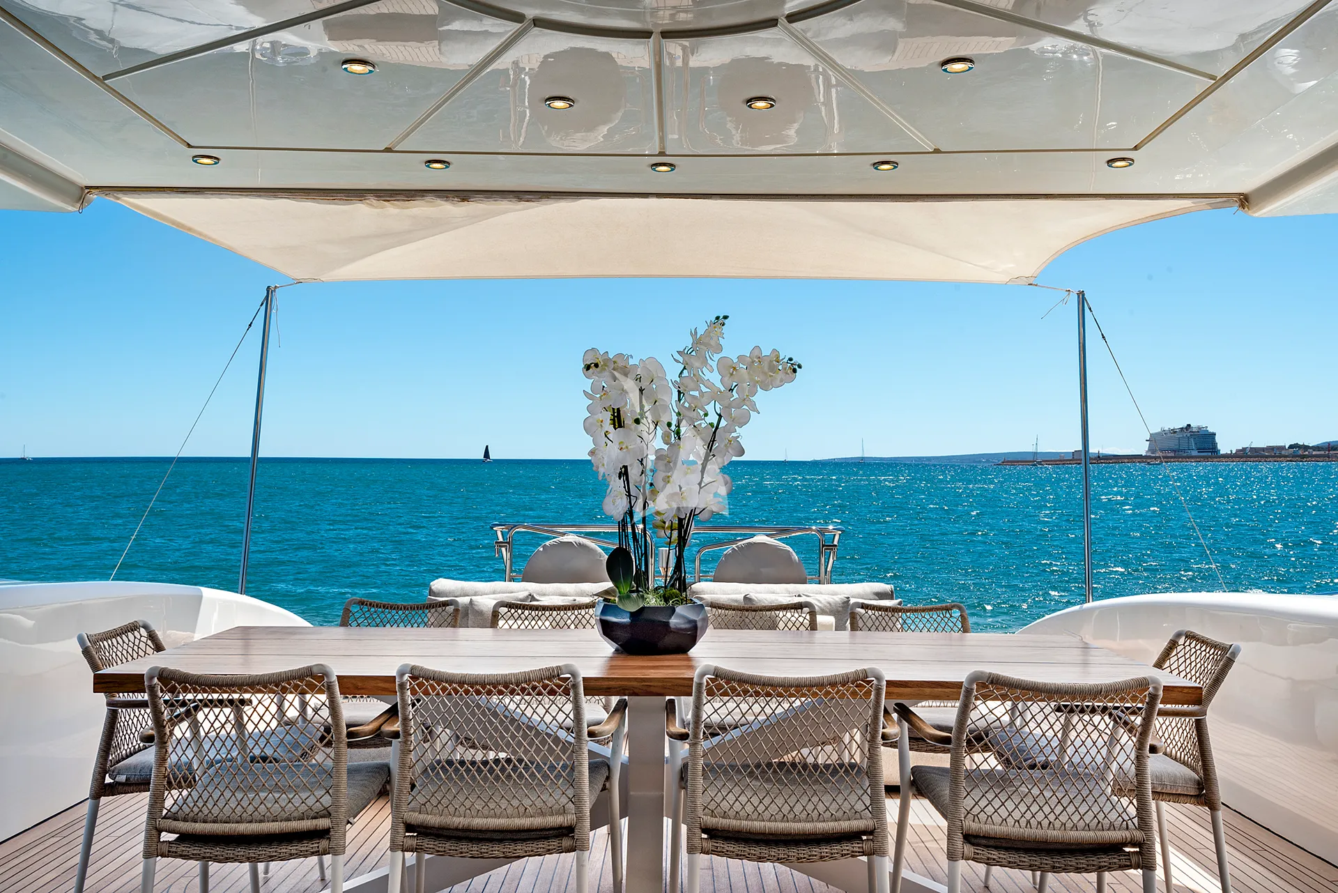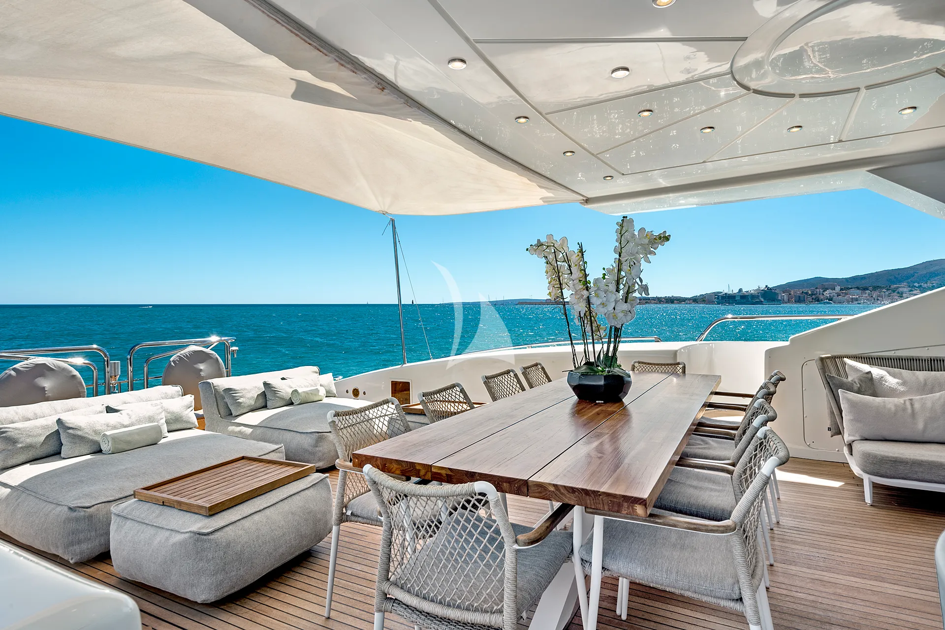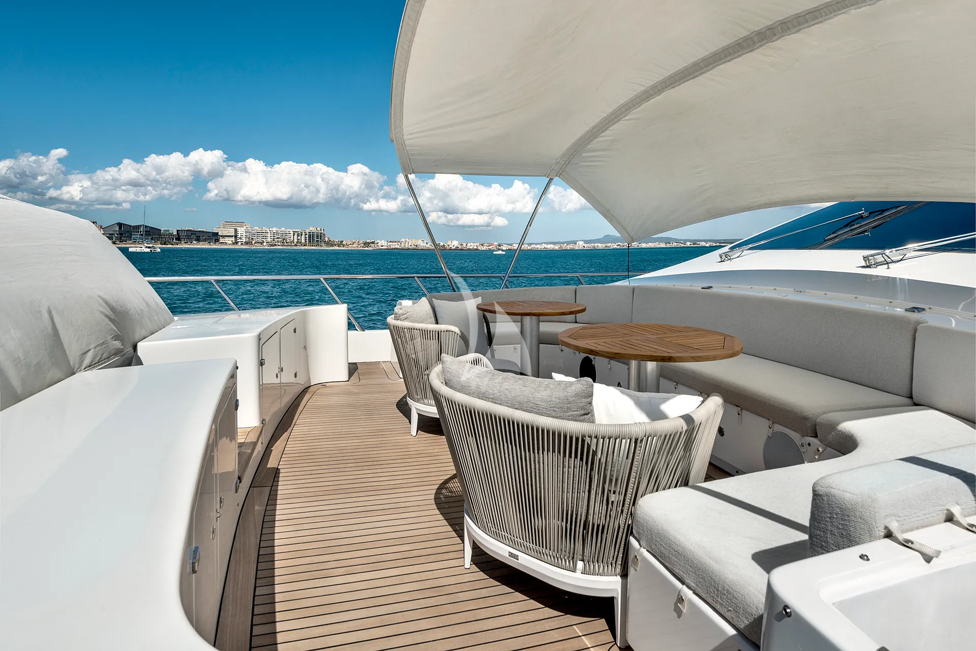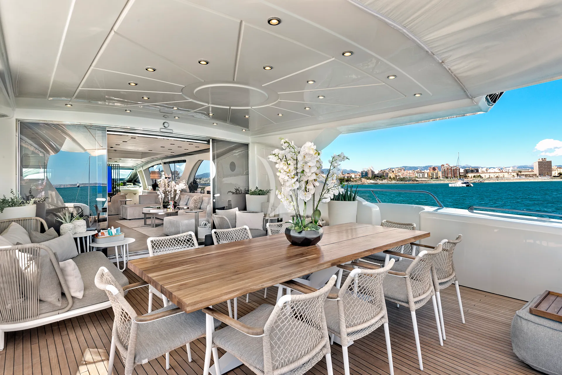 Her sleek exterior lines are perfectly matched by generous deck spaces designed for relaxation and entertainment. The aft deck offers a partially shaded lounge with a bar, an alfresco dining area, and spacious sunpads for soaking up the Mediterranean sun. Forward, additional sunpads and a comfortable seating area with a table provide an inviting setting to unwind or enjoy cocktails while taking in panoramic sea views.