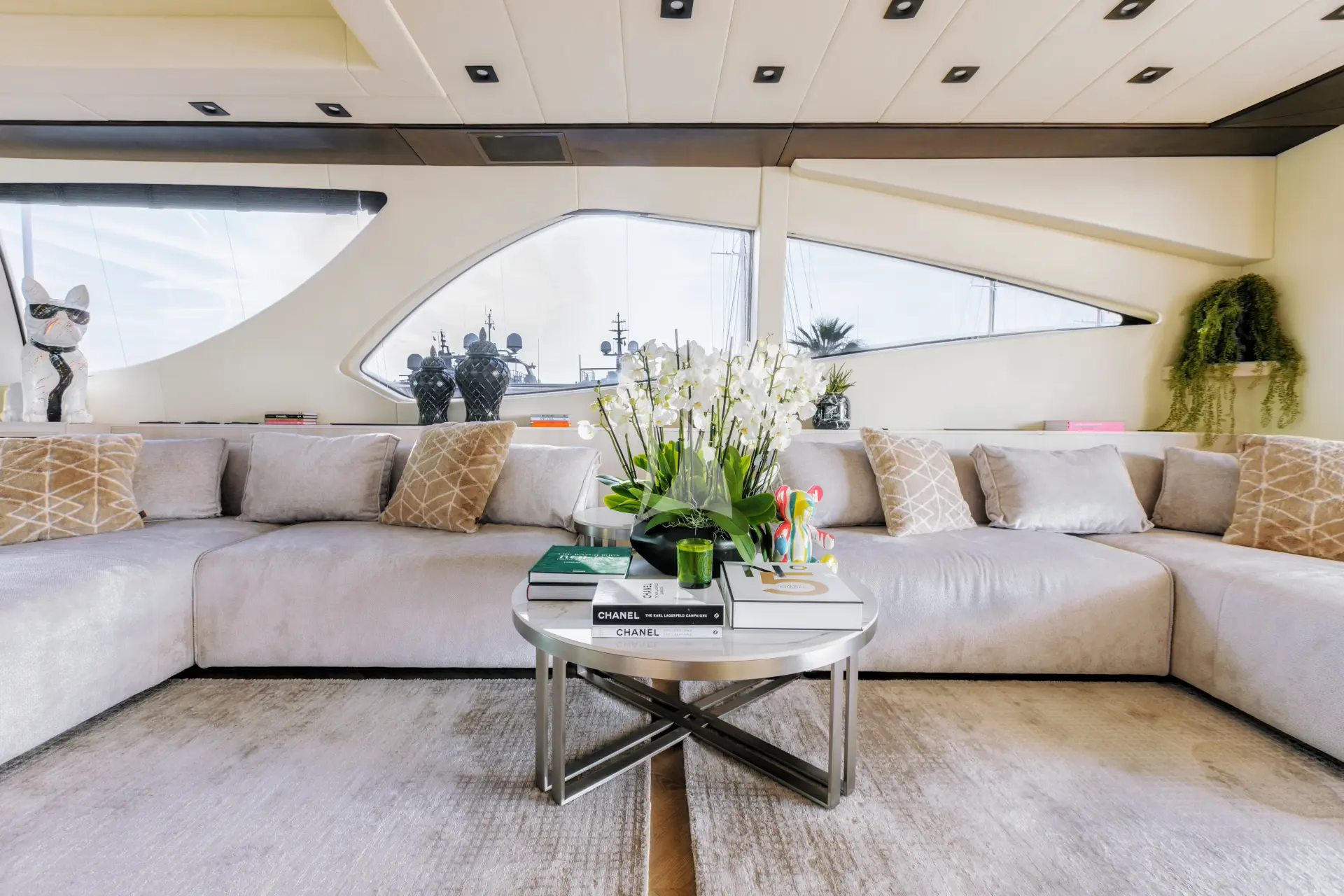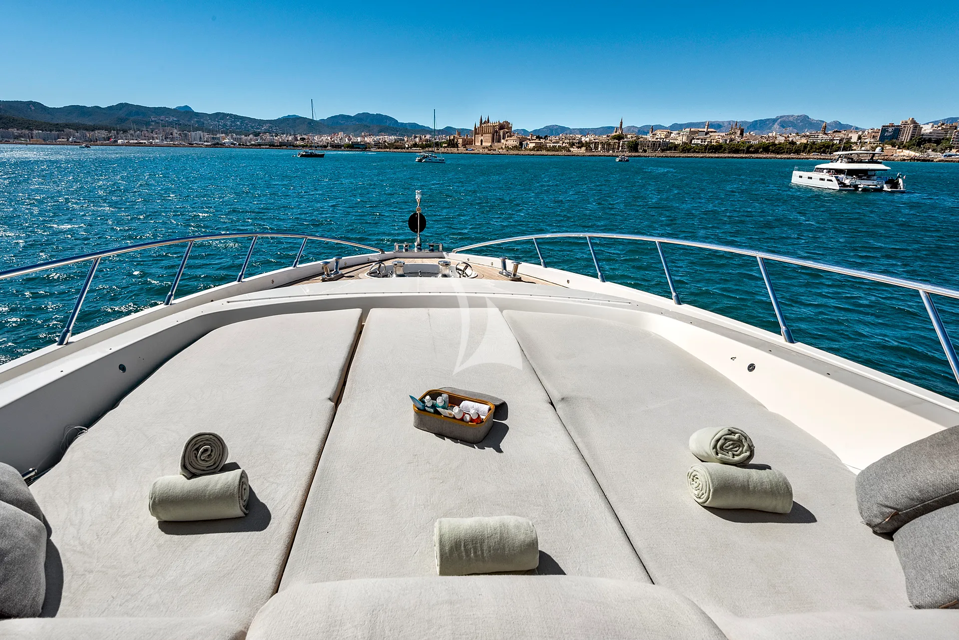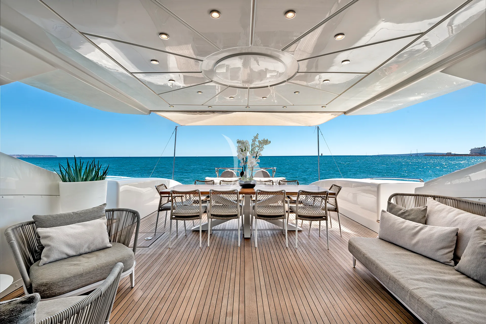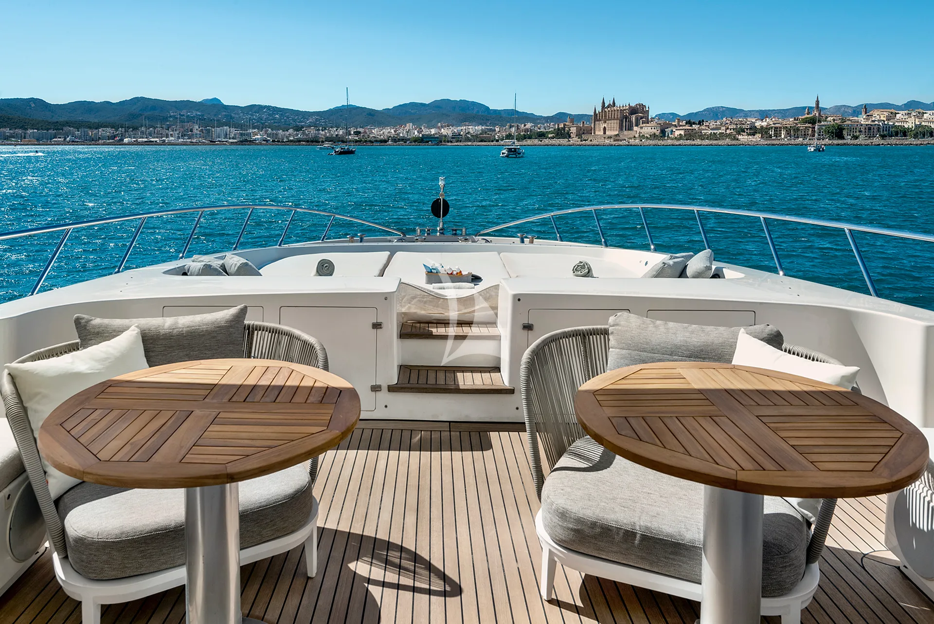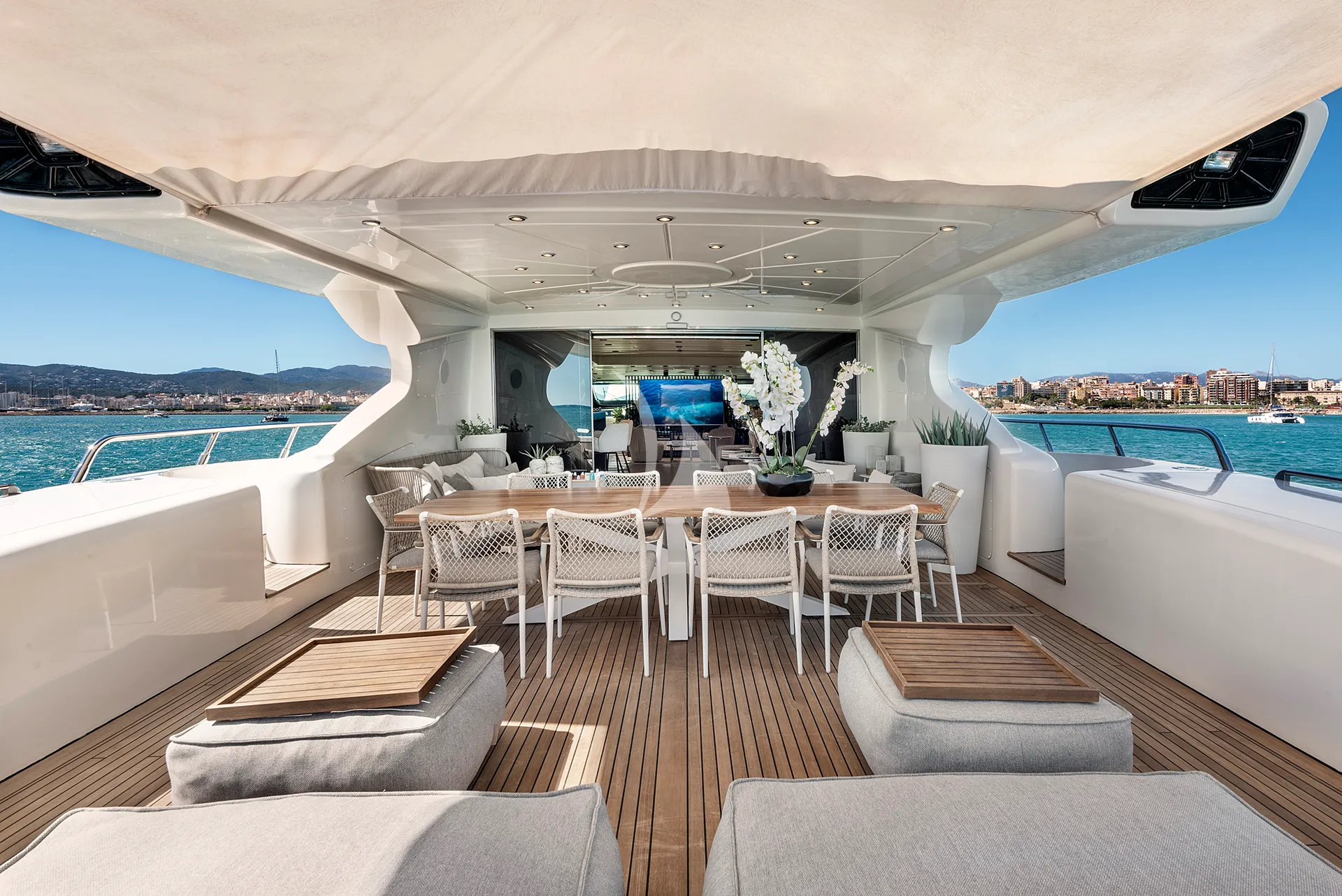 Her sleek exterior lines are perfectly matched by generous deck spaces designed for relaxation and entertainment. The aft deck offers a partially shaded lounge with a bar, an alfresco dining area, and spacious sunpads for soaking up the Mediterranean sun. Forward, additional sunpads and a comfortable seating area with a table provide an inviting setting to unwind or enjoy cocktails while taking in panoramic sea views.