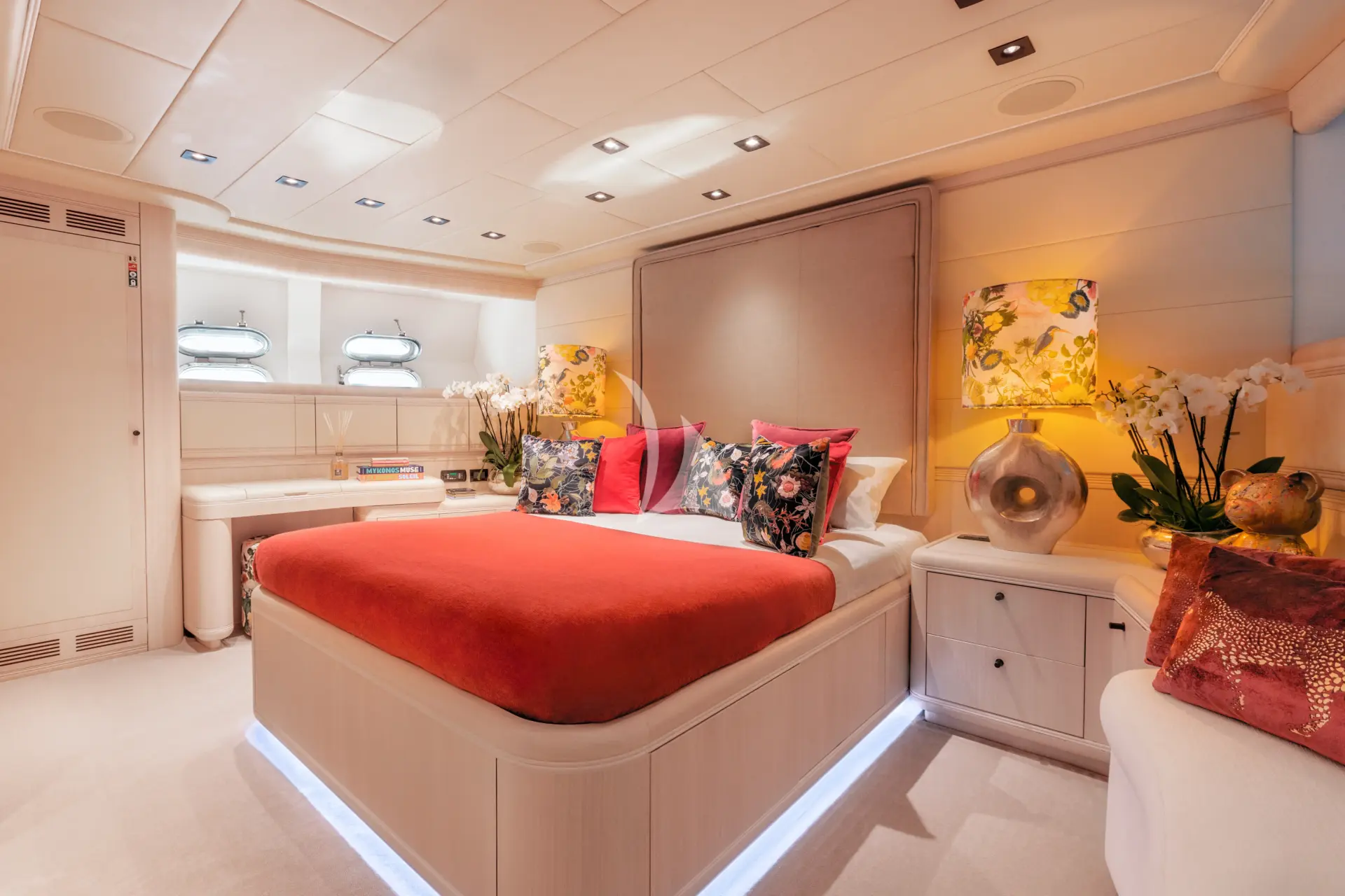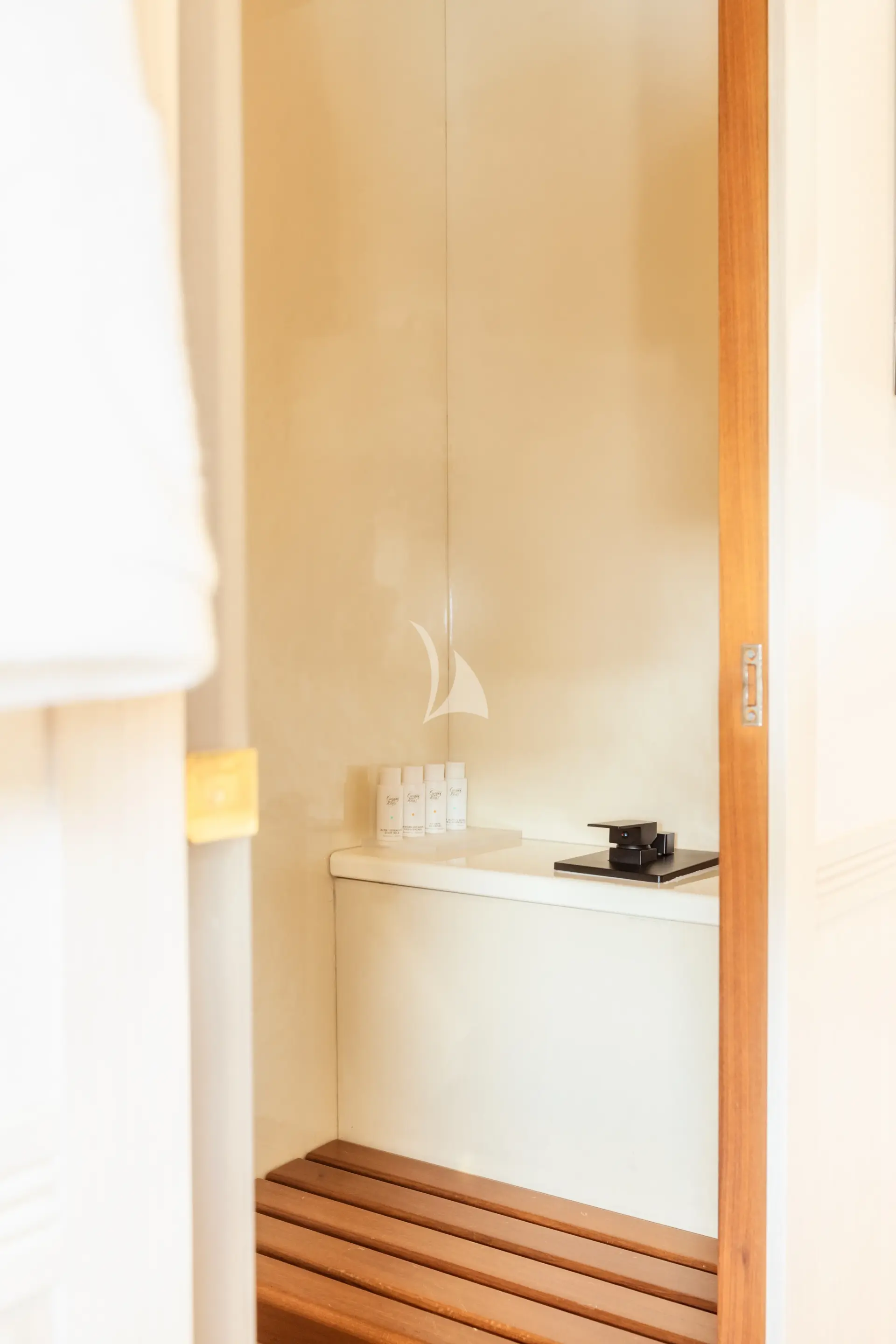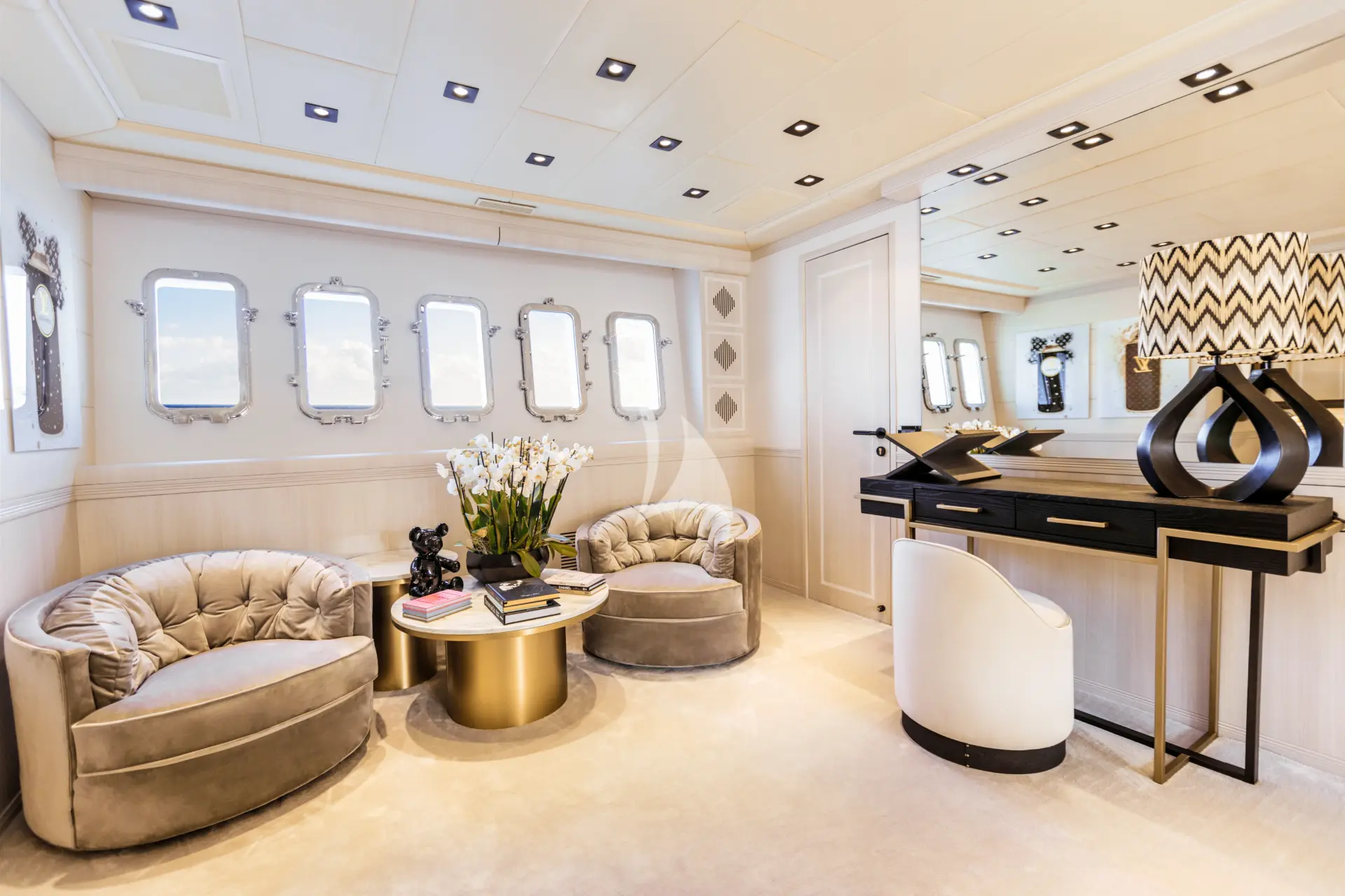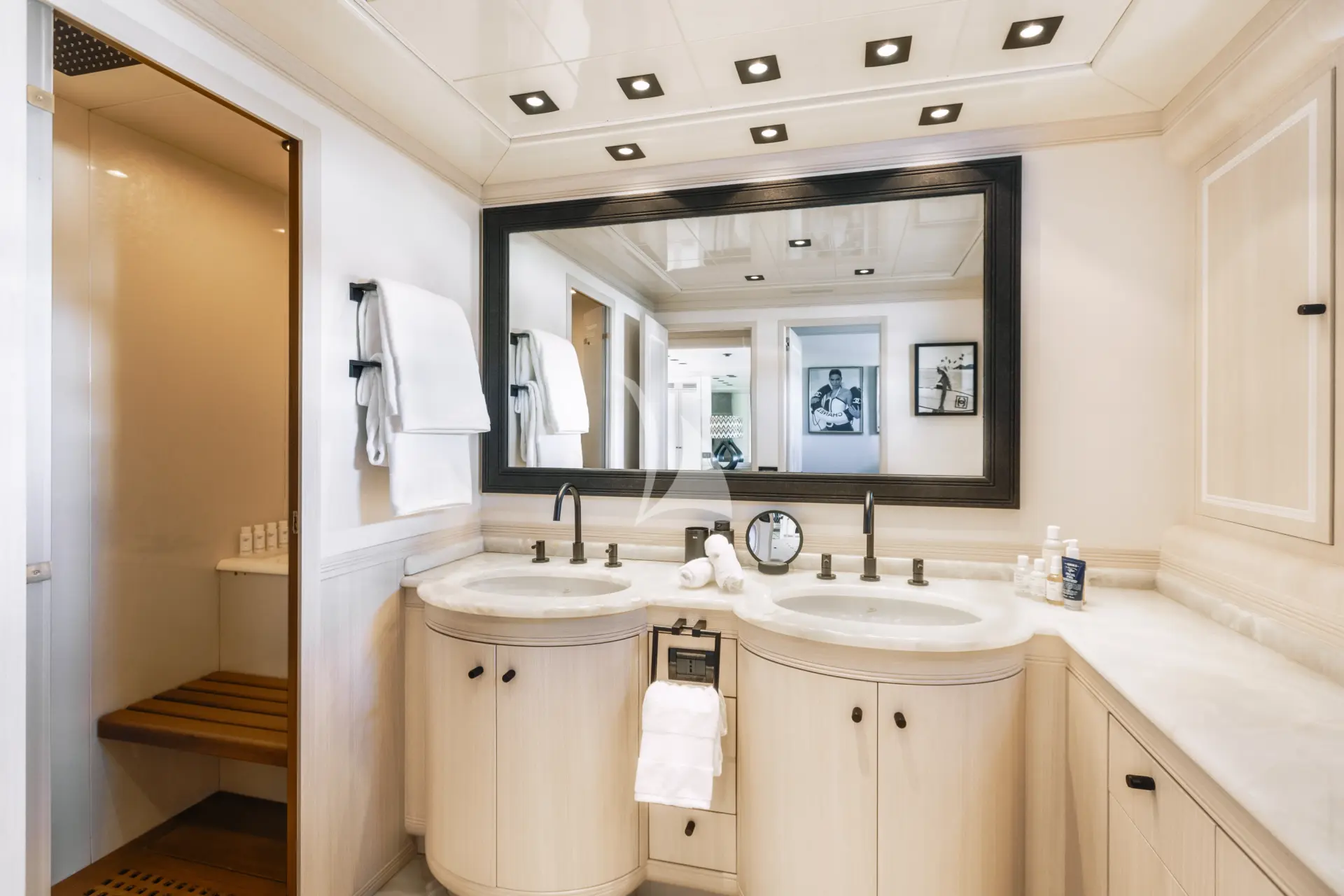 MRS GREY accommodates up to 11 guests in up to 5 cabins. The layout includes a spacious owner’s suite along with three additional guest staterooms. A convertible lower-deck movie room offers added flexibility, featuring a single sofa bed with the option to add a second mattress to create a twin arrangement. Although designed as an open-plan space with Japanese panel screens for privacy, it includes its own WC and sink and shares a shower with an adjacent cabin.
