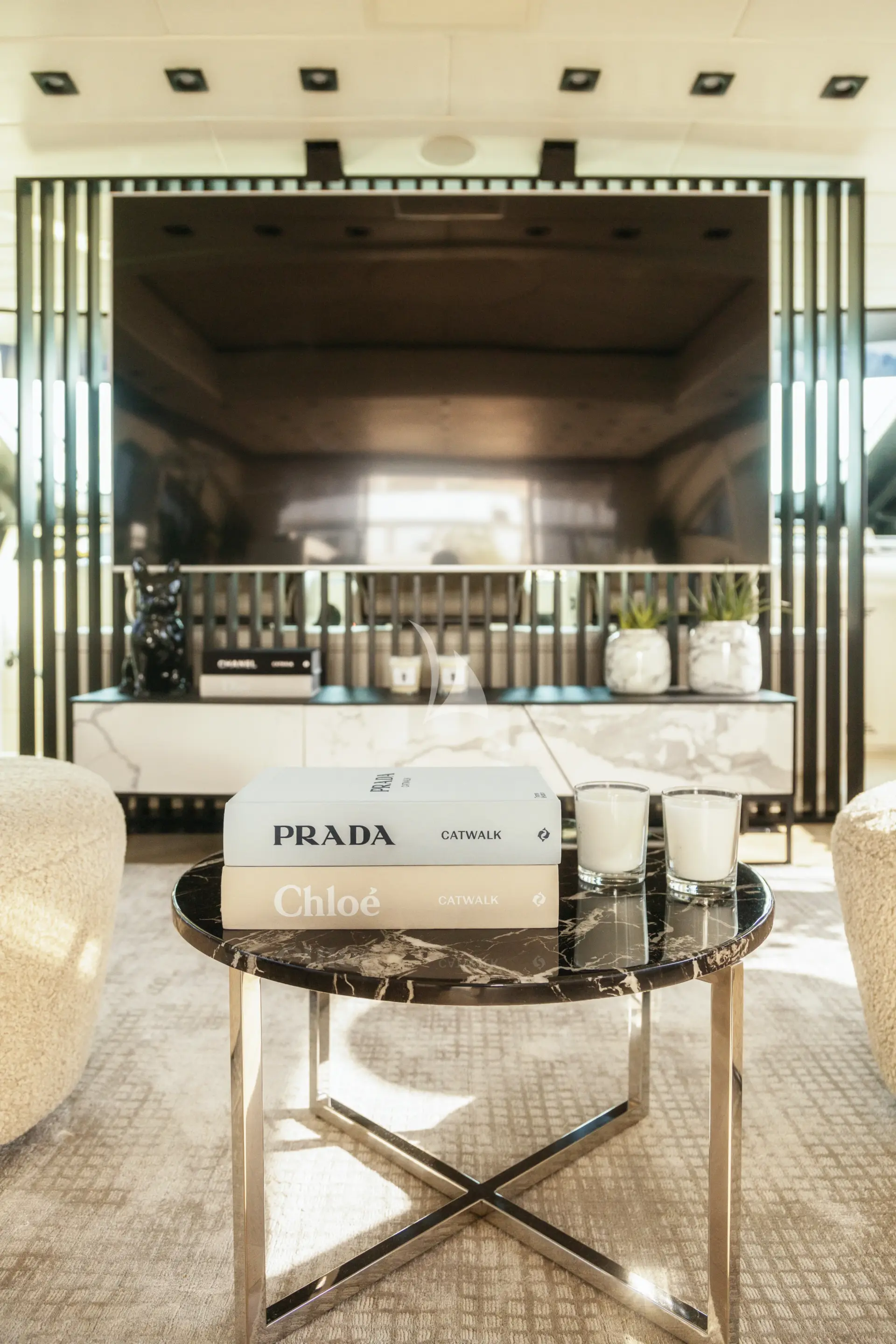 Inside, guests are welcomed into a serene and refined interior where a neutral palette is enhanced by elegant accents and soft, feminine details. The main salon and dining area are bright and inviting, featuring natural textures, contemporary furnishings, and abundant natural light, creating a sophisticated yet relaxed atmosphere throughout.