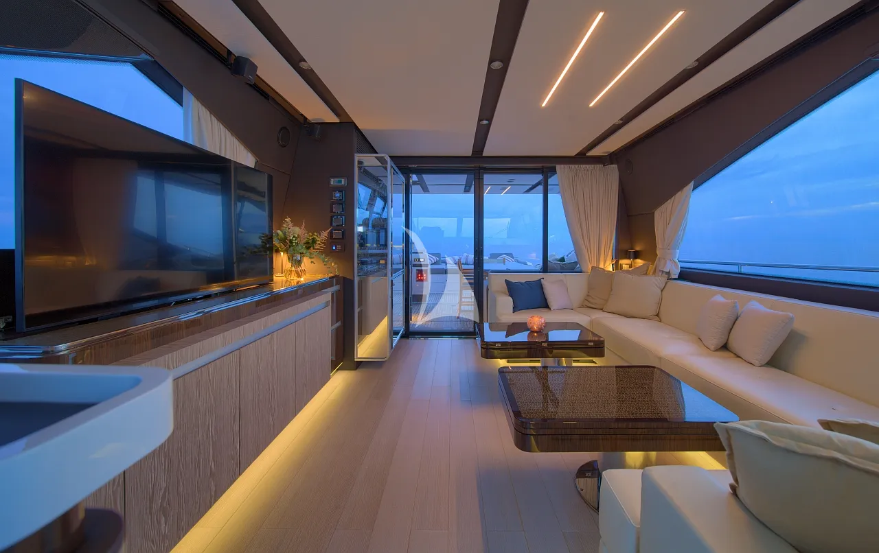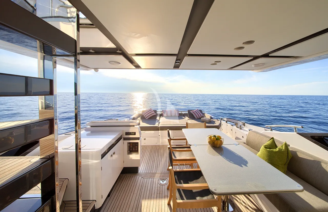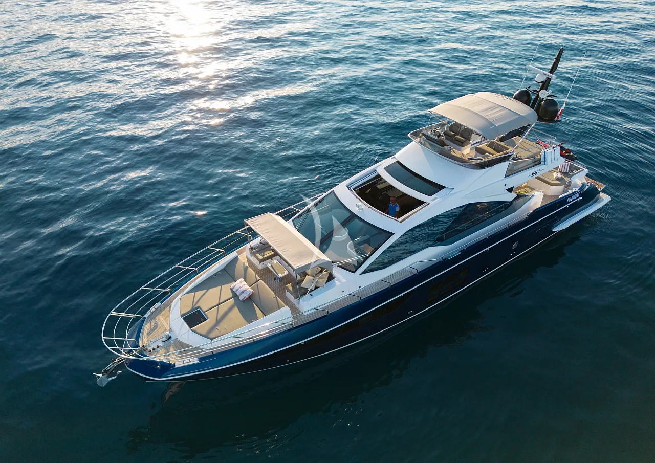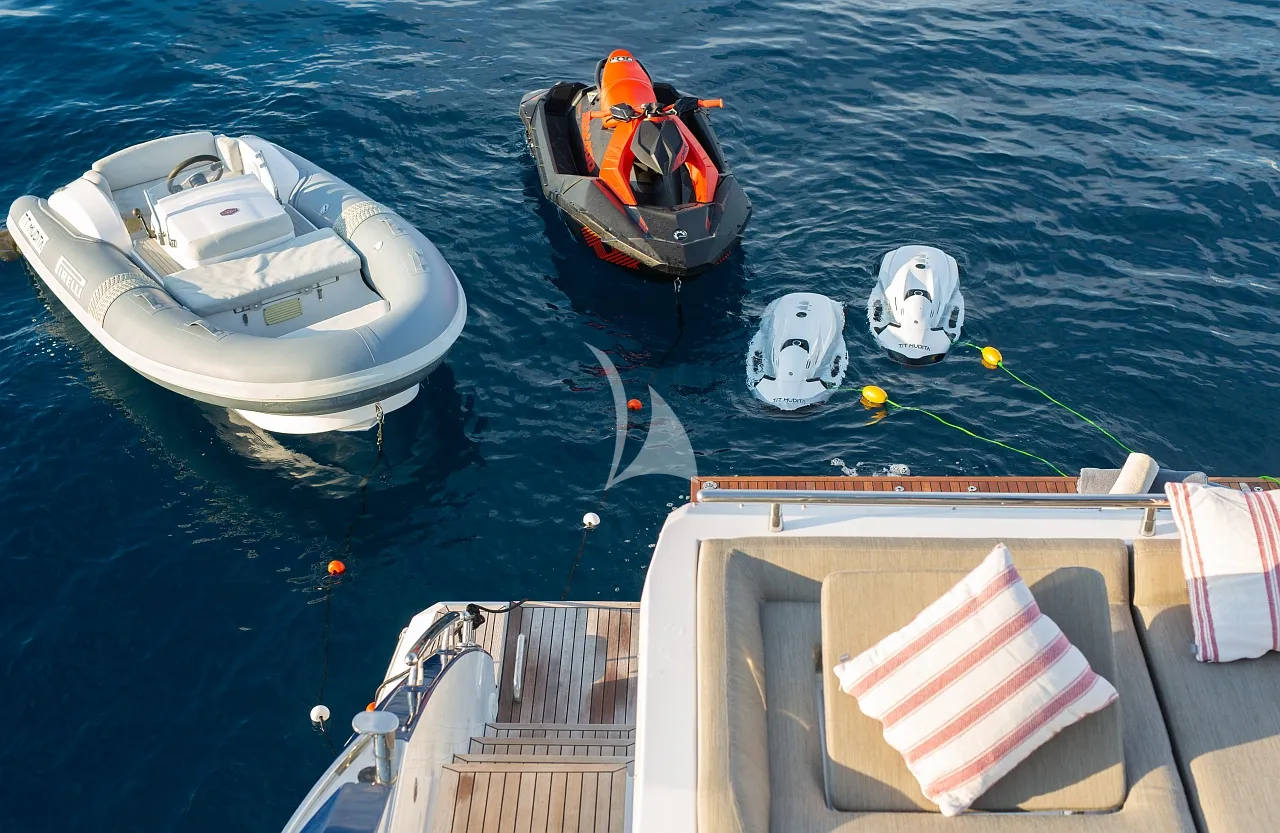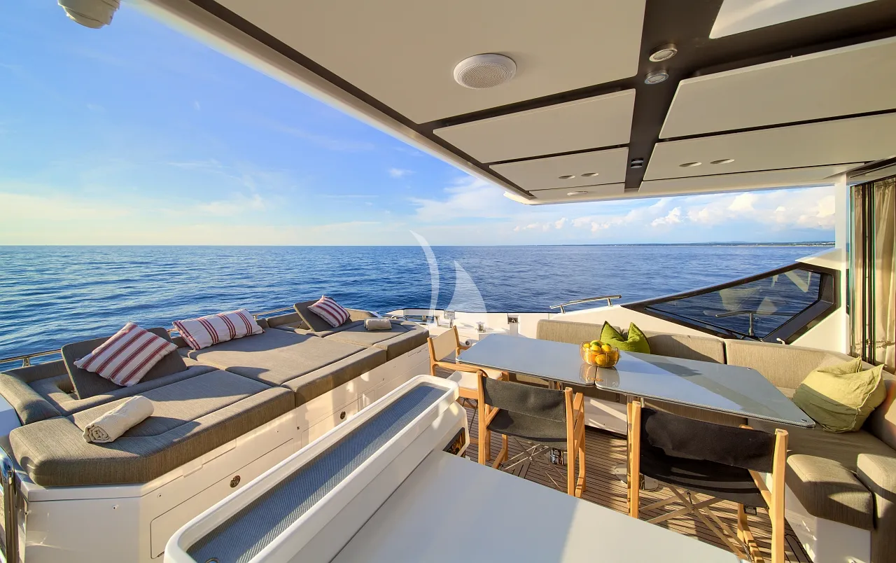 Outdoors, Mudita truly shines. The spacious flybridge and foredeck offer generous areas for sunbathing and relaxation, while the aft deck is ideal for alfresco dining with breathtaking coastal backdrops. The teak-clad swim platform creates effortless access to the sea and an exciting selection of water toys, enhancing every moment on the water. A Seakeeper stabilizer guarantees smooth cruising, even in open waters.