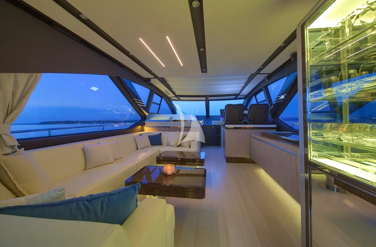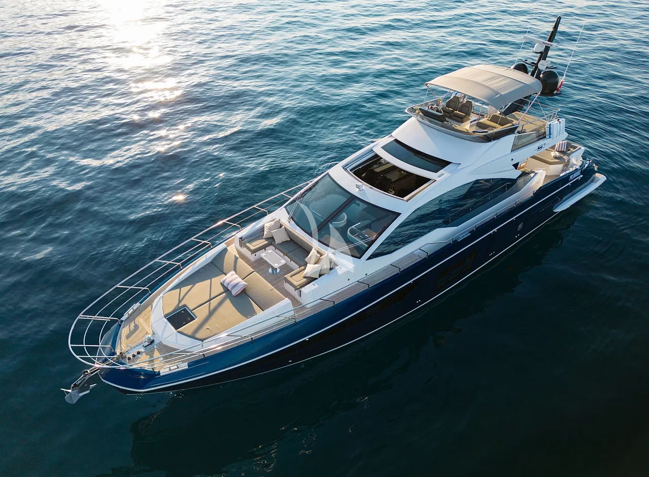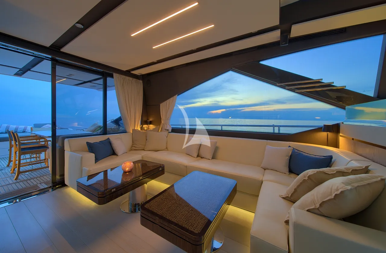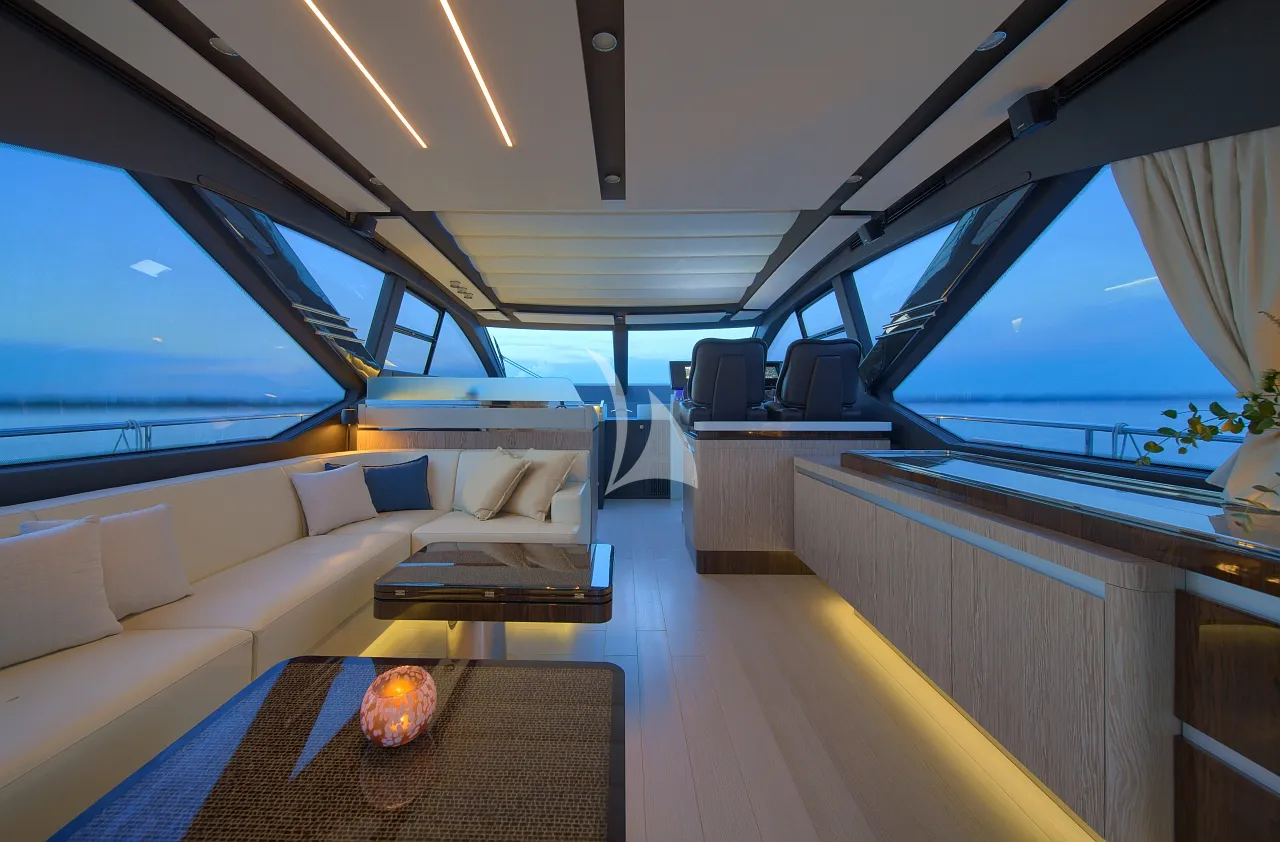 Outdoors, Mudita truly shines. The spacious flybridge and foredeck offer generous areas for sunbathing and relaxation, while the aft deck is ideal for alfresco dining with breathtaking coastal backdrops. The teak-clad swim platform creates effortless access to the sea and an exciting selection of water toys, enhancing every moment on the water. A Seakeeper stabilizer guarantees smooth cruising, even in open waters.