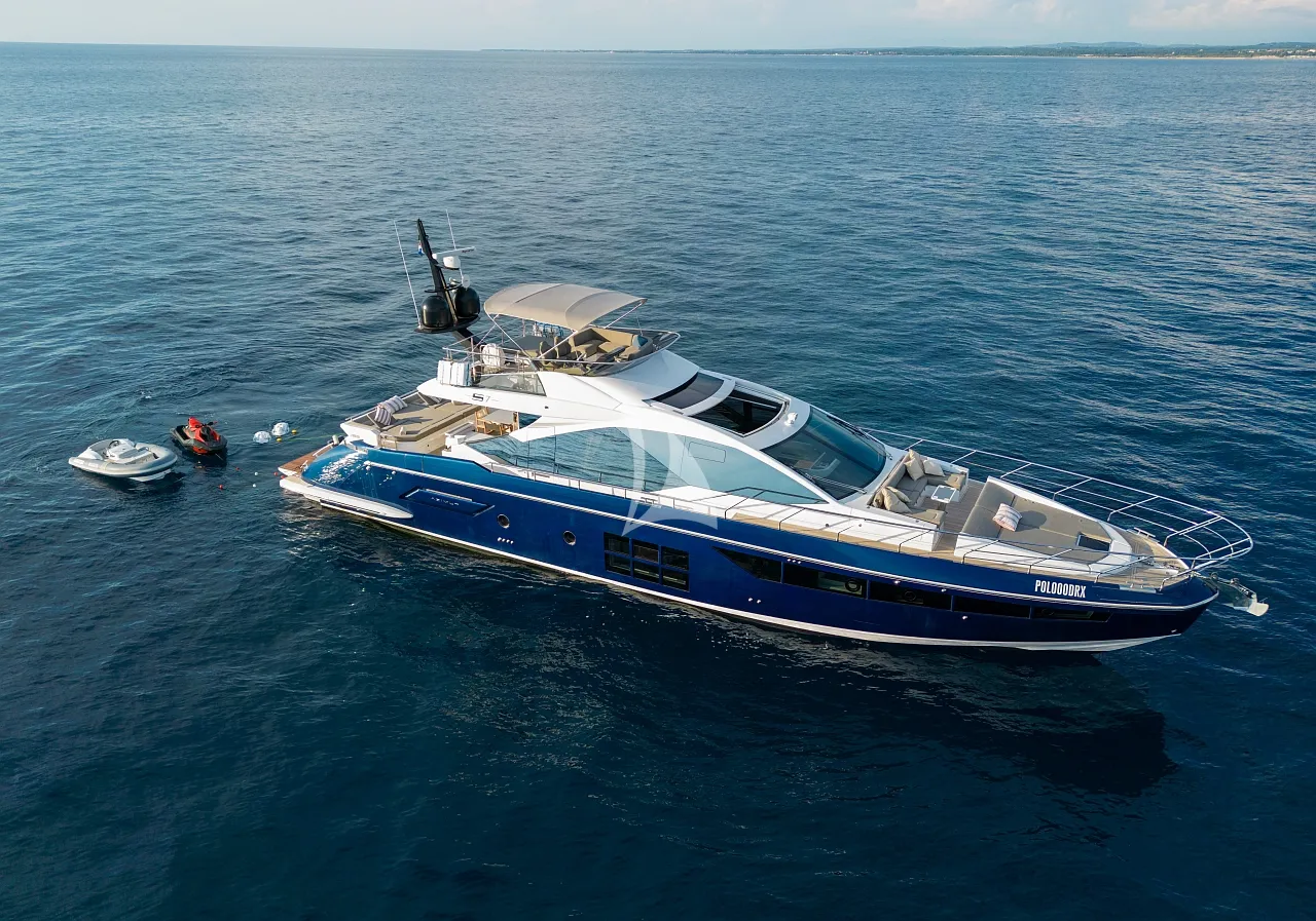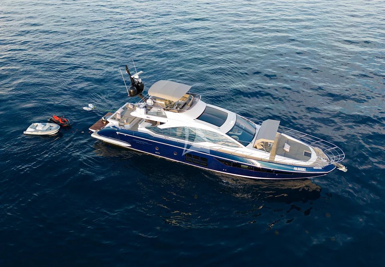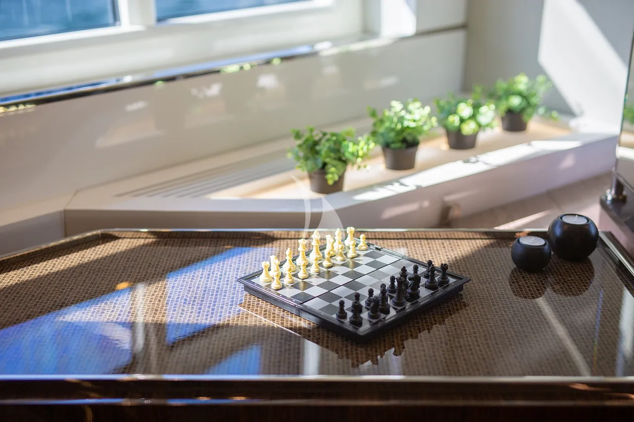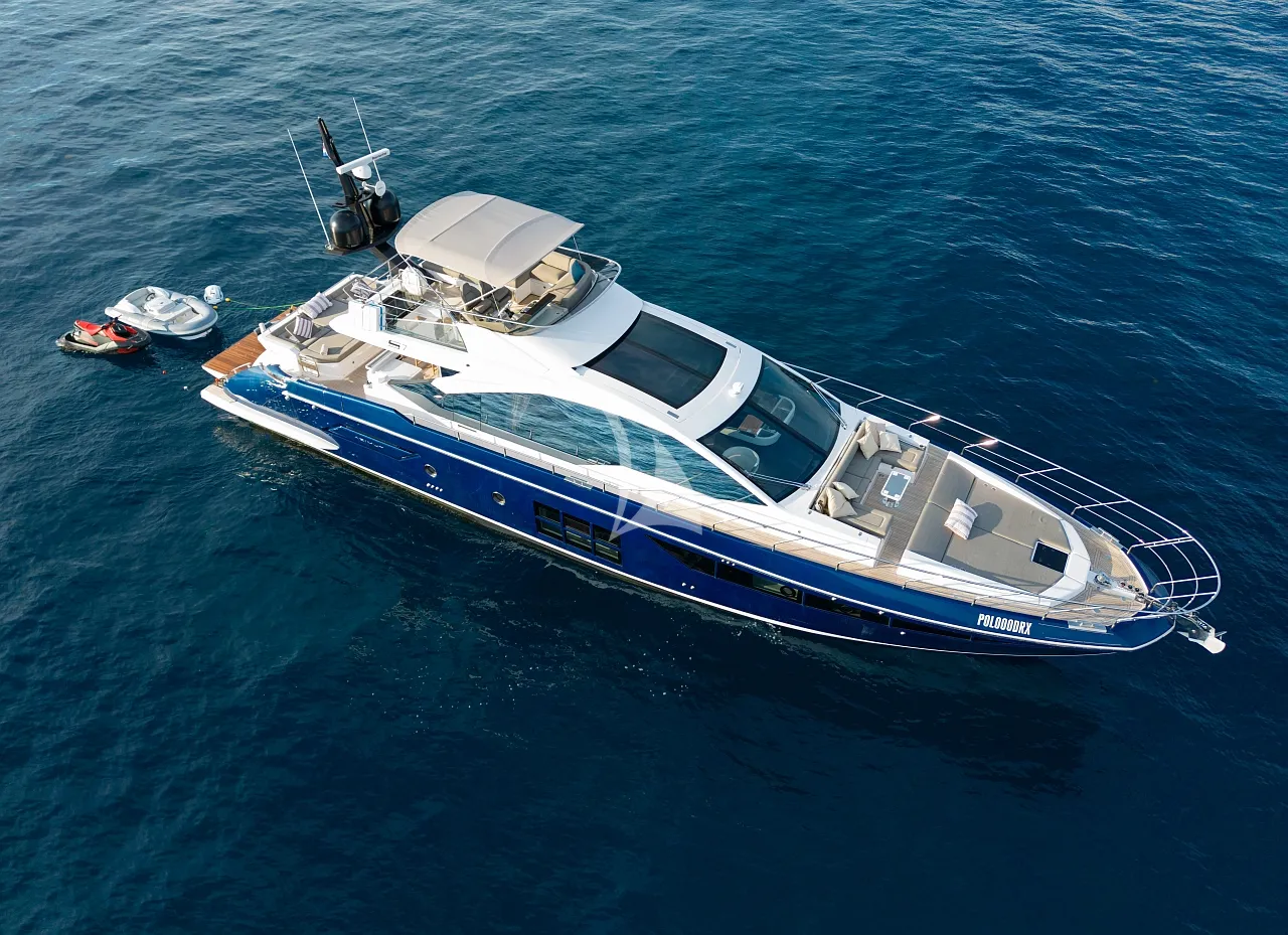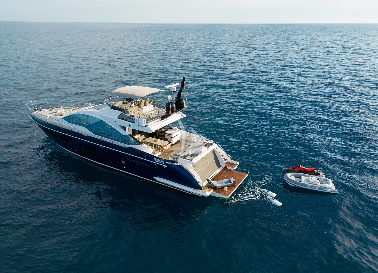 Outdoors, Mudita truly shines. The spacious flybridge and foredeck offer generous areas for sunbathing and relaxation, while the aft deck is ideal for alfresco dining with breathtaking coastal backdrops. The teak-clad swim platform creates effortless access to the sea and an exciting selection of water toys, enhancing every moment on the water. A Seakeeper stabilizer guarantees smooth cruising, even in open waters.