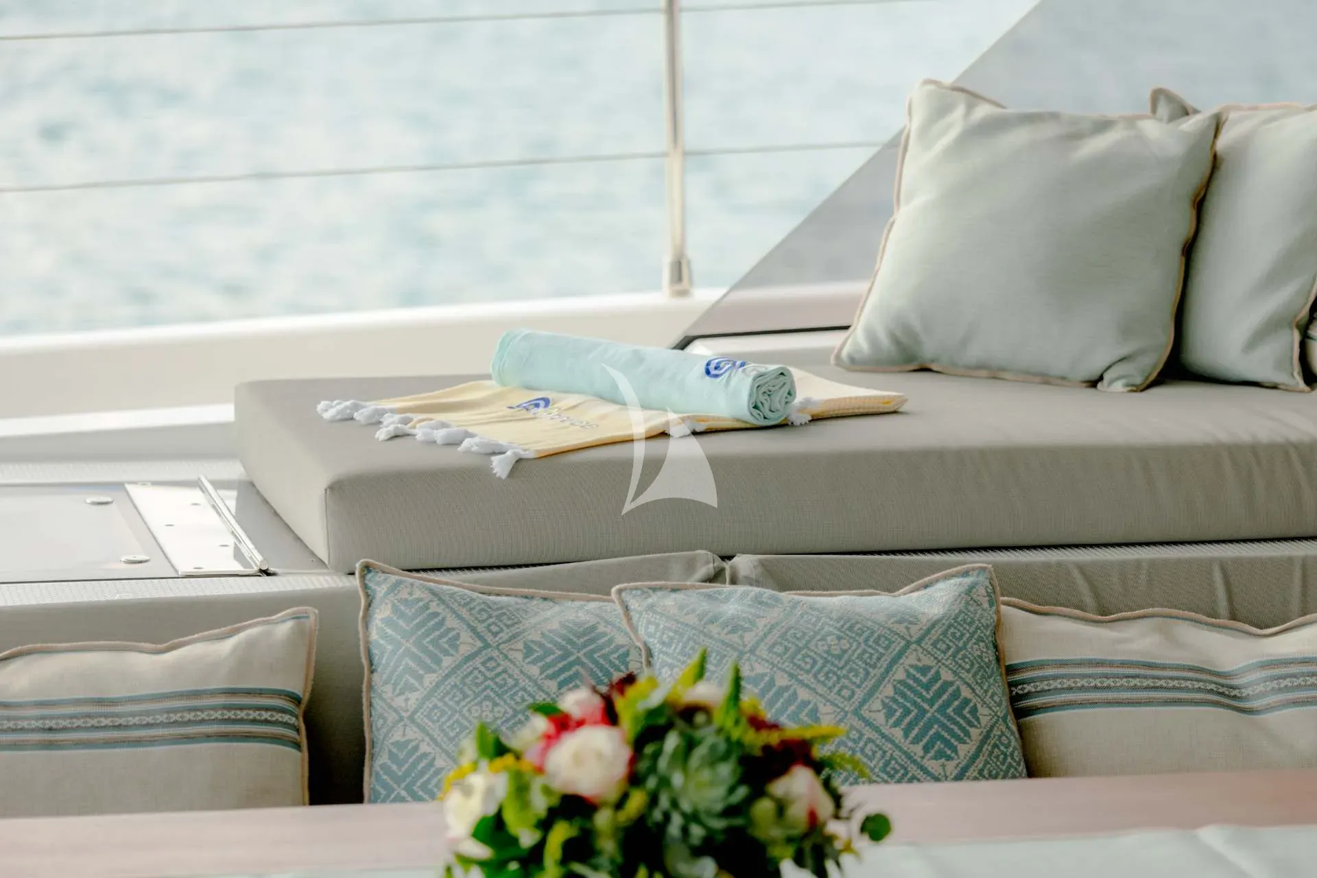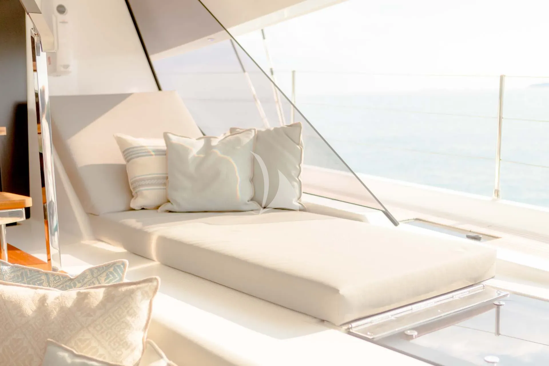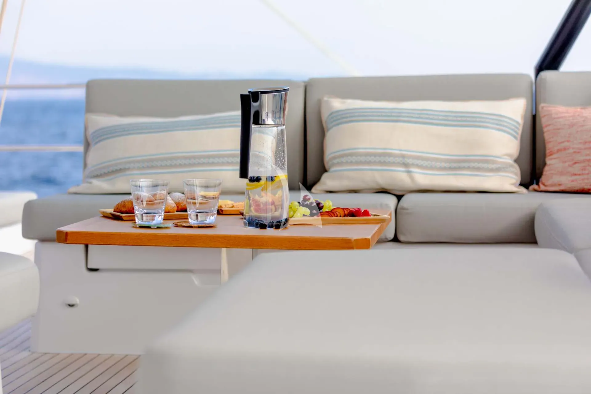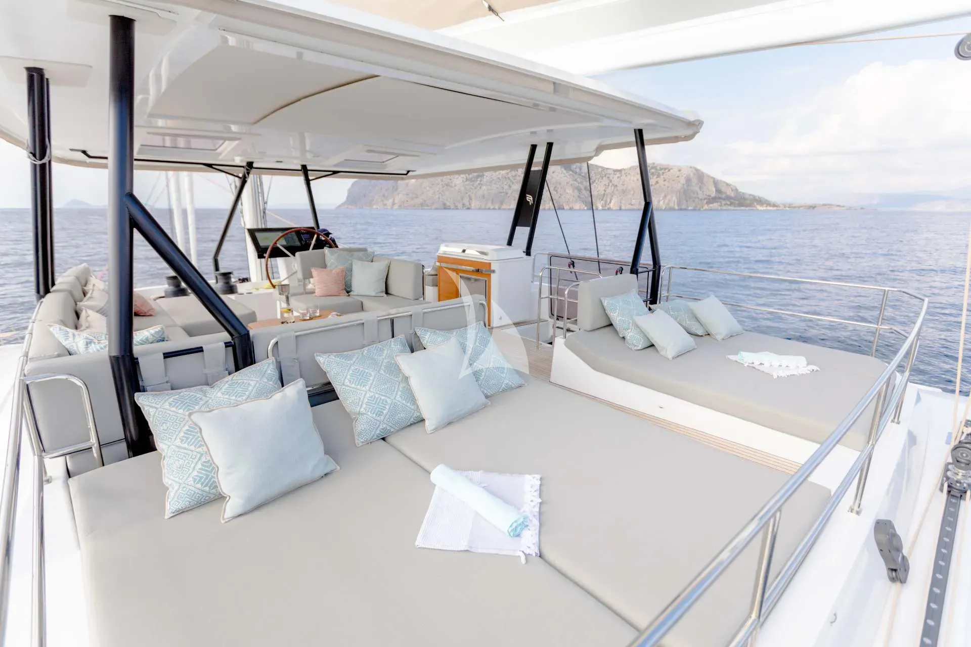Every detail of Namaste has been carefully crafted to deliver both connection and tranquility. Her expansive 27.5m² aft cockpit sets the scene for relaxed dining and social gatherings, while the foredeck features modular sunbathing lounges, ideal for soaking up the sun or enjoying quiet moments under sail. The flybridge offers spectacular panoramic views — a perfect place for sunrise yoga, afternoon cocktails, or starlit dinners. Her bright and inviting main saloon, with access to both the aft and fore decks, enhances the feeling of openness and flow throughout the yacht. With a galley-down layout, guests enjoy a spacious and elegant living area designed for effortless comfort and togetherness.