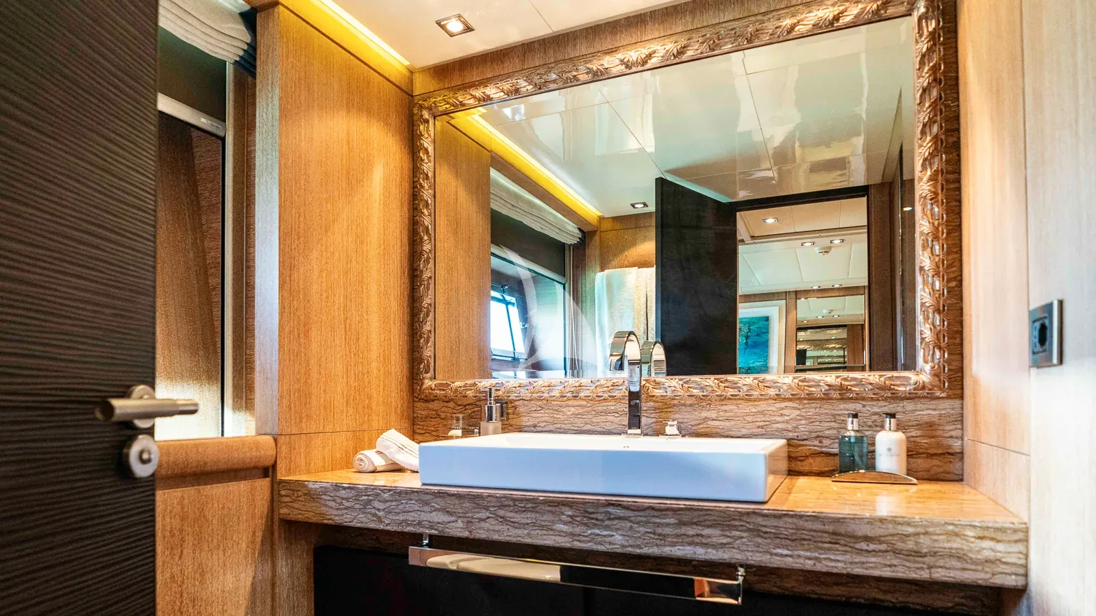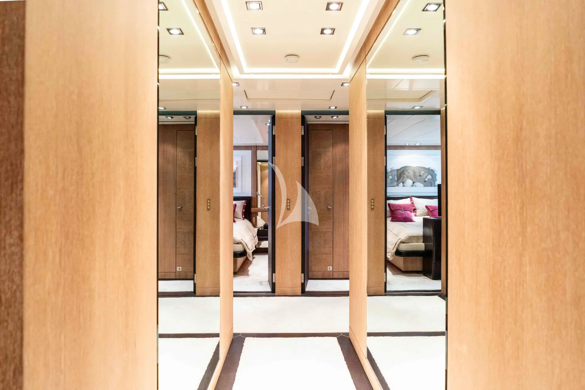 NINO’s accommodation layout is exceptionally versatile and generous. She features a twin cabin with a pullman bed on the main deck, ideal for families, along with a spectacular full-beam master cabin on the lower deck complete with a private office. Additionally, guests can enjoy two double cabins and one twin cabin on the lower deck, all offering privacy, comfort and en-suite facilities for a true hotel-level experience on the water.