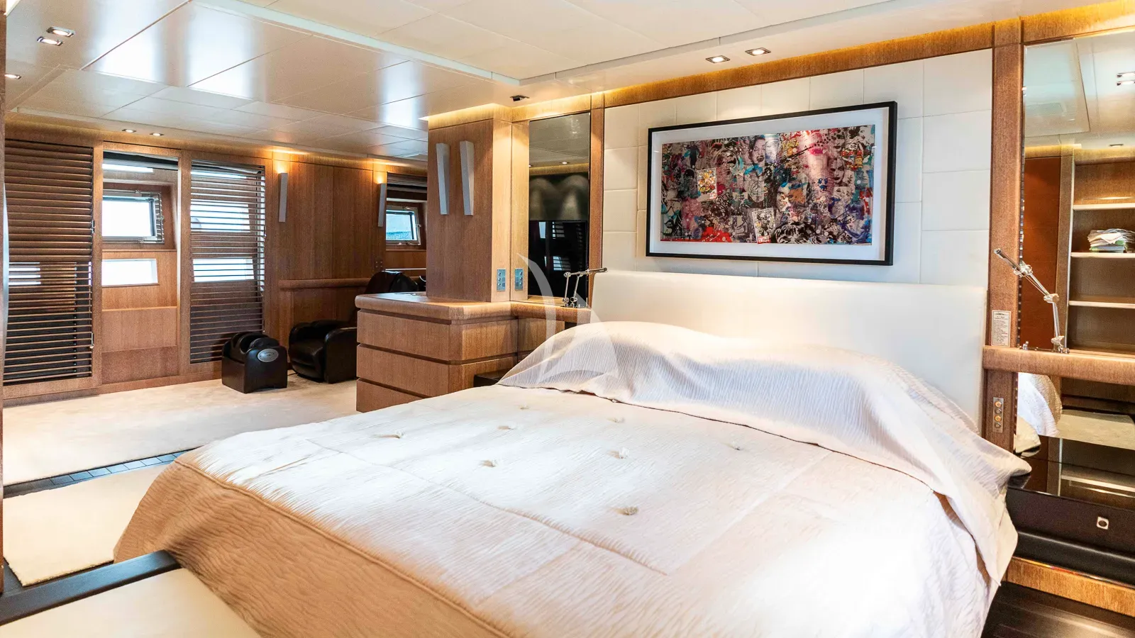 Comfort at anchor and underway is enhanced by zero-speed stabilizers, ensuring smooth cruising and exceptional stability even when stationary. Outdoor living is equally impressive, with expansive deck areas for sunbathing, lounging, and alfresco dining, complemented by a full-beam swim platform that provides effortless access to the sea and water toys.