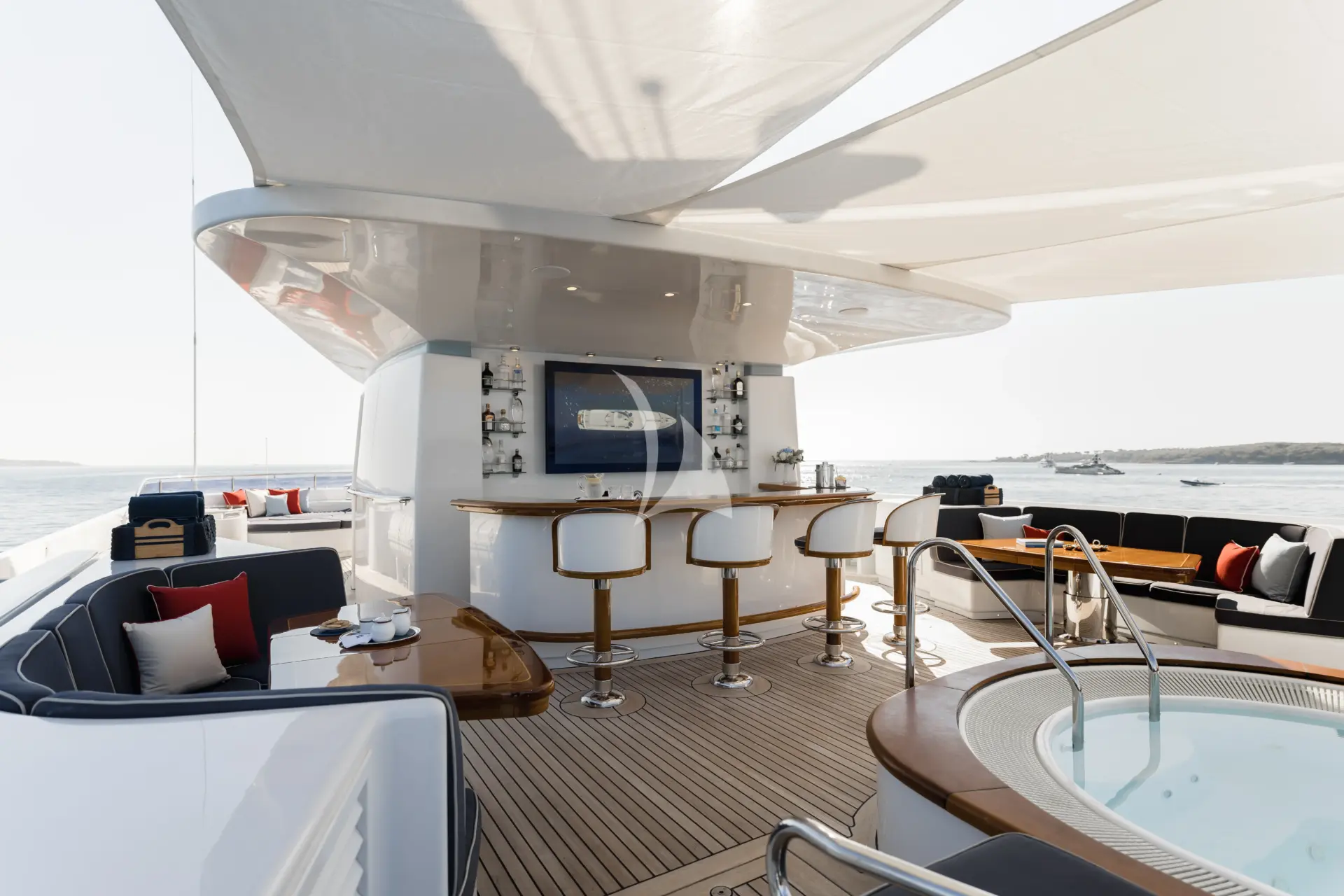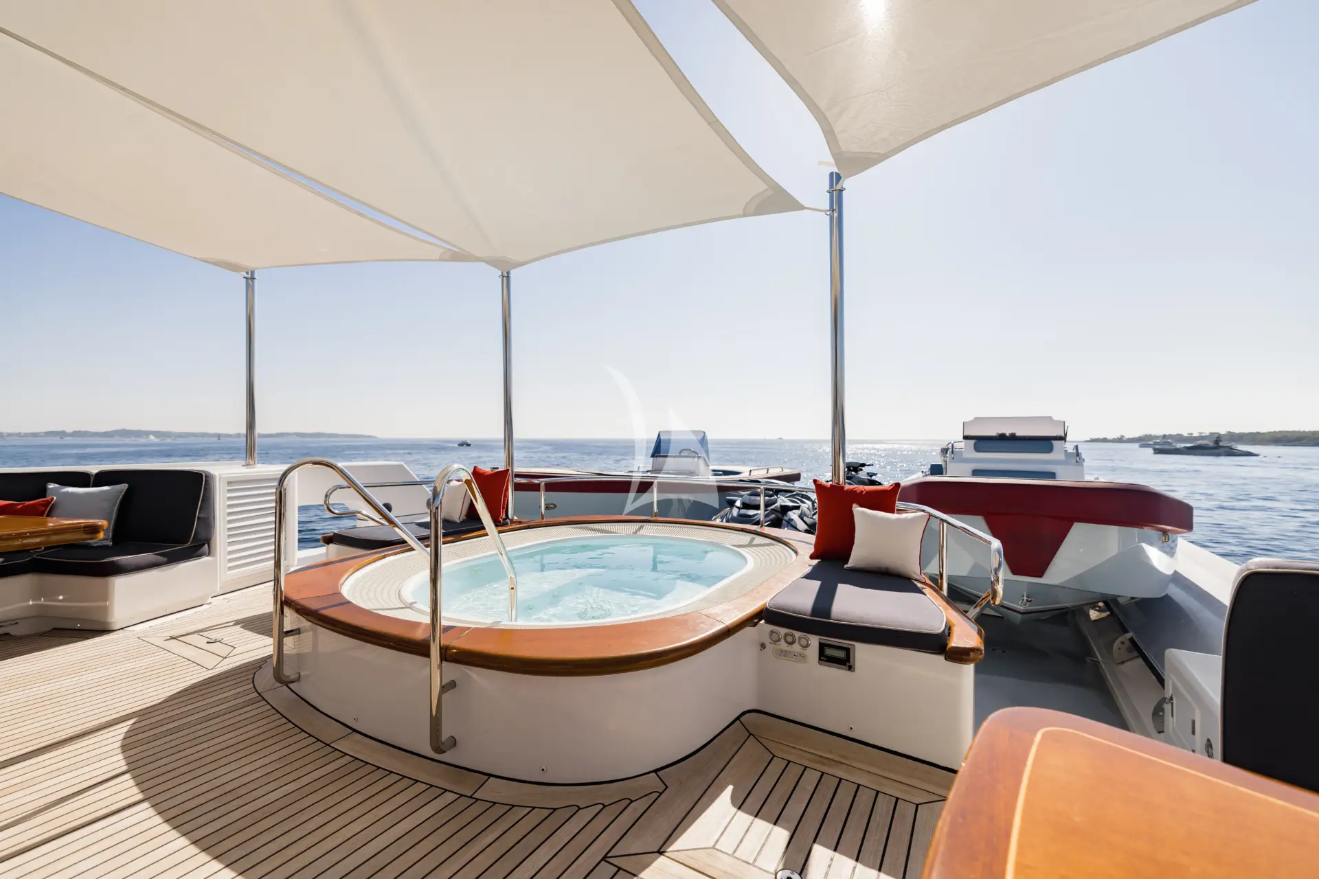 Twin staircases lead down to the integral swim platform, complete with removable stainless-steel handrails, swim ladder, and freshwater shower. Water toys include 1 x Sea-Doo GTX LTD 300 (2021), 2 x SeaBobs F5 SR (2022), 2 x inflatable paddleboards, adult and children’s water skis, and 1 x wakeboard with interchangeable bindings. For diving enthusiasts, OLYMPUS offers 6 x scuba diving tanks (new 2023) and a Bauer diving compressor (300 bar). Guests can also enjoy a variety of inflatables including a Jobe Swath, Jobe Hotseat, Jobe Airstream, and an Airhead Jumbo Dog. Additional water and beach fun is provided with a rectangular stern pontoon, fishing equipment, and a selection of beach games and beach set-up gear, ensuring endless enjoyment both on the water and ashore.r. For smooth transport ashore, OLYMPUS offers a 14.6m XO EXPLR 44 Chase Boat with Captain, a 5.8m RIB Tender, and an Imar 520 Inflatable RIB with 100hp outboard.