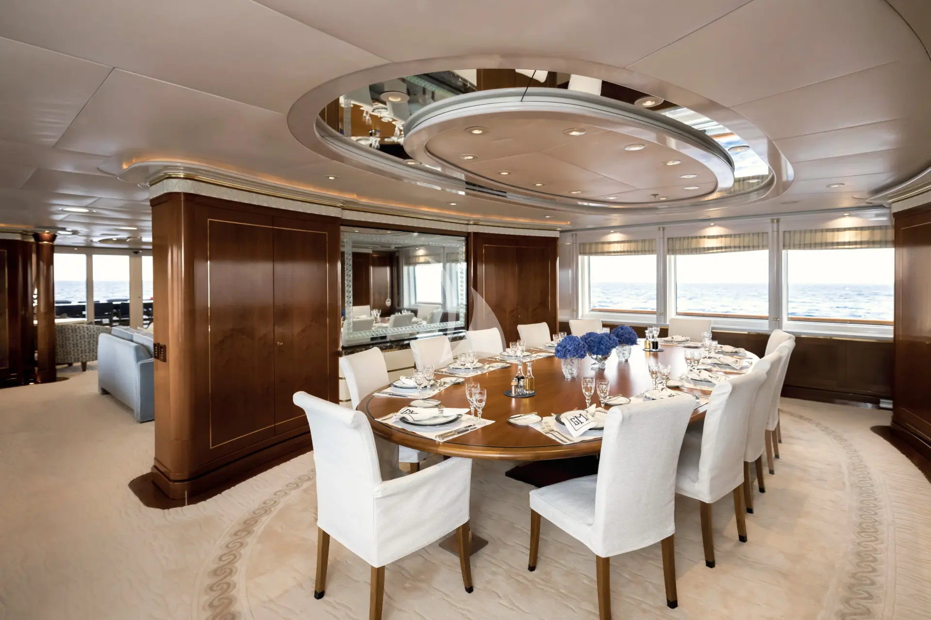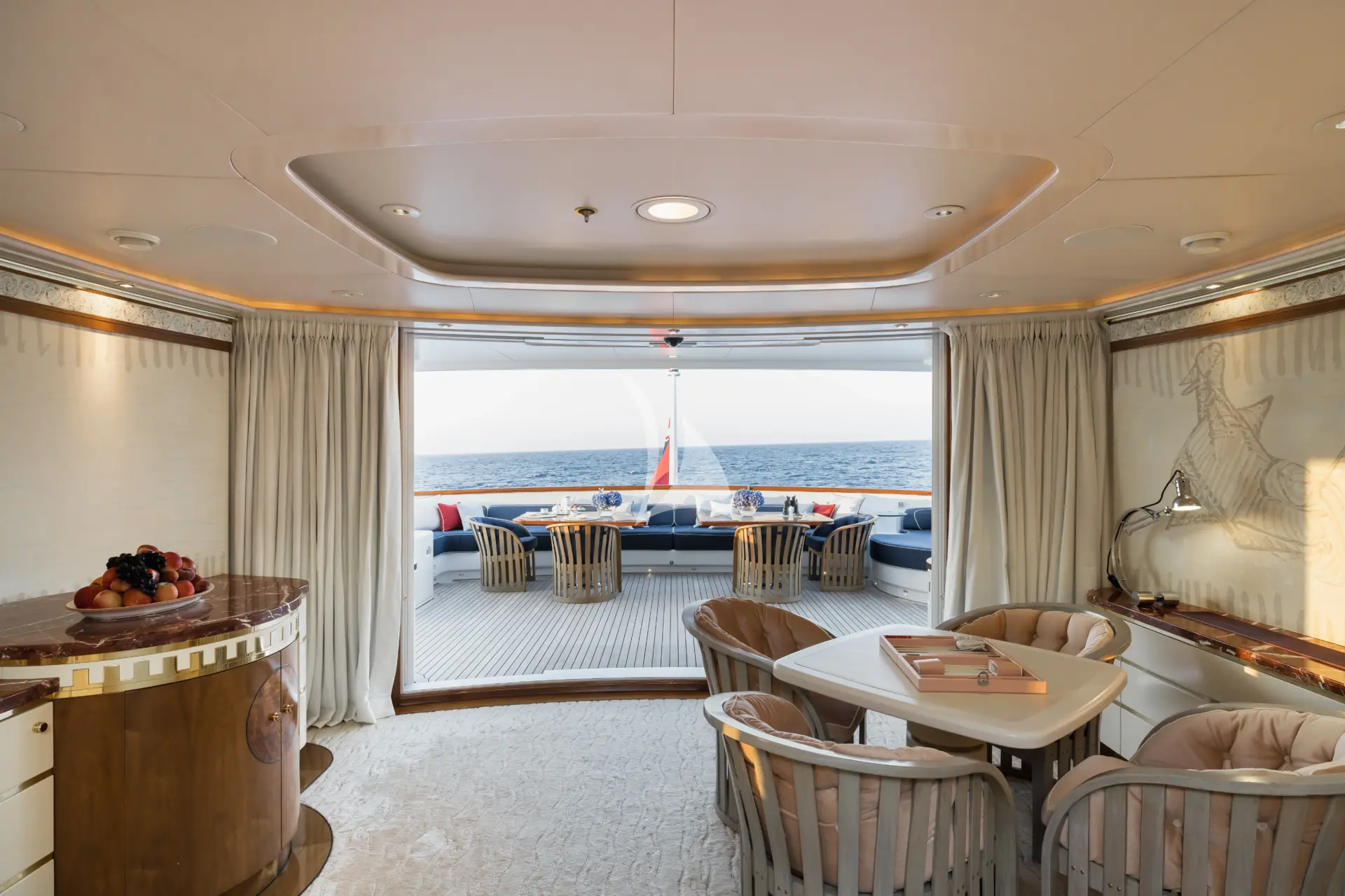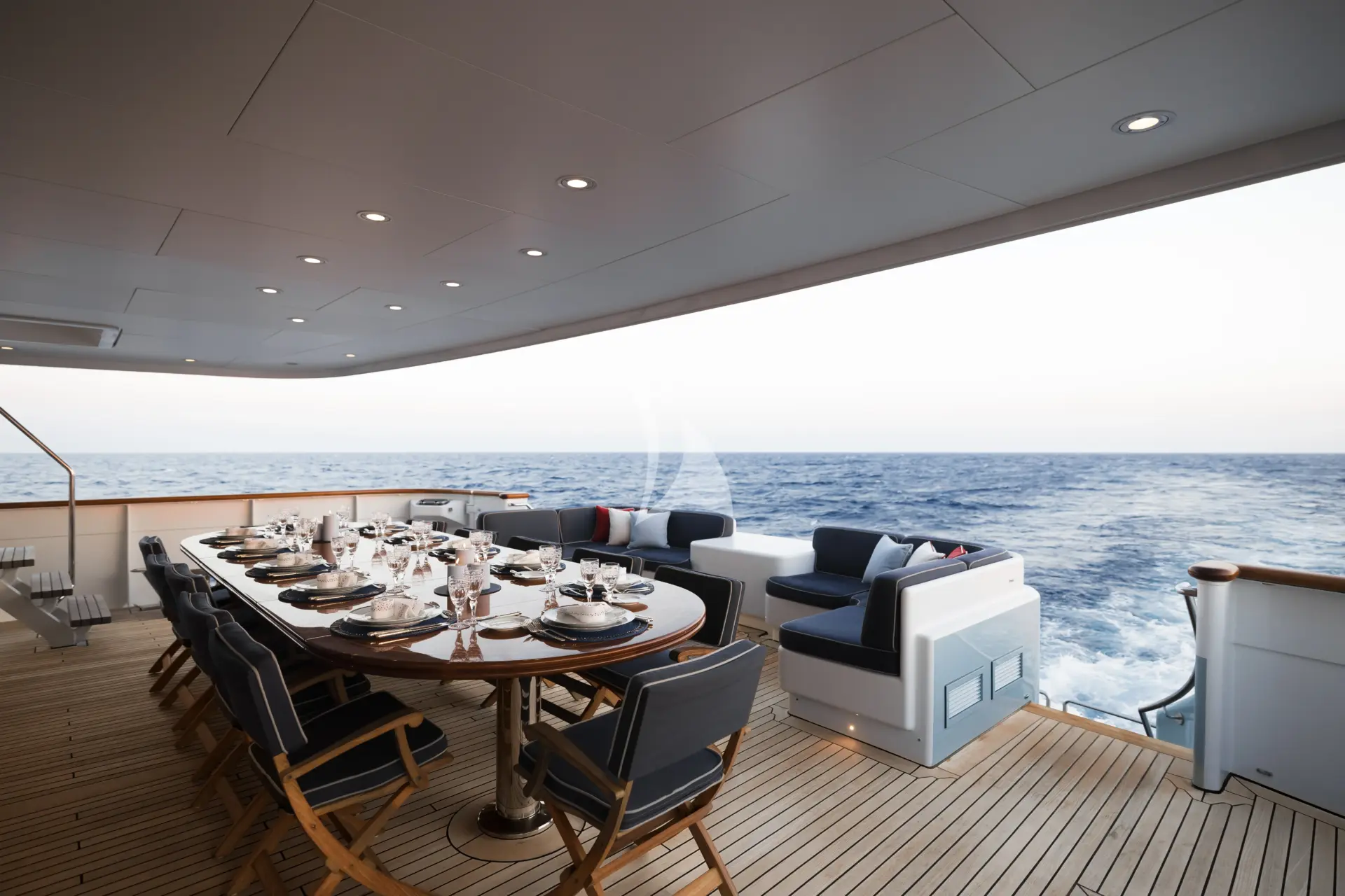 With tenders launched, the aft section of the sundeck transforms into a gym or open-air cinema — an extraordinary multi-purpose space equally suited to energetic days or relaxed evenings under the stars. For quieter moments, the upper and main deck exterior areas offer private dining and lounging away from the main social flow. More formal occasions are equally well catered for, with indoor and outdoor dining for up to 12 guests.