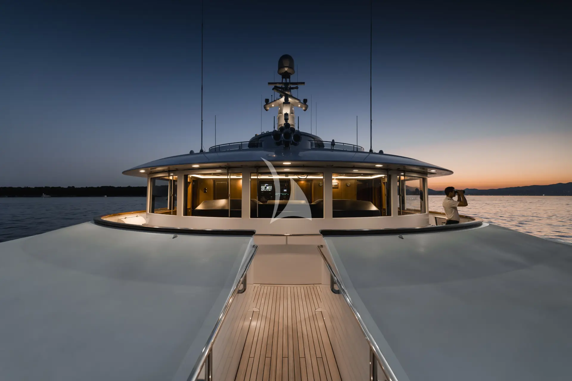 The VIP cabin, located on the upper deck, can function as a completely private VIP apartment or second master cabin, with the bridge deck lounge and aft deck able to be closed off for exclusive use. The lower deck houses six additional guest cabins: two doubles, two twins with Pullman berths, and two single cabins, ideal for children, staff, or nannies. Guests are attended by a highly professional crew of 16, and an elevator serves all decks, including the sundeck.