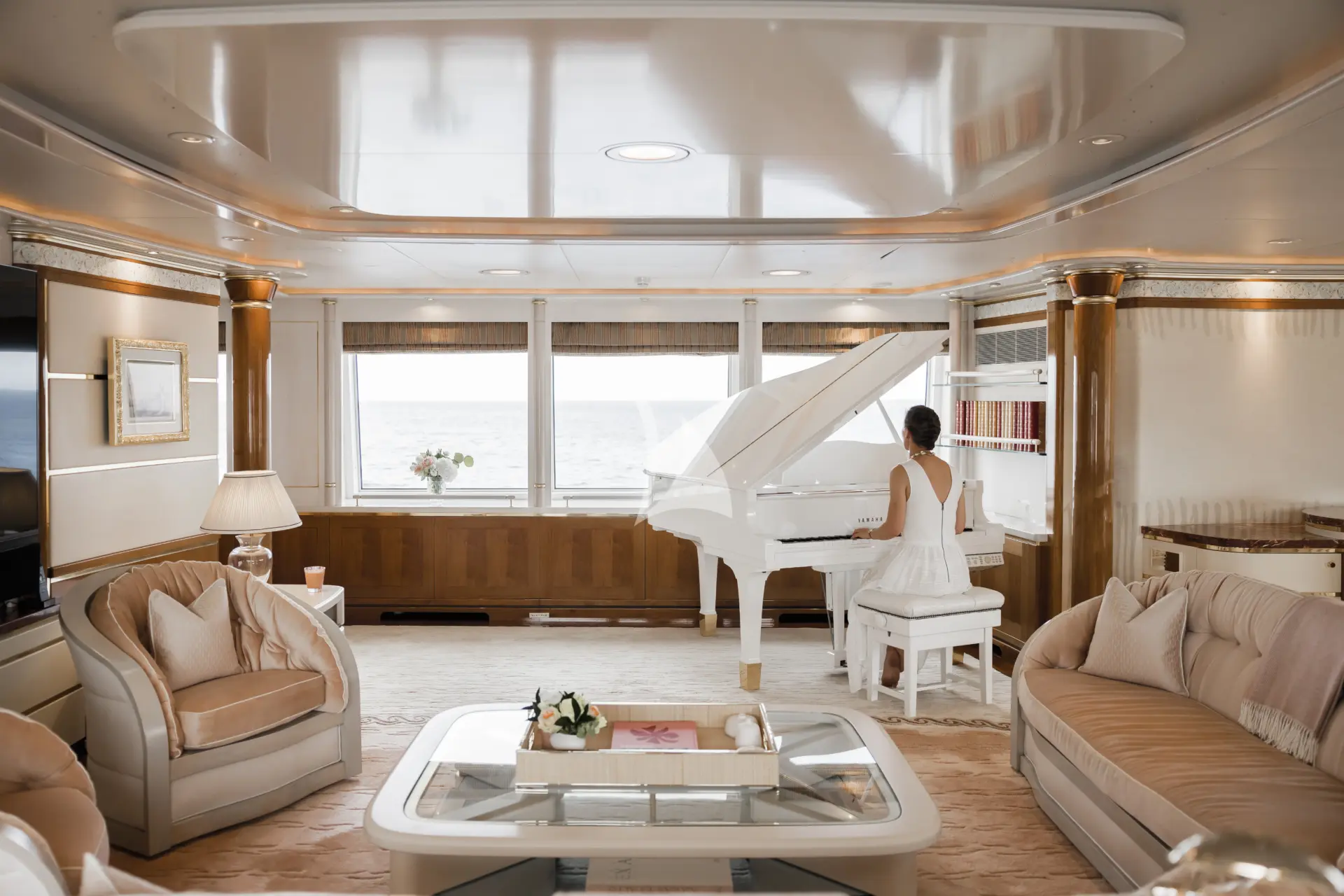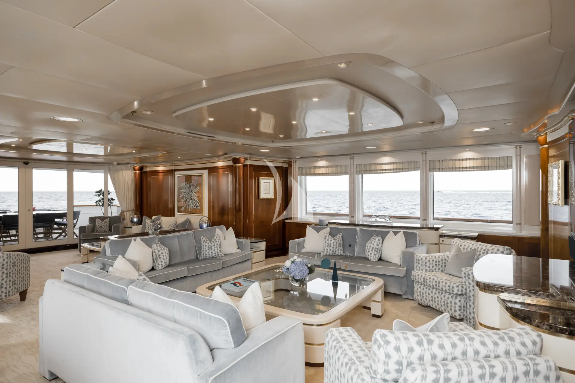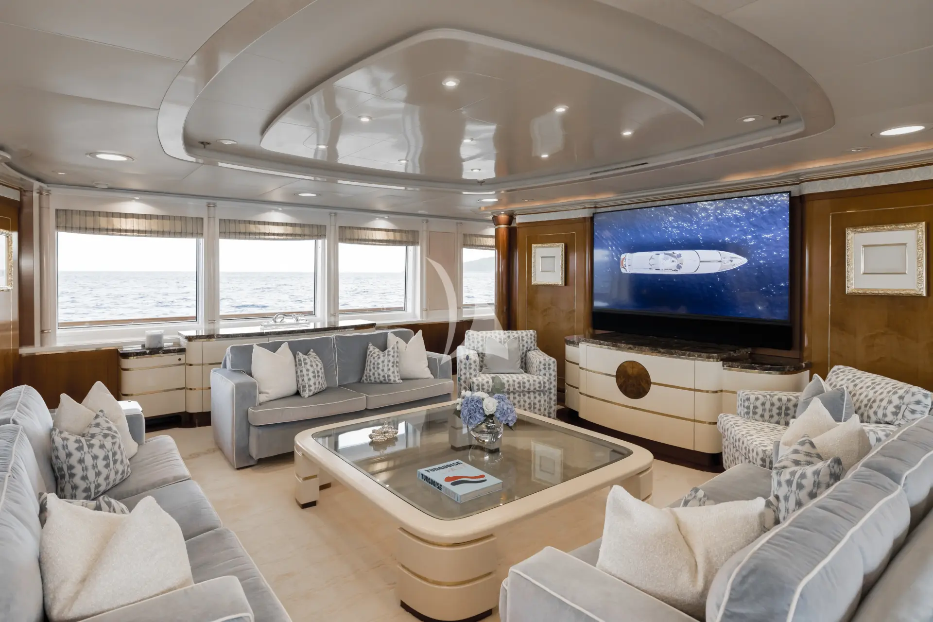 The exterior is sleek and timeless, with smooth lines complemented by bold square windows that provide a striking modern touch. OLYMPUS boasts a variety of outdoor spaces, from the sundeck, complete with an ornate bar, outdoor TV, Jacuzzi, and multiple seating areas, to alfresco dining on the main deck aft and a swimming platform below, home to her extensive array of water toys.