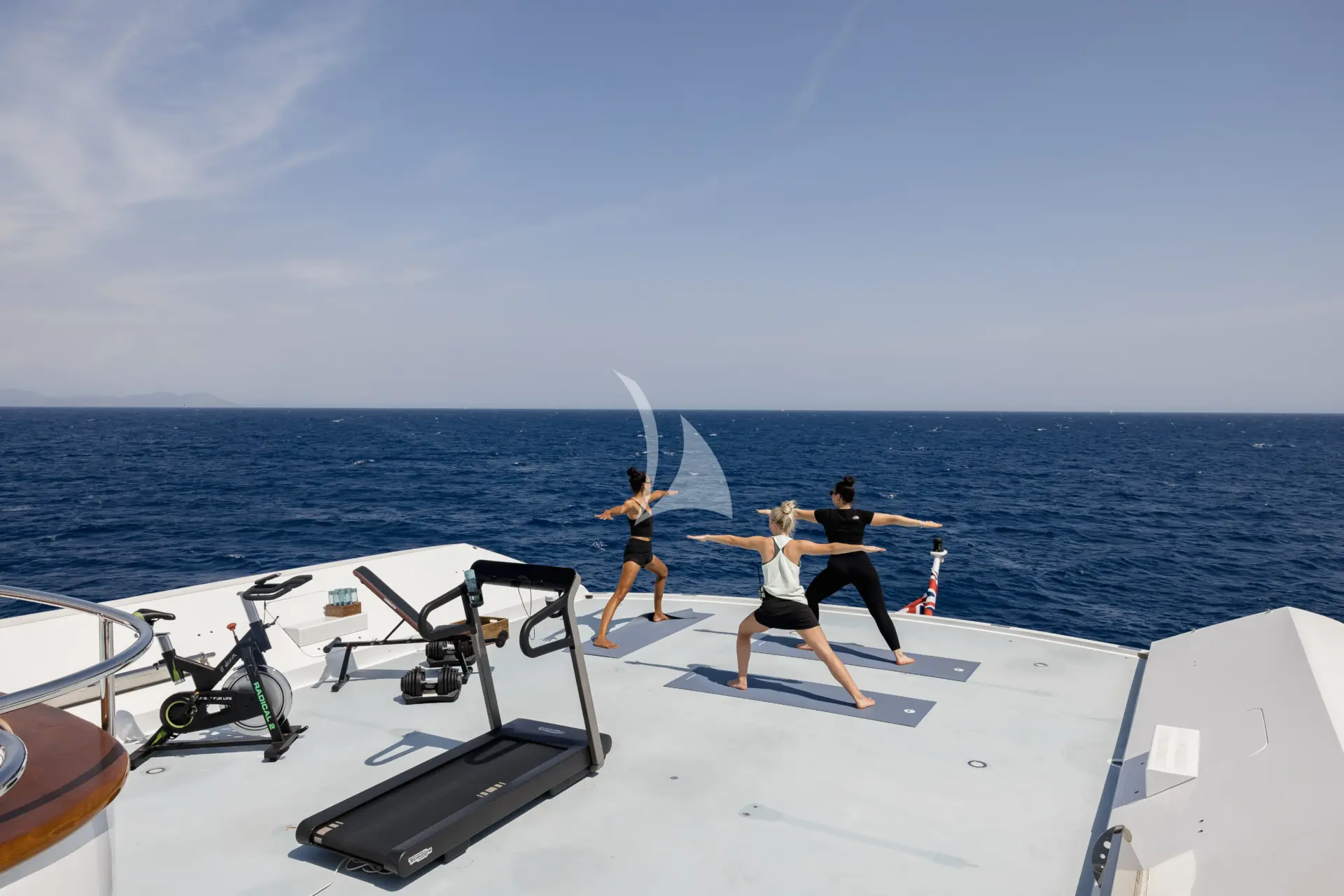 For fitness enthusiasts, the yacht is equipped with a Technogym Myrun treadmill, Concept 2 rowing machine, Bowflex weight bench, Bowflex adjustable dumbbells with stand, Domyos Biking 200 spin bike, 10 yoga mats, resistance bands, ab rollers, and small dumbbells.