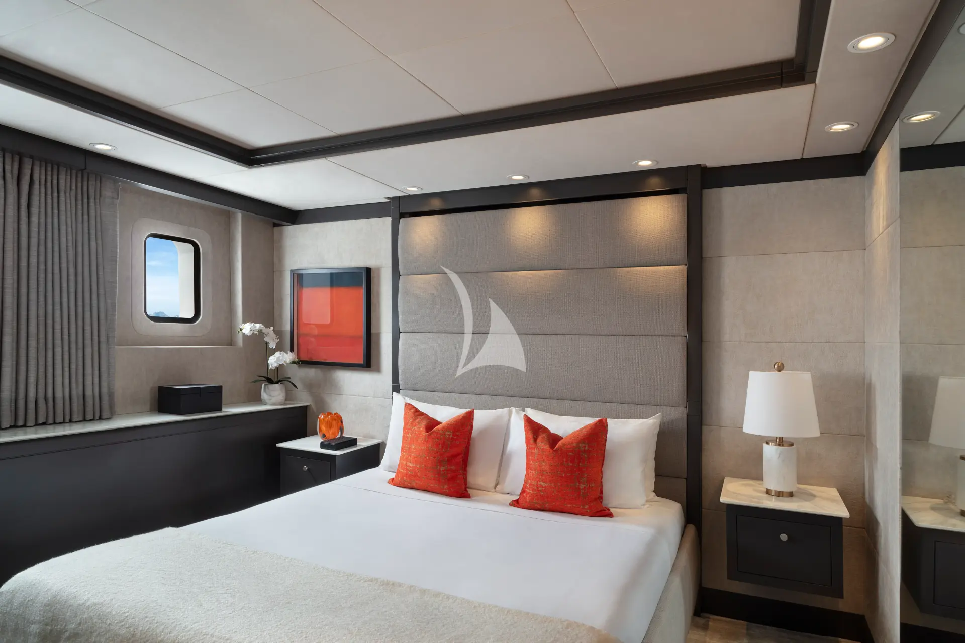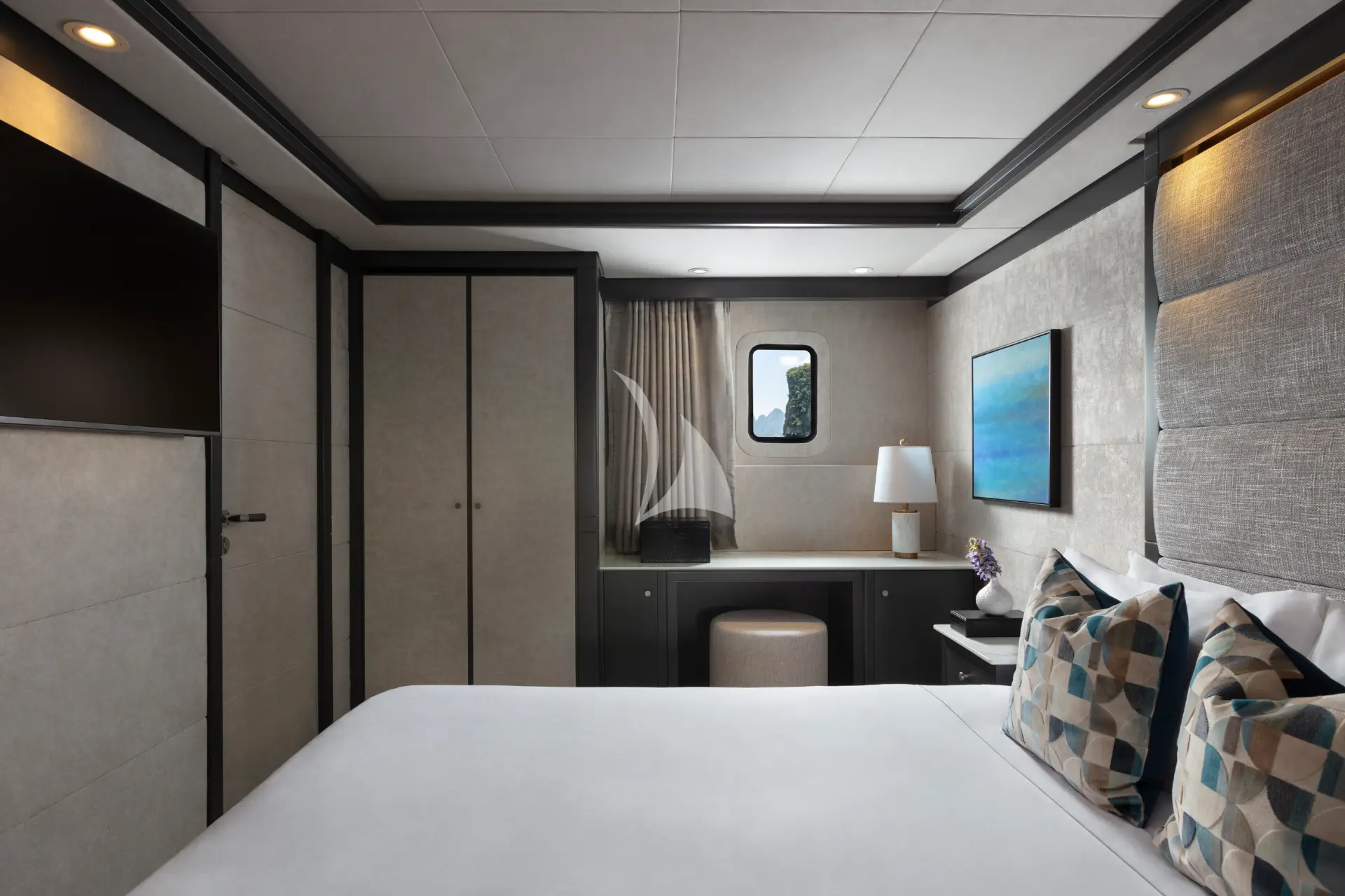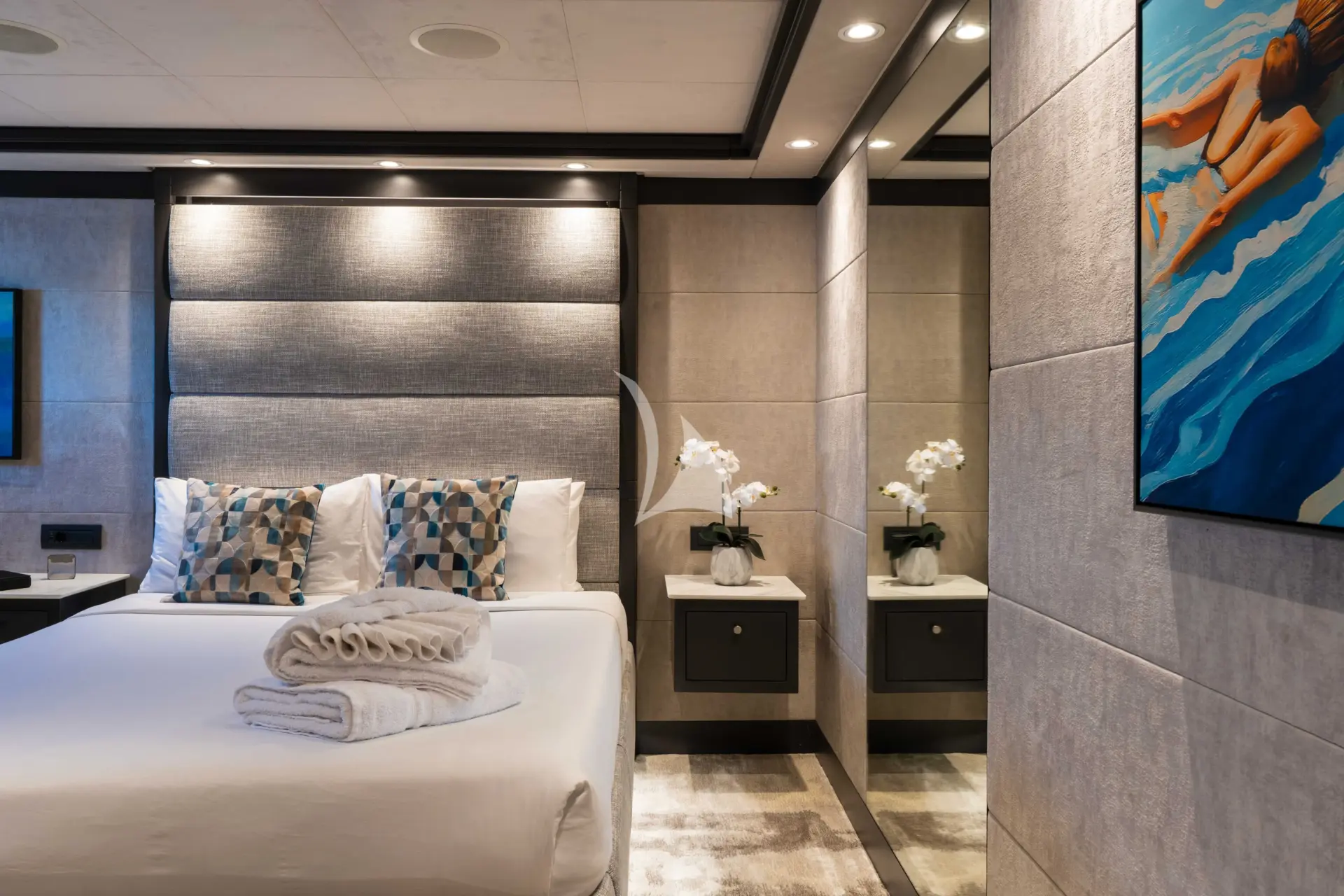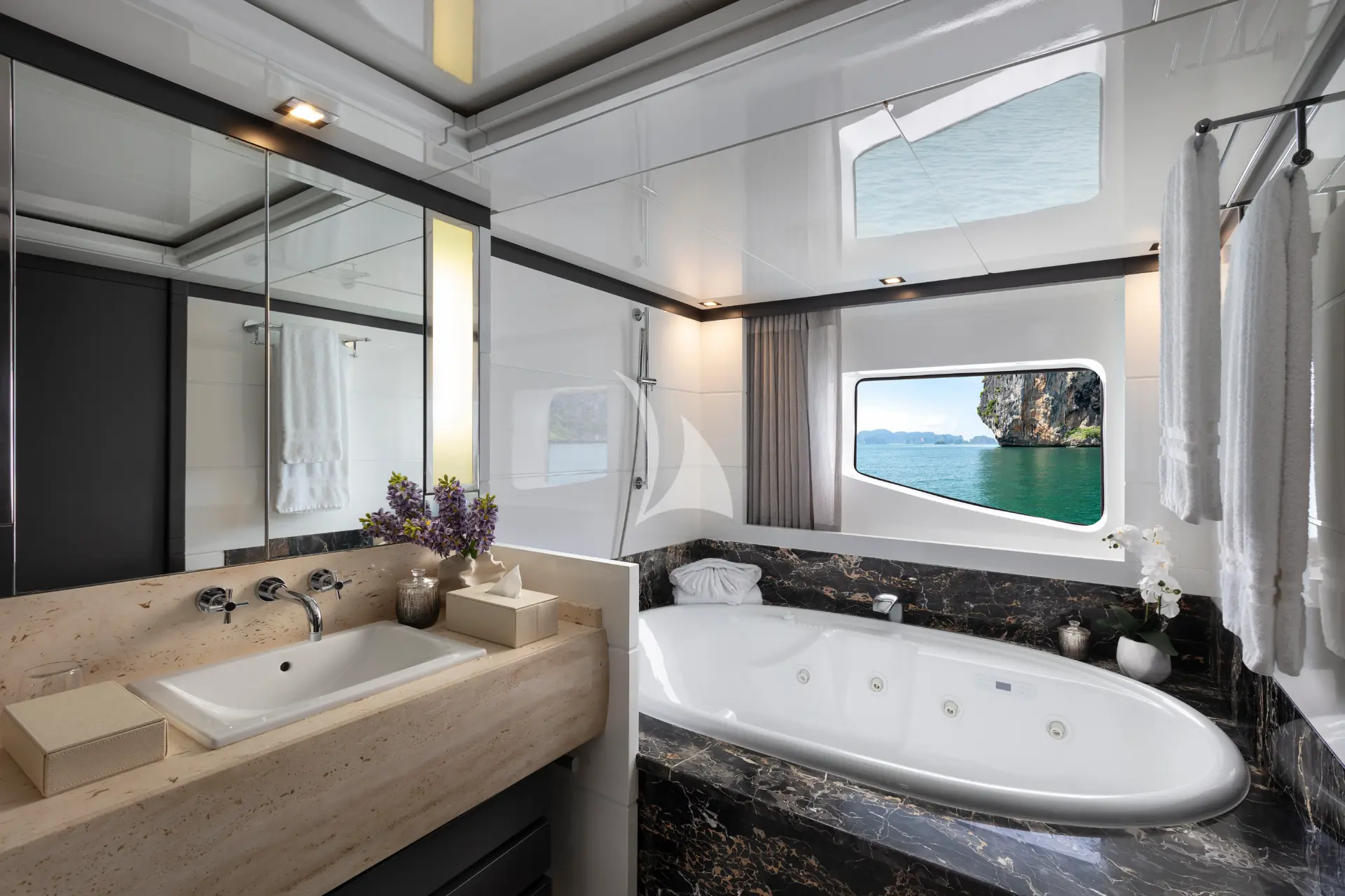 There’s accommodation for 10 guests in five spacious cabins, comprising four doubles and one twin. The full-beam master suite benefits from an owner’s study, walk-in wardrobe, and full en suite with statement bathtub. Each cabin is finished to fantastic standards.