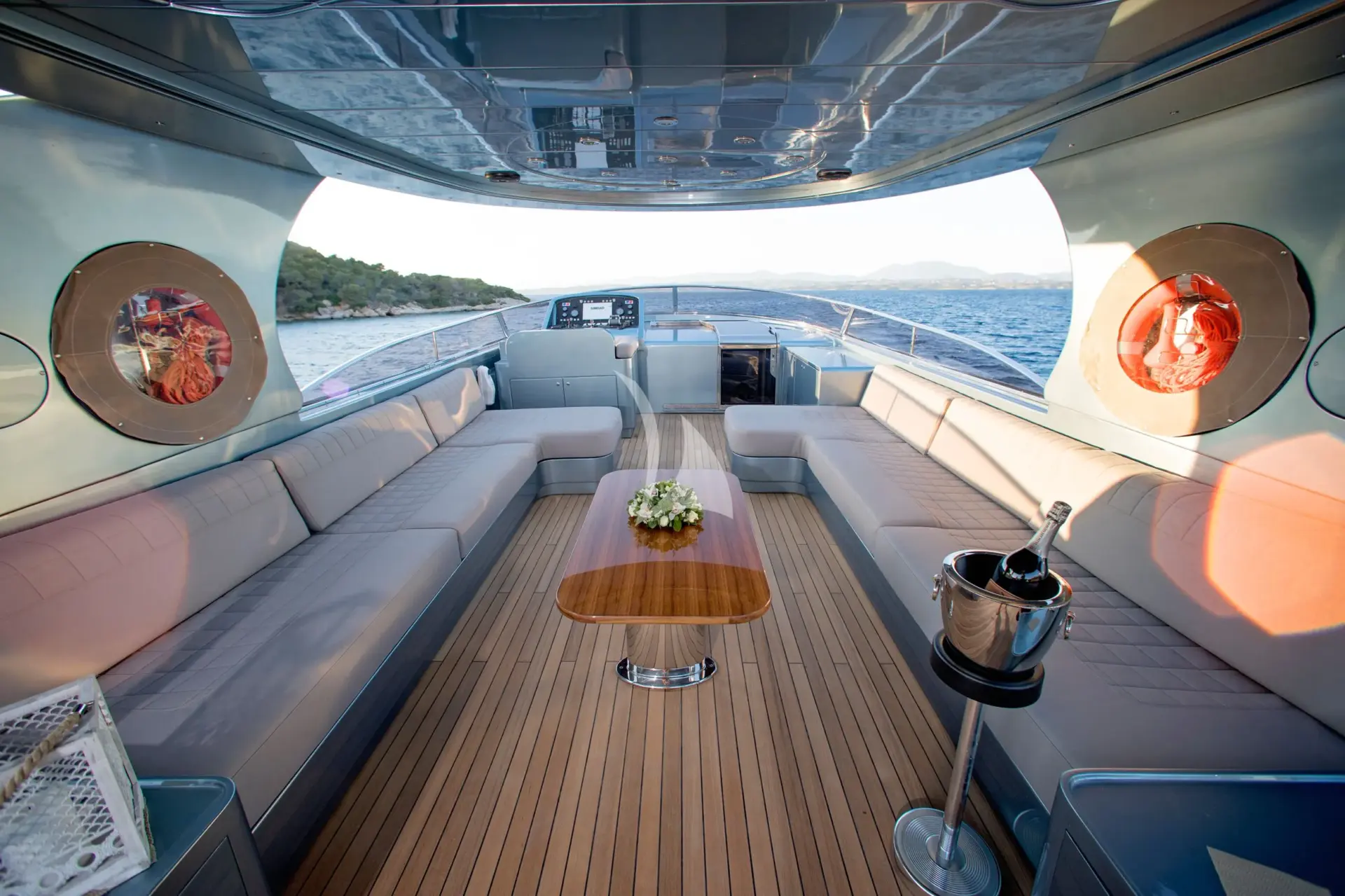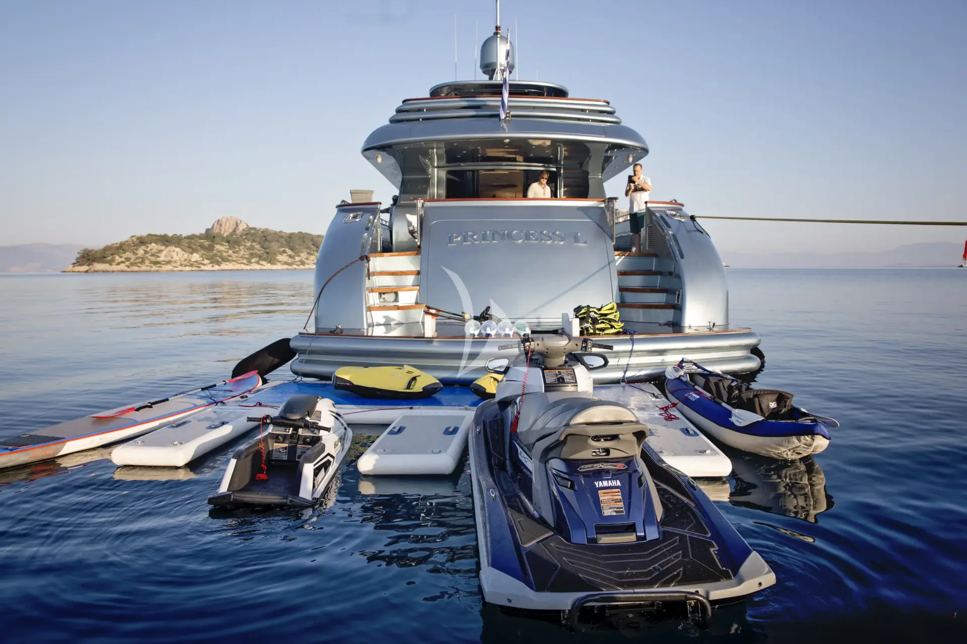 Guests can relax across spacious deck areas, from the sun pads forward to the inviting aft deck and flybridge, or enjoy easy access to the sea via the swim platform. PRINCESS L also boasts an impressive selection of water toys, ensuring endless fun on the water throughout the charter.
