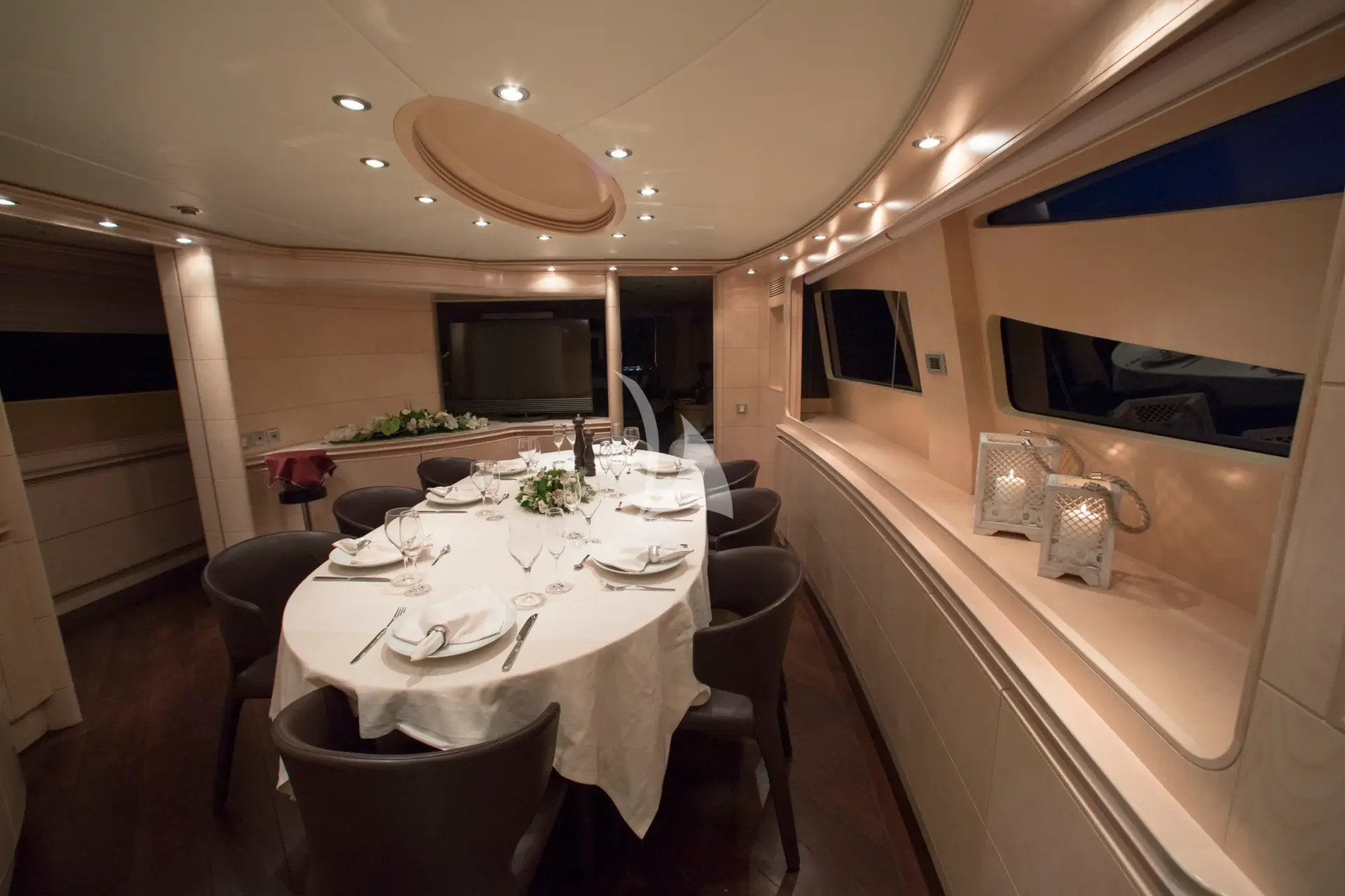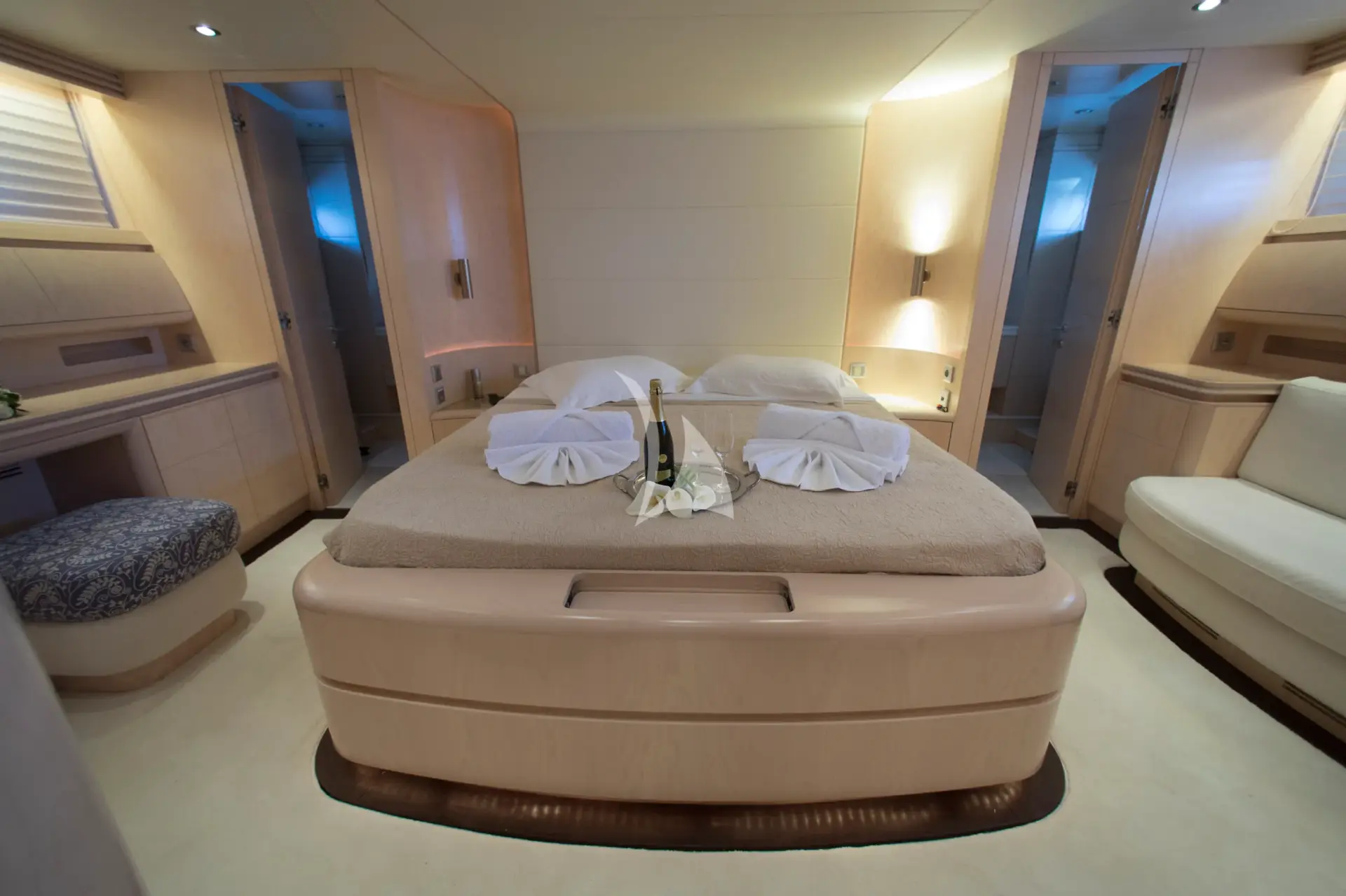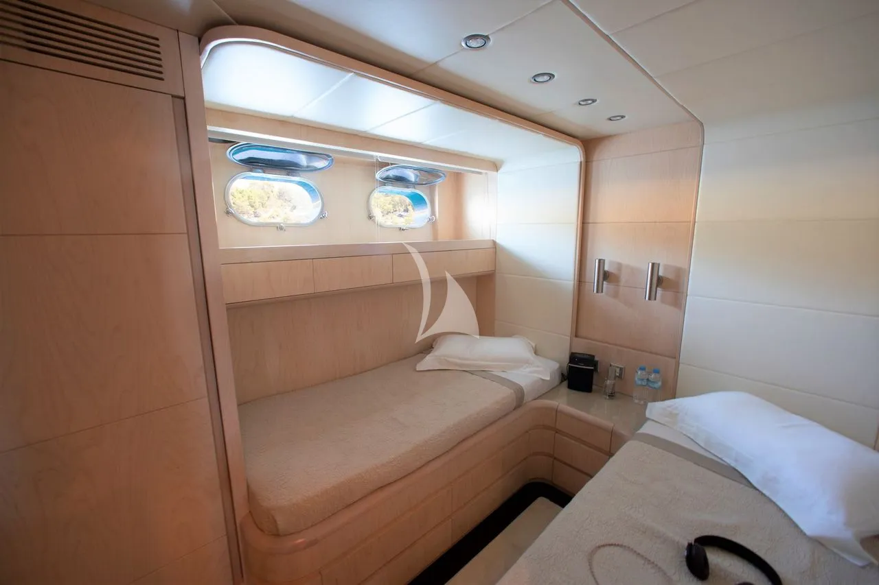 Her well-designed layout accommodates up to 12 guests in five comfortable cabins. These include a VIP cabin on the main deck, a full-beam Master suite featuring a private en-suite bathroom with an indoor Jacuzzi, a VIP cabin on the lower deck, and two Twin cabins, each with an additional Pullman berth—making her ideal for both families and mixed charter groups.