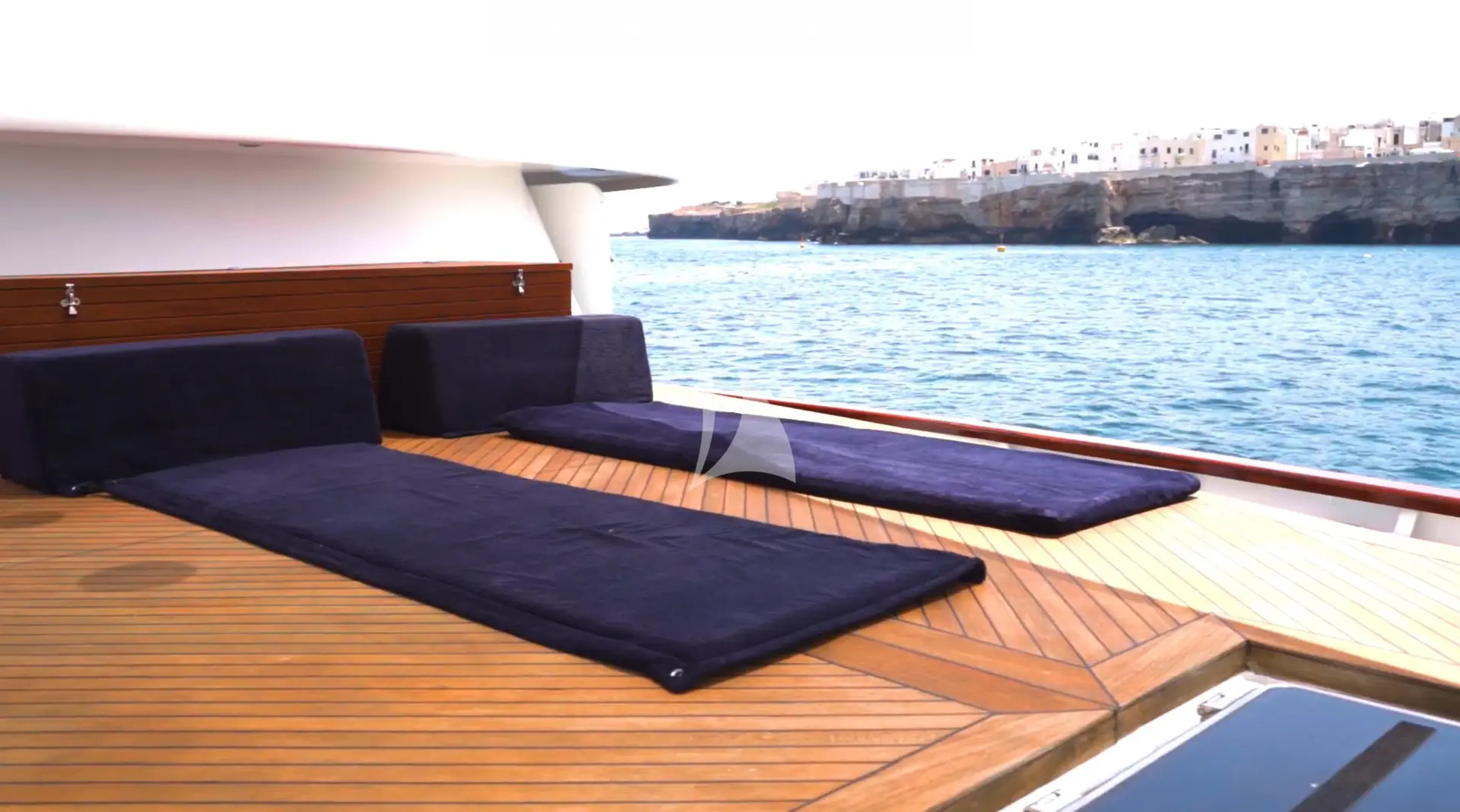 Above, the flybridge offers a relaxed lounge with an indoor TV room and bathroom, which can also be converted into an additional double cabin if required. Outdoor living is a true highlight: a spacious aft deck invites guests to enjoy alfresco dining and leisurely moments, while the sundeck offers a stylish lounge and minibar – perfect for sunset cocktails. A sunbathing area on the bow completes the exterior spaces, ideal for soaking up the sea breeze and panoramic views. Guests can also enjoy a varied selection of water toys, along with a chase boat for shoreside excursions.