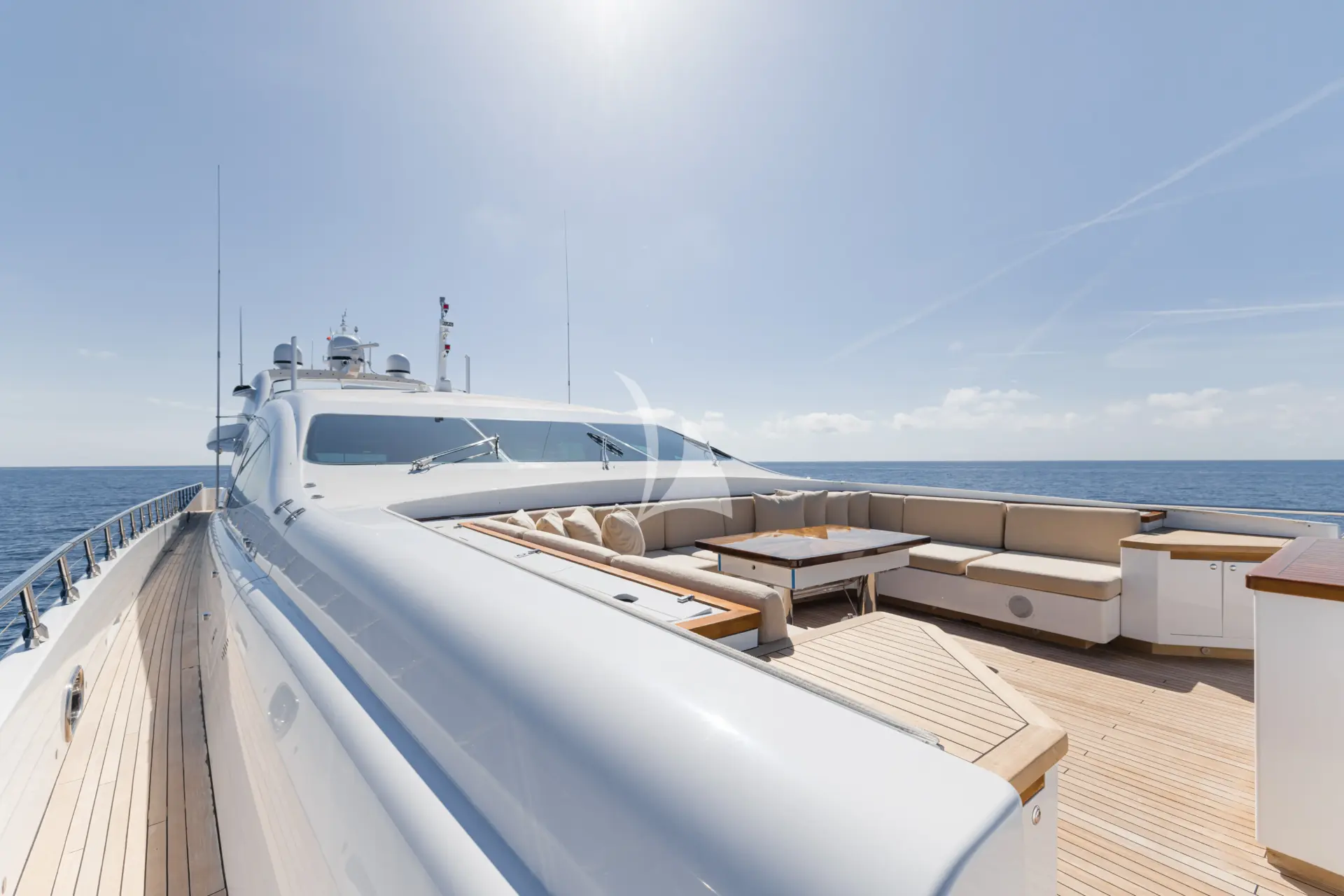 Life on board is centred around open-air living. Guests naturally spend most of their time on the sundeck, where open-air dining and generous lounging create the main social hub, but the yacht’s three distinct exterior areas mean the experience never feels limited to one space. The large aft deck is ideal for long lunches and relaxed service, the foredeck offers an inviting setup with lounge seating and sunpads, and the top deck is made for sunbathing, dining and enjoying the full rhythm of a summer day on board.