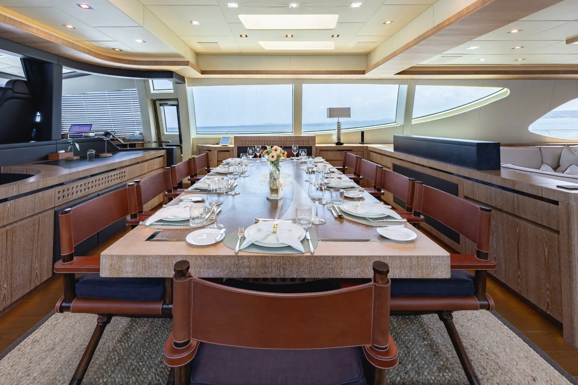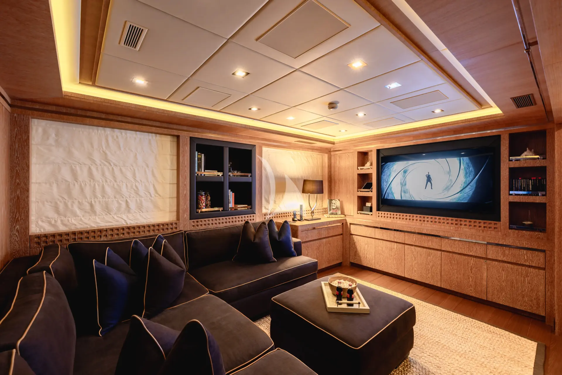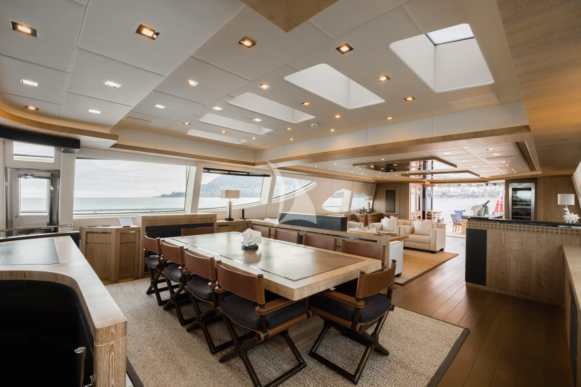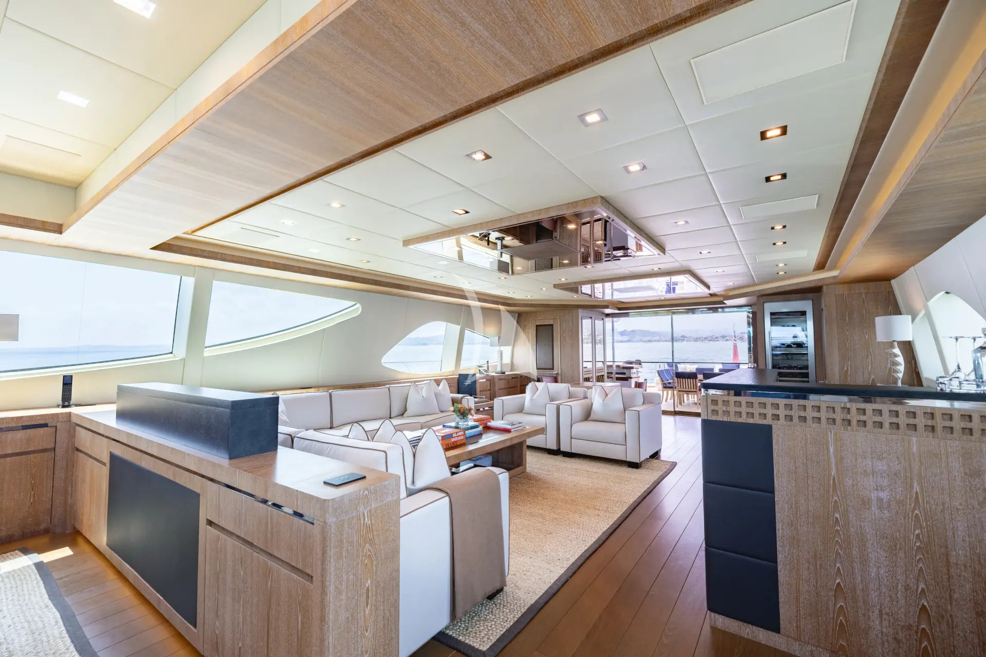 Inside, ROYALE X has a bright, modern and contemporary atmosphere that feels welcoming from the moment guests step aboard. The interior works particularly well for charter because the main social spaces are so open and well connected, with the saloon, dining area and bar arranged as one spacious, sociable setting. A standout feature is the open-plan cinema/media room on the lower deck, which adds a relaxed, family-friendly element to the experience and gives the yacht another space to enjoy beyond the main entertaining areas.