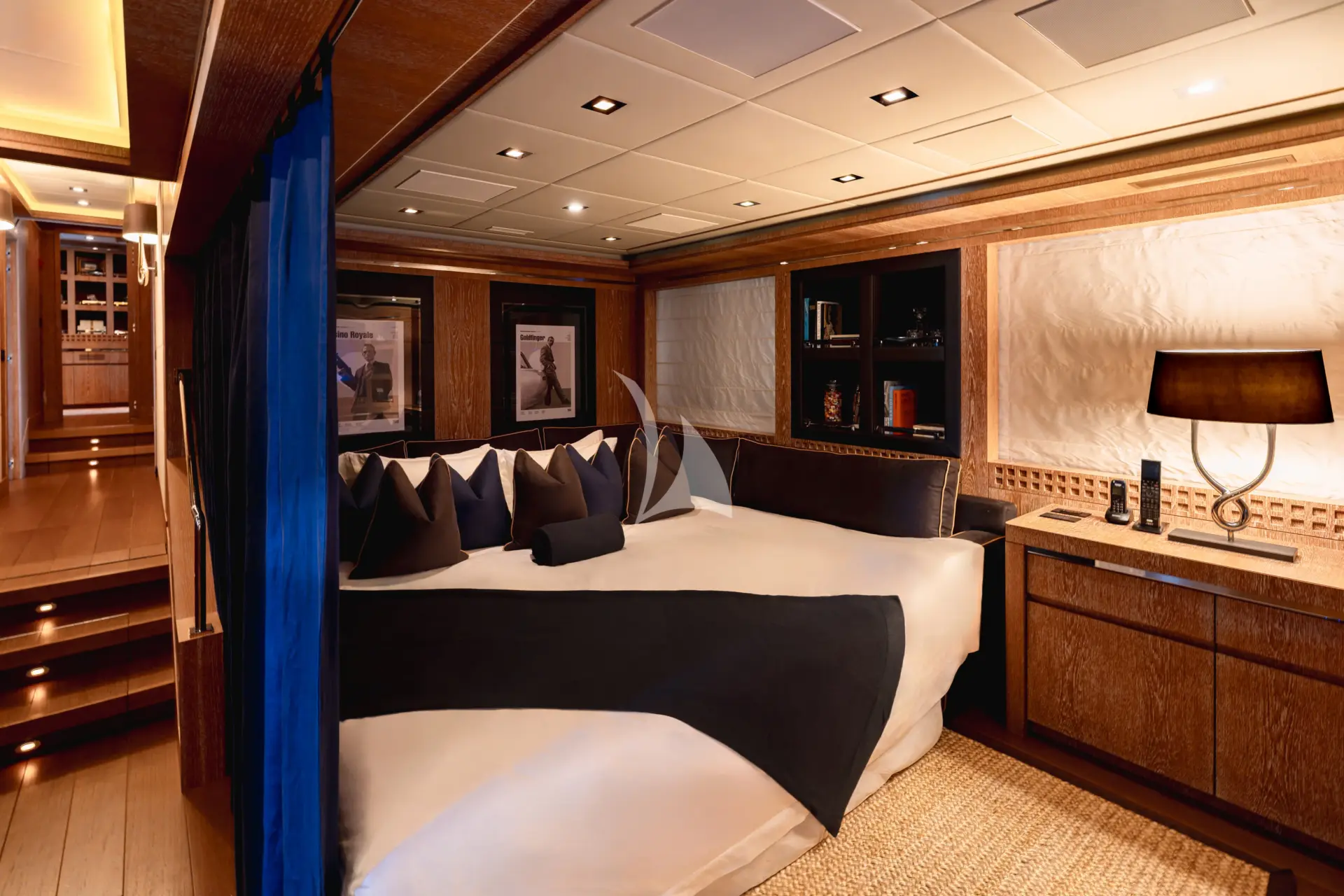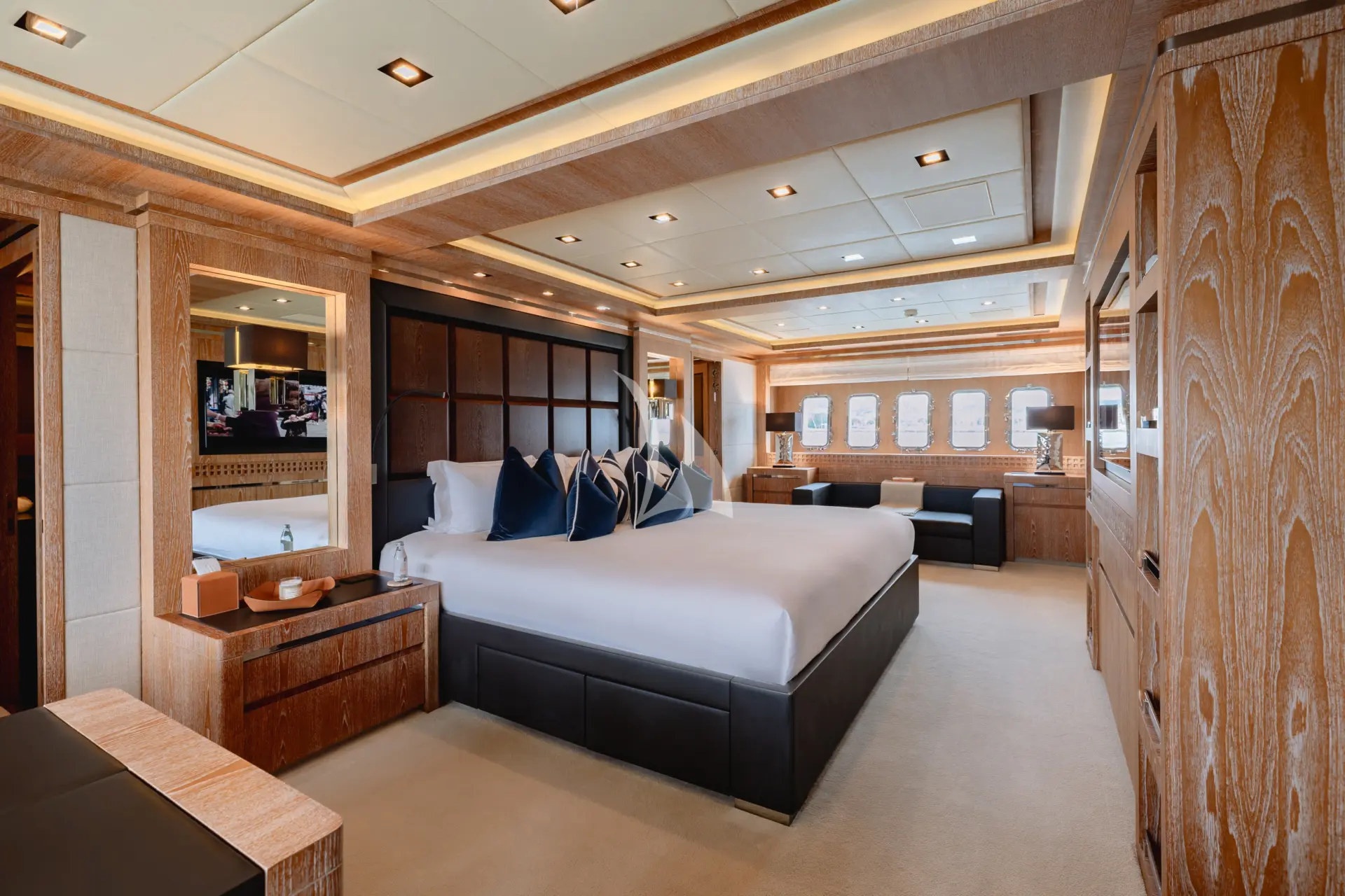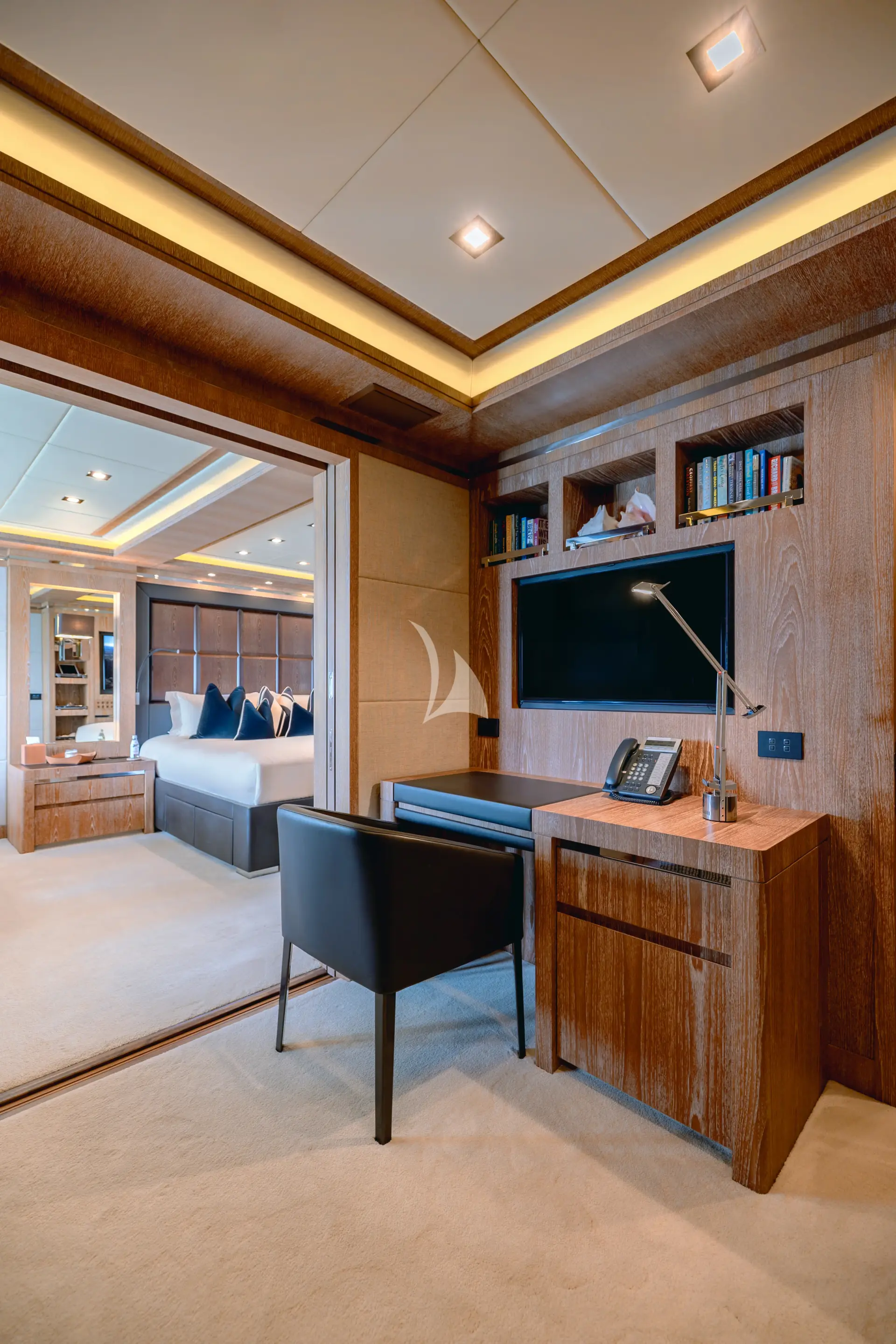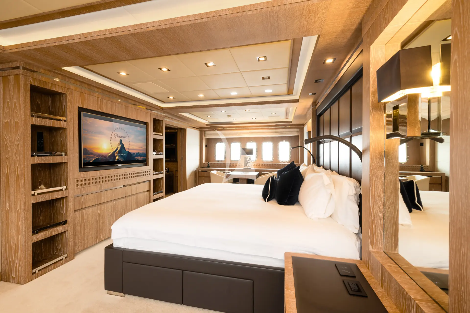 Accommodation is especially well suited to private family use or close groups of friends. The full-beam master cabin is a real highlight, complete with a walk-in dressing room, separate office and private access to the gym, giving it the feel of a true owner’s retreat. The cinema/media room can also convert into a double or twin setup for children, adding useful flexibility for family charters, although it is best suited to younger guests as it does not have a door or ensuite facilities.