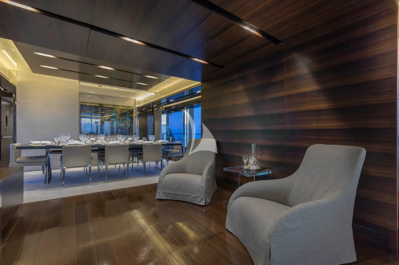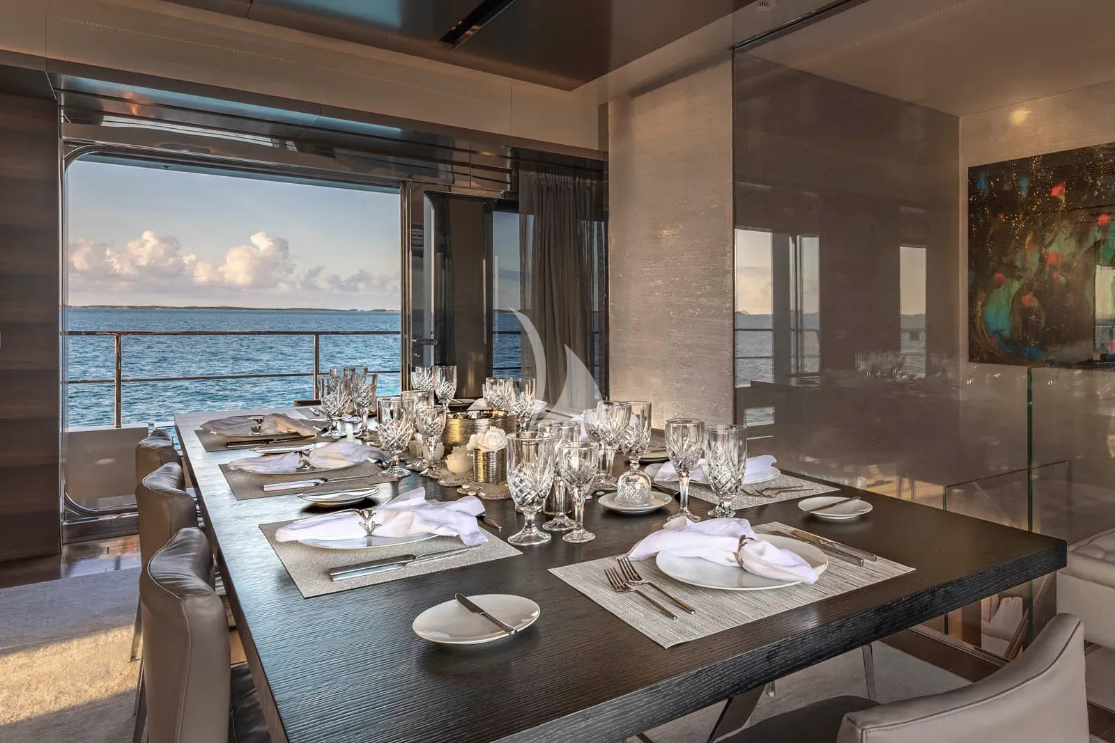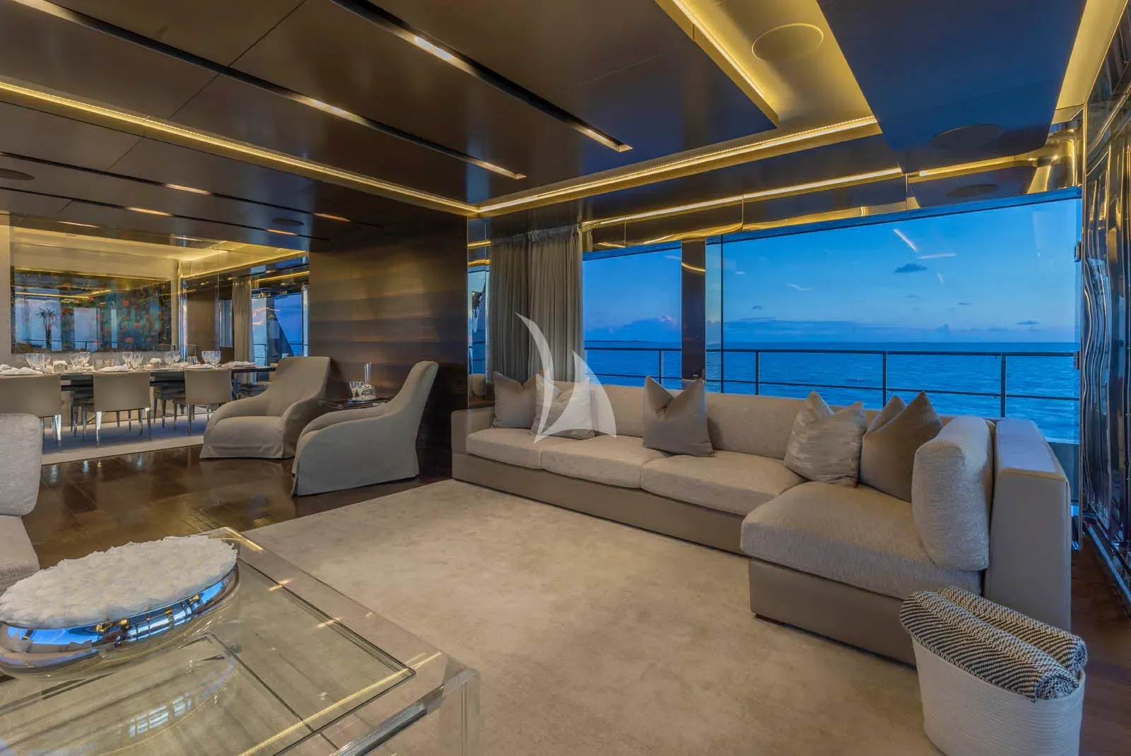 The main deck salon is a calming place to hang out, with huge cream sofas facing each other and lots of natural light thanks to the large windows. The dining area beyond is a gorgeous space, offering an exclusive feel for a fine-dining banquet, and again, great views thanks to large windows either end of the table.