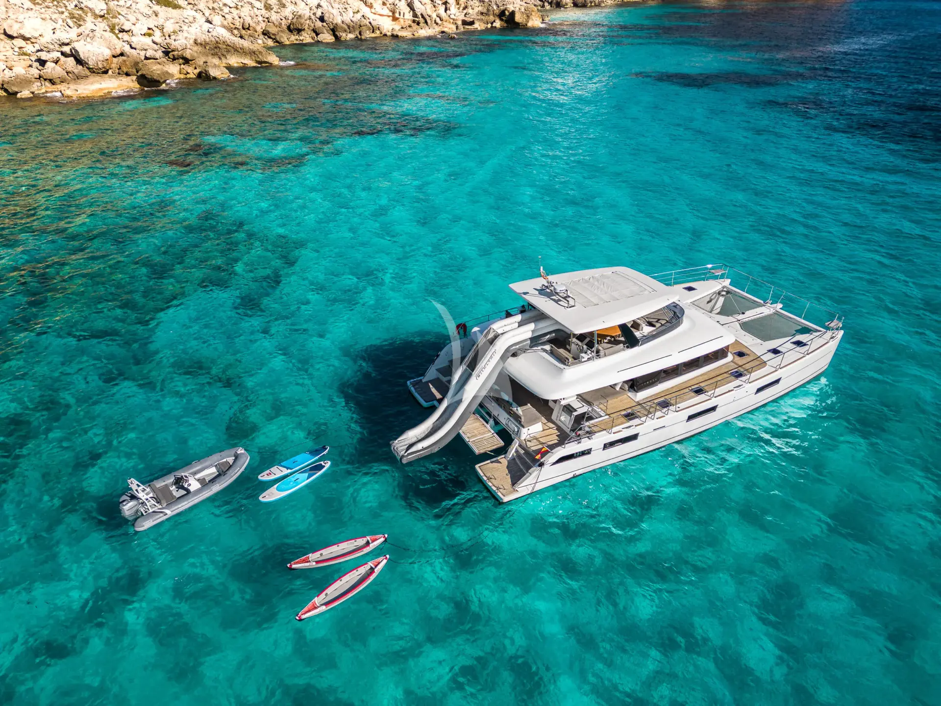 SEEK is the perfect catamaran for your cruising holiday. With the perfect blend of exterior and interior space, you will always have the perfect place to sit back and relax. This is a relaxing and family-friendly catamaran. One of the highlights on board is the inflatable slide, which is always a big hit with guests and adds an extra fun factor, especially at anchor or during day charters. As a power catamaran, SEEK benefits from wide walkways, uncluttered decks and spacious outdoor areas, offering panoramic sea views and easy circulation on board.