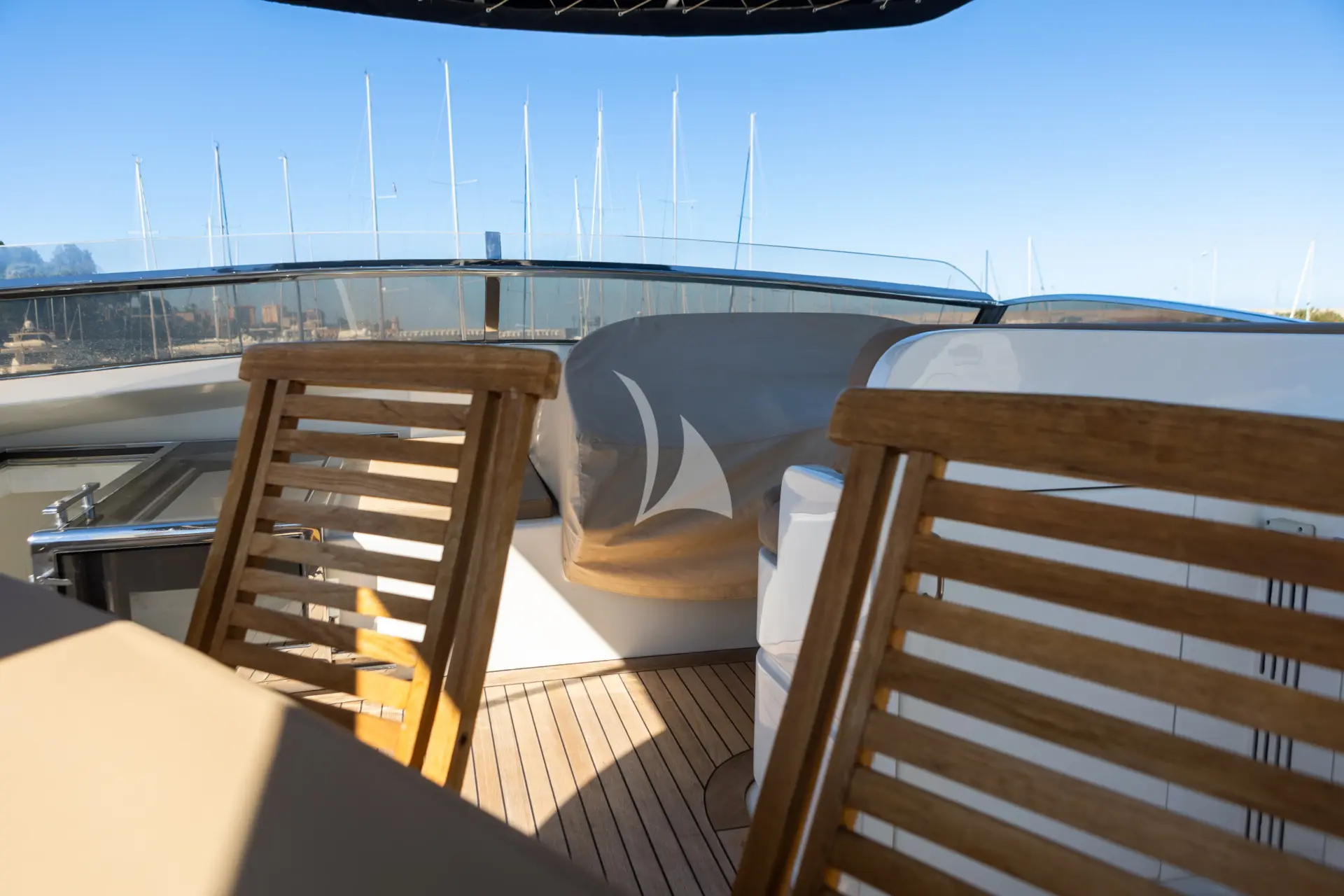 The yacht features a classic yet contemporary profile, with a streamlined hull and expansive deck spaces. The large flybridge offers ample room for sunbathing, alfresco dining, and socializing, while the aft deck provides a perfect setting for open-air meals and relaxation close to the water.