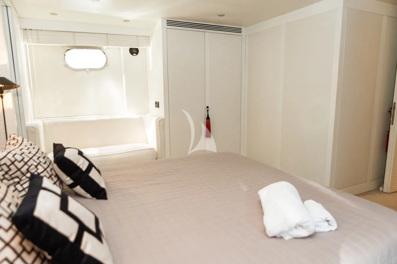 The yacht can comfortably accommodate up to 8 guests in 4 spacious cabins, including a full-beam master suite, a VIP cabin, and two twin cabins—all with en-suite bathrooms. The thoughtful layout ensures privacy and comfort for all guests, while a separate crew area guarantees discreet and efficient service.