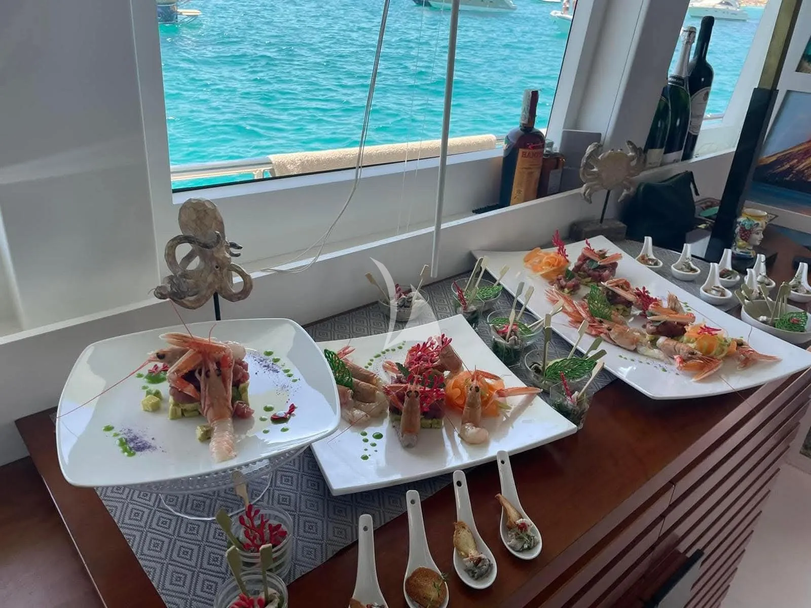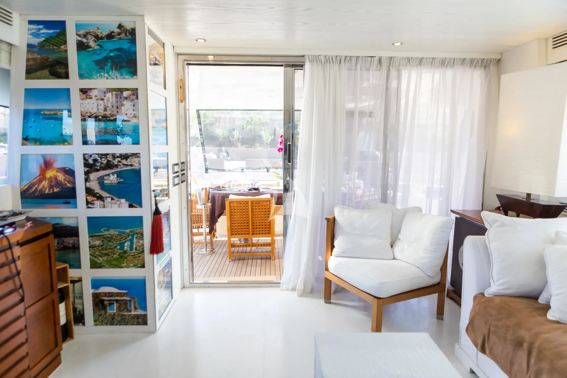 Inside, the Antago 82 Seven Stars boasts a refined and welcoming atmosphere. The main salon is flooded with natural light thanks to large panoramic windows, and is furnished with comfortable sofas, a formal dining area, and elegant décor in neutral tones. High-quality materials and meticulous attention to detail are evident throughout.