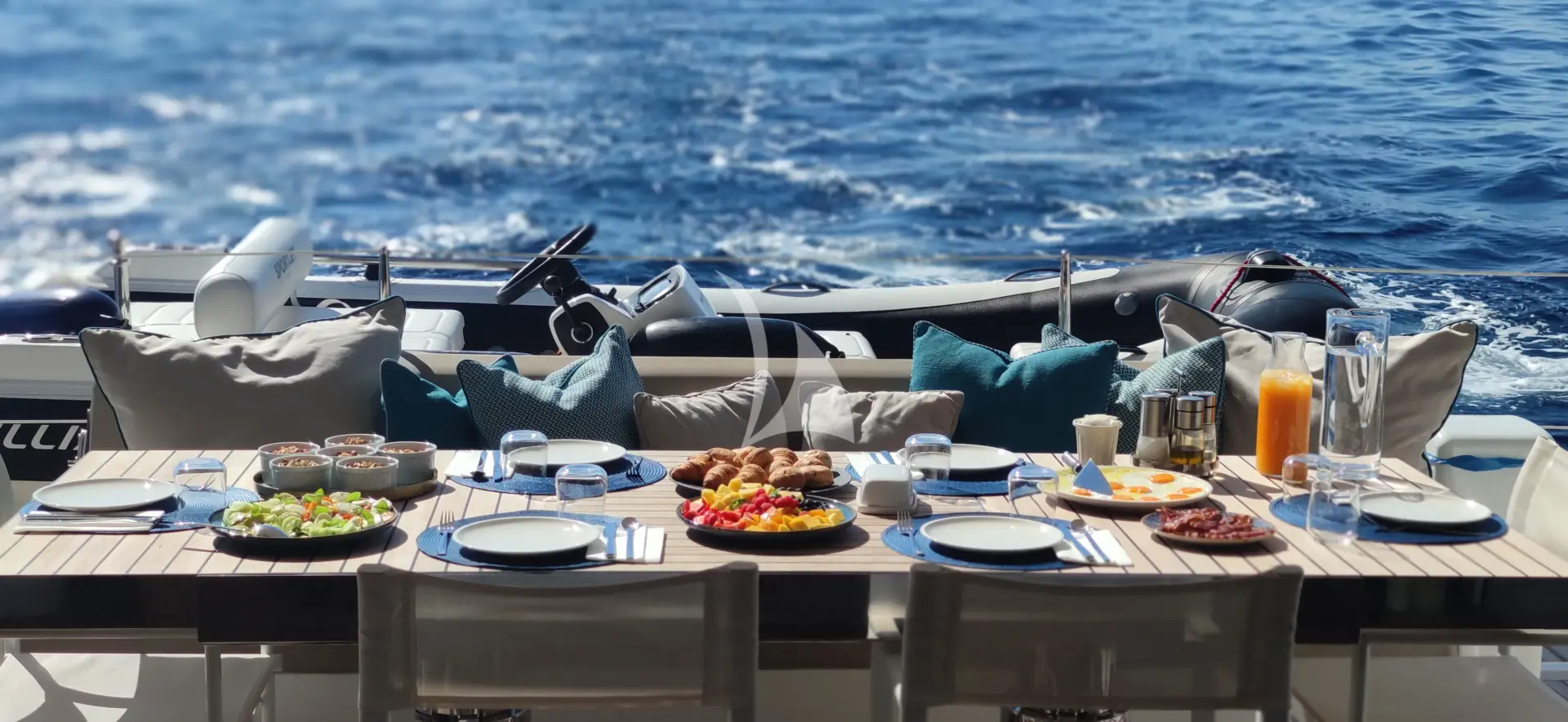 Al-fresco dining areas on the cockpit and flybridge invite relaxed meals under the open sky.