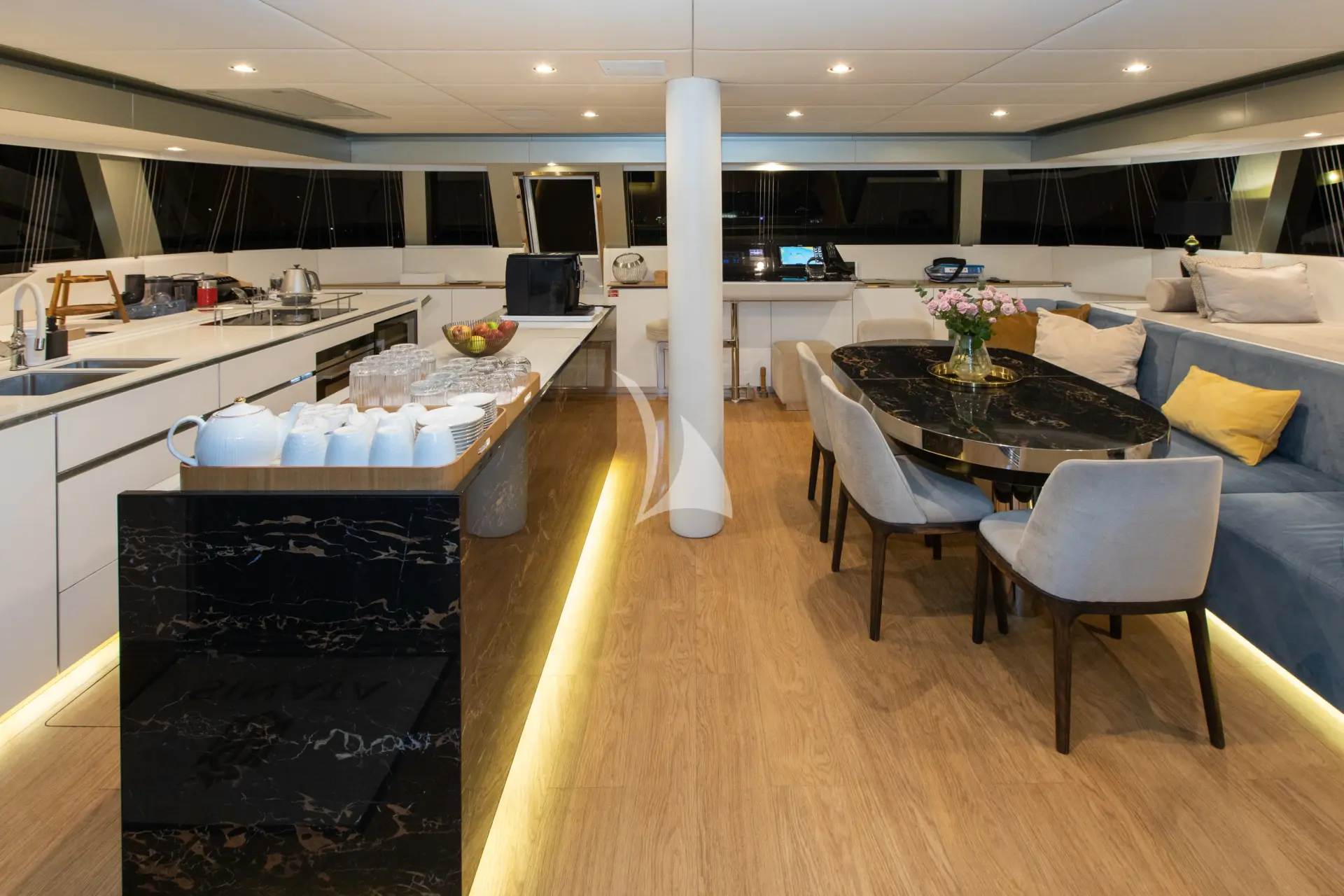 Huge panoramic windows flood the saloon with natural light while offering breathtaking 360° sea views.