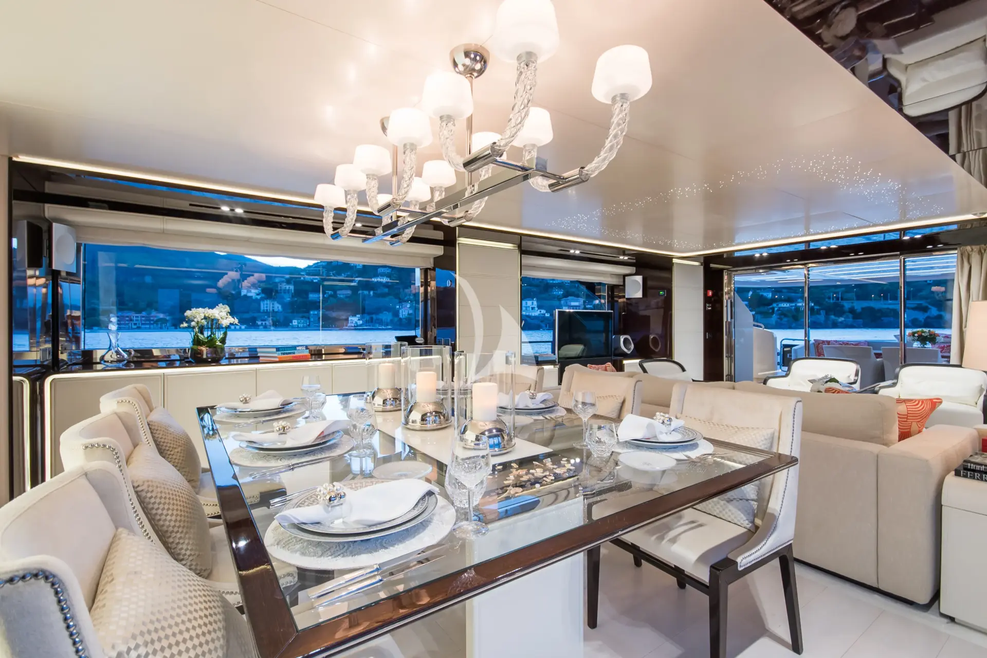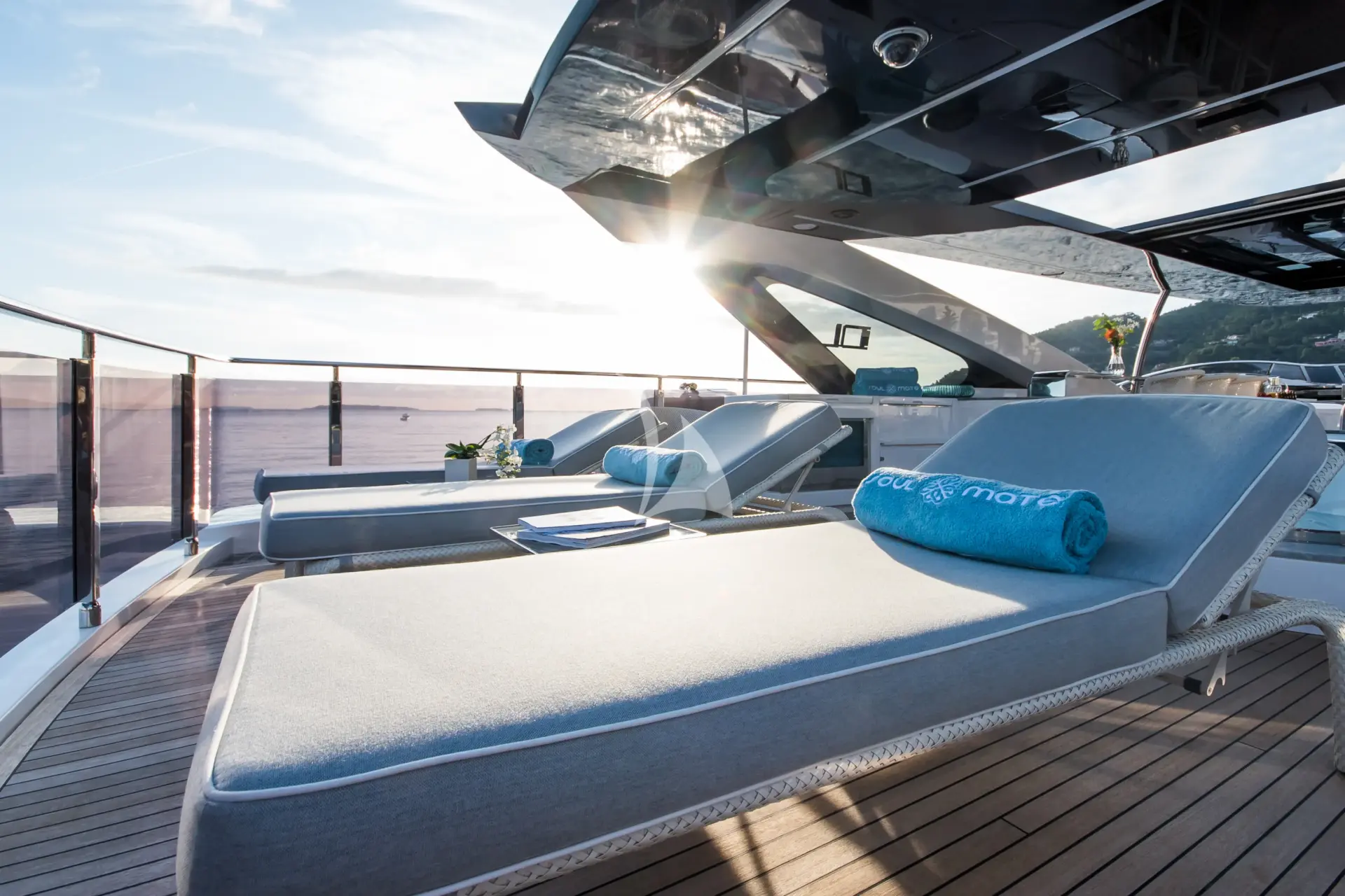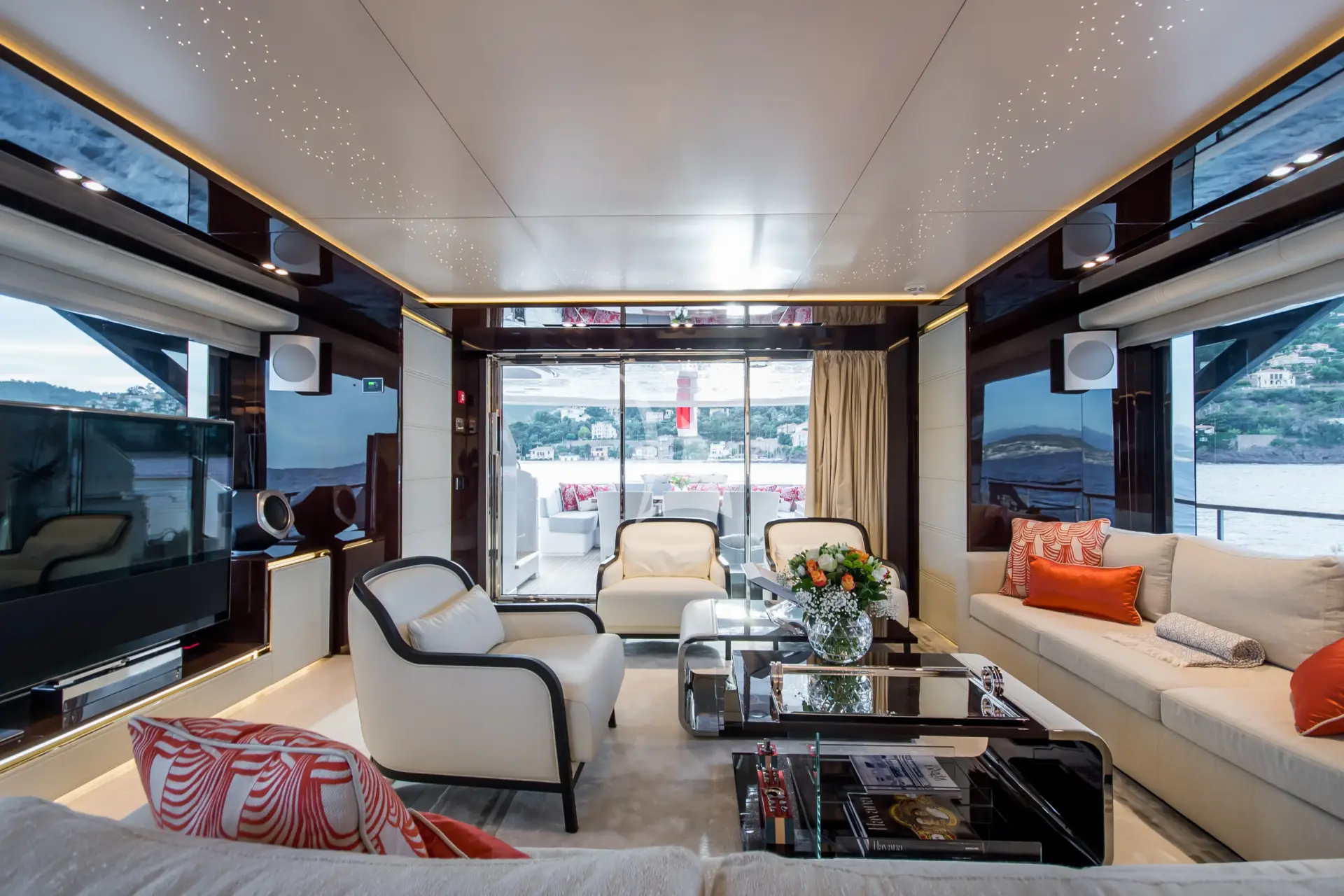 The interior is in elegant tones of cream with dark accents for a contemporary, warm and welcoming ambience. SOULMATE remains fresh with an extensive upholstery and soft furnishing update by Sabrina Monte Carlo in both Spring 2019 and 2020 with continuous maintenance each winter. The main salon provides a spacious lounge with panoramic views, a distinctive fold-down balcony, a formal dining area, and state-of-the-art entertainment systems, seamlessly combining comfort and sophistication.