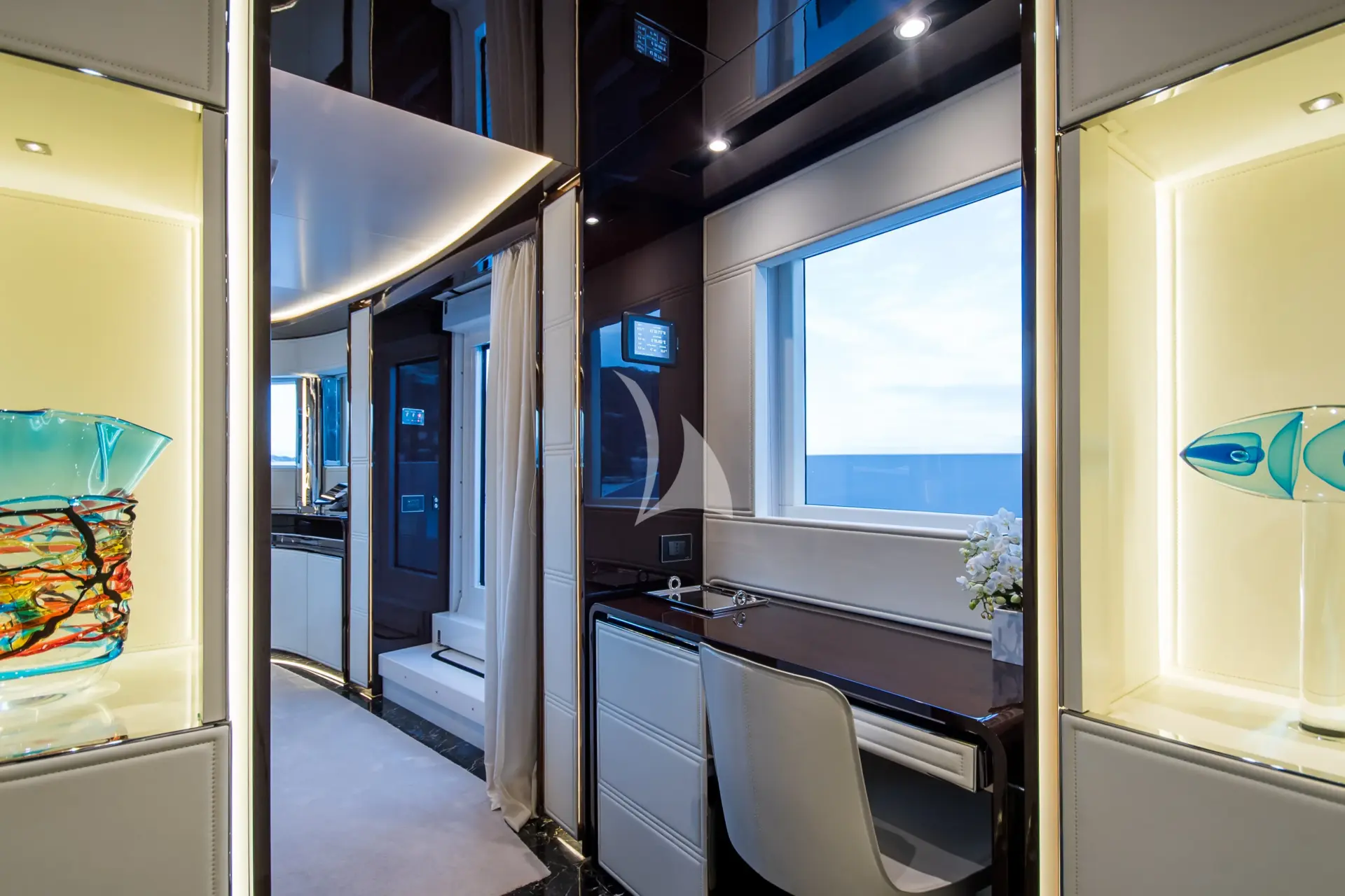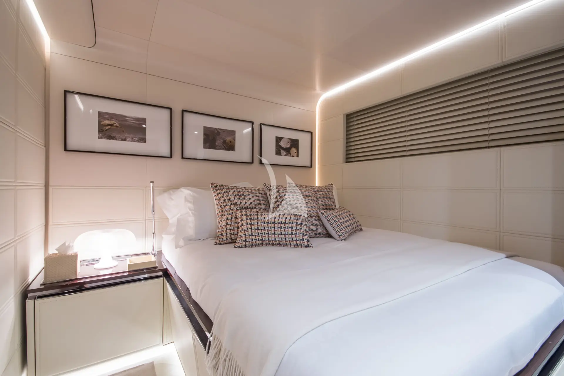 MY SOULMATE offers luxurious accommodation for up to 10 guests across five beautifully designed cabins. The full-beam master cabin, located on the main deck, includes an ensuite bathroom, a walk-in wardrobe, and a private owner's area on the bow, providing a tranquil space for relaxation and privacy. On the lower deck, four additional guest cabins (three doubles and one twin) each featuring ensuite facilities, showcase a perfect blend of modern elegance and comfort.