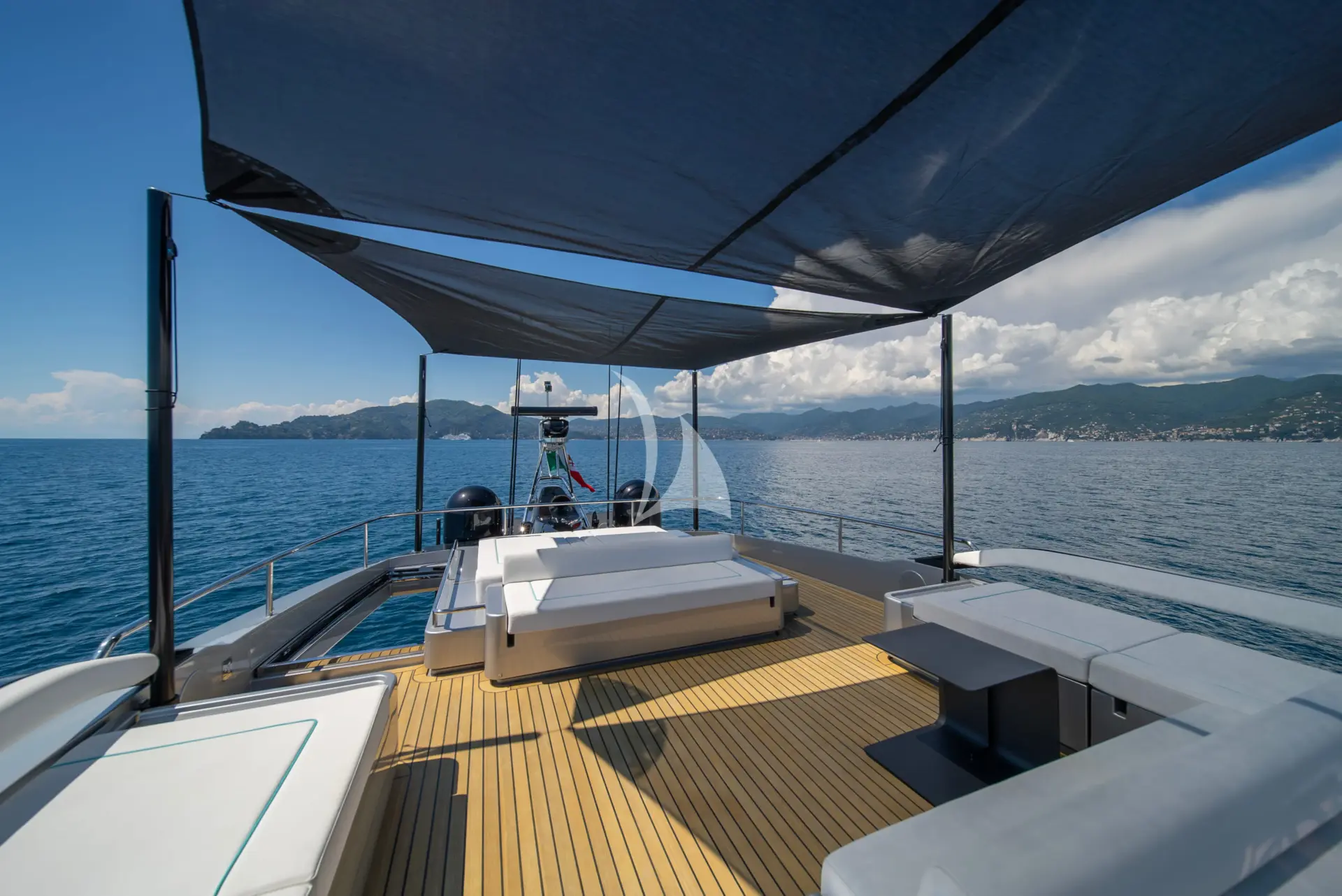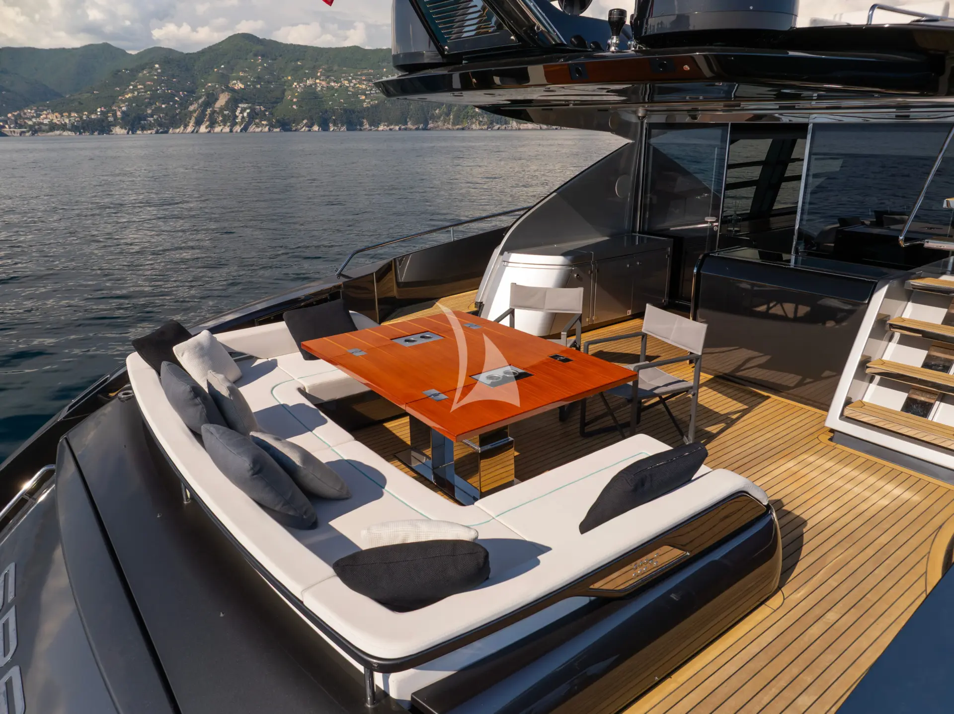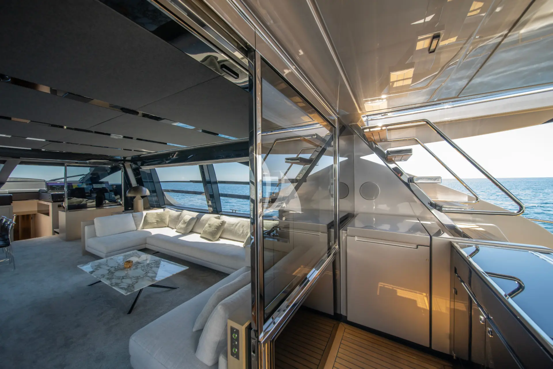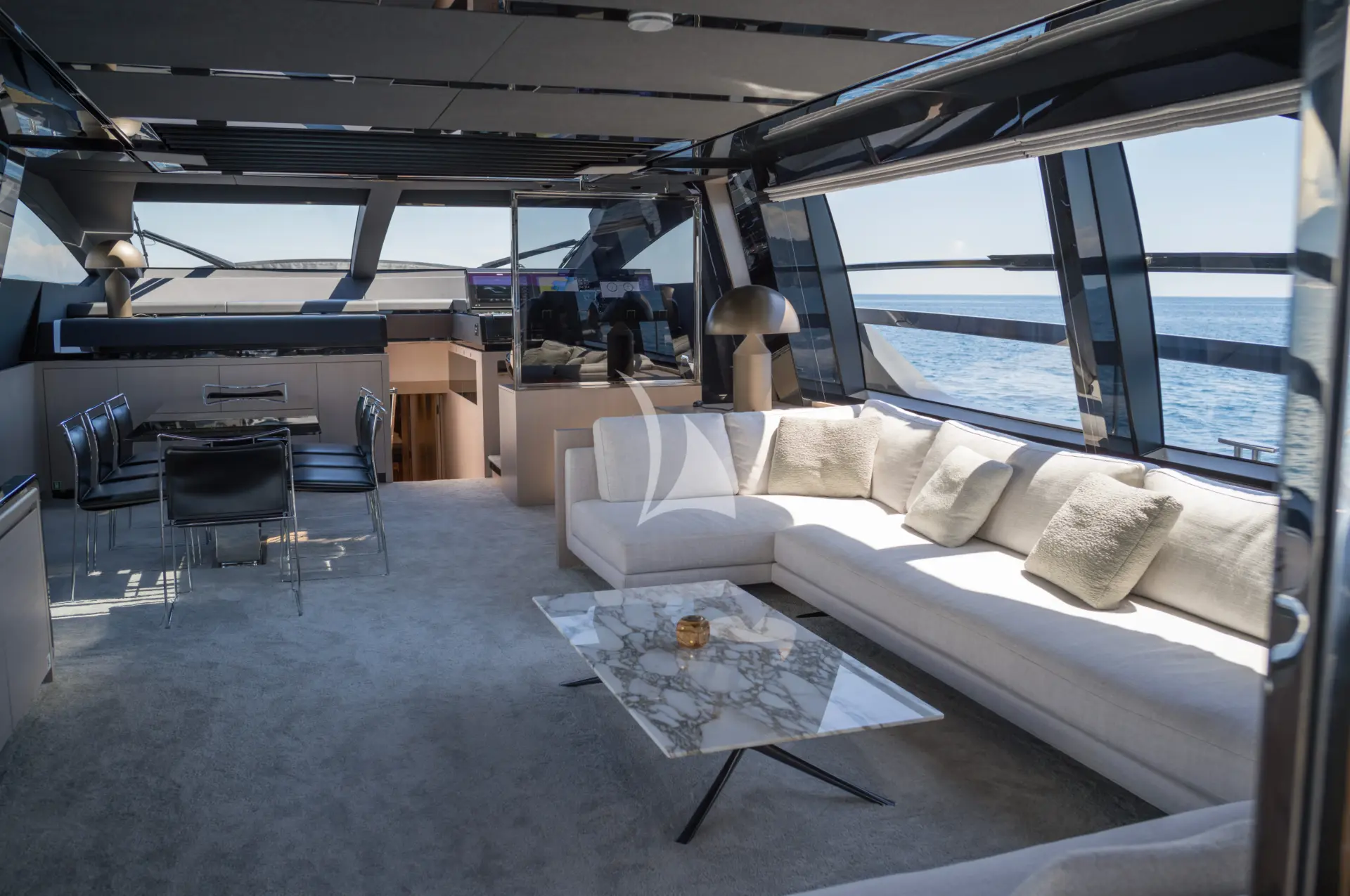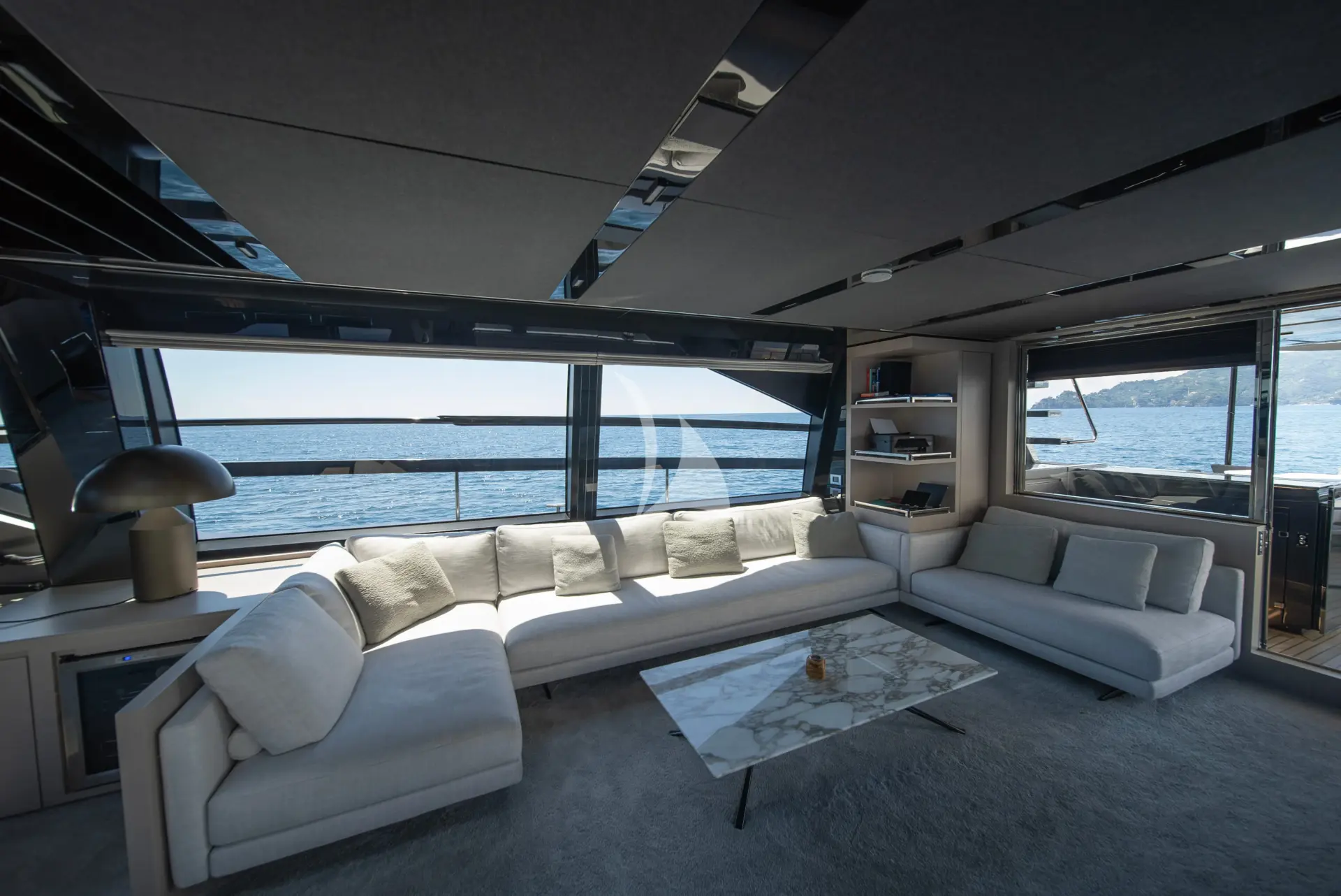 The luminous and expansive salon features vast windows and distinctive architectural details, welcoming guests as they move from the cockpit into the main living area. The dining space is arranged around a plush L shaped sofa and a large dining table seating up to eight guests.
