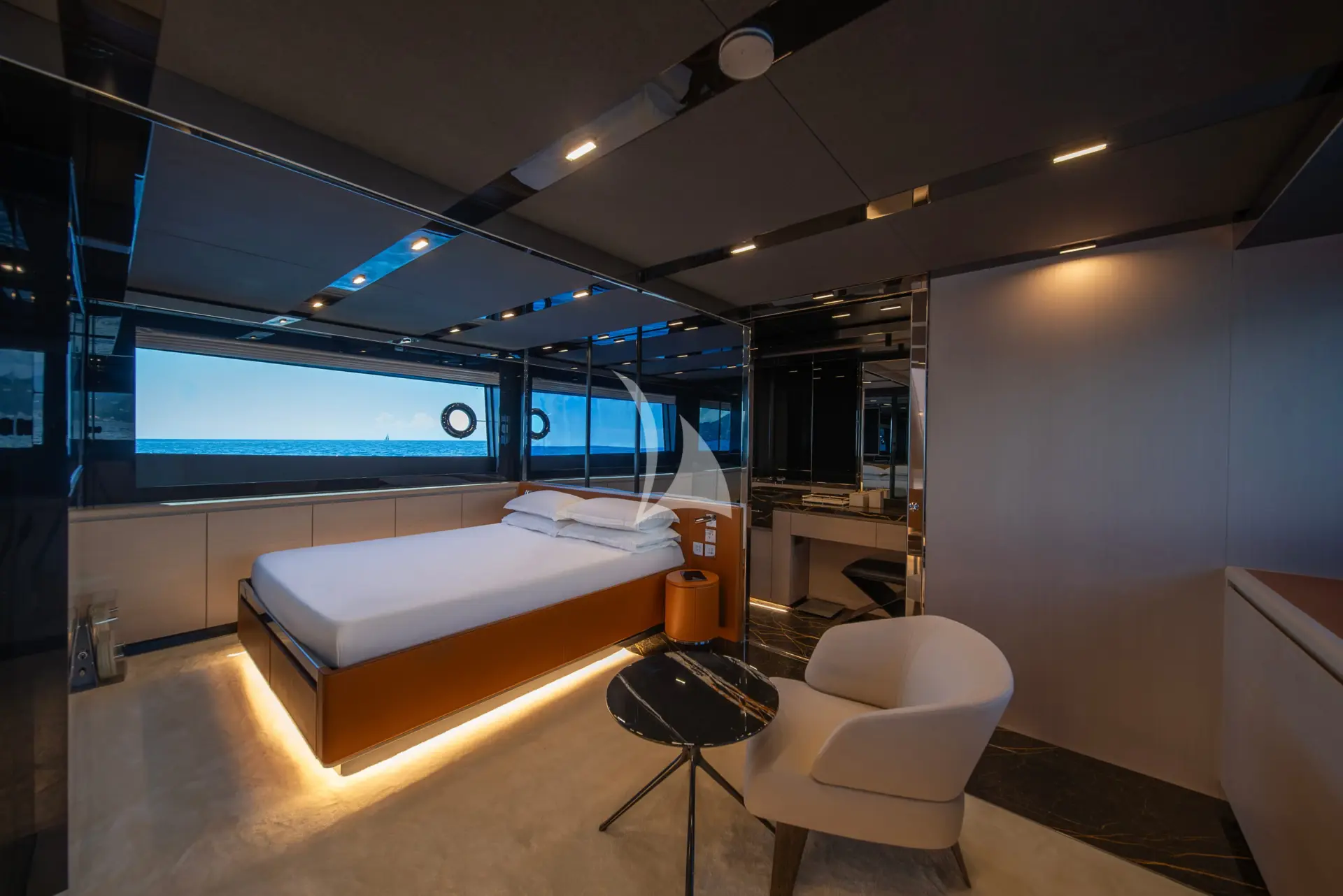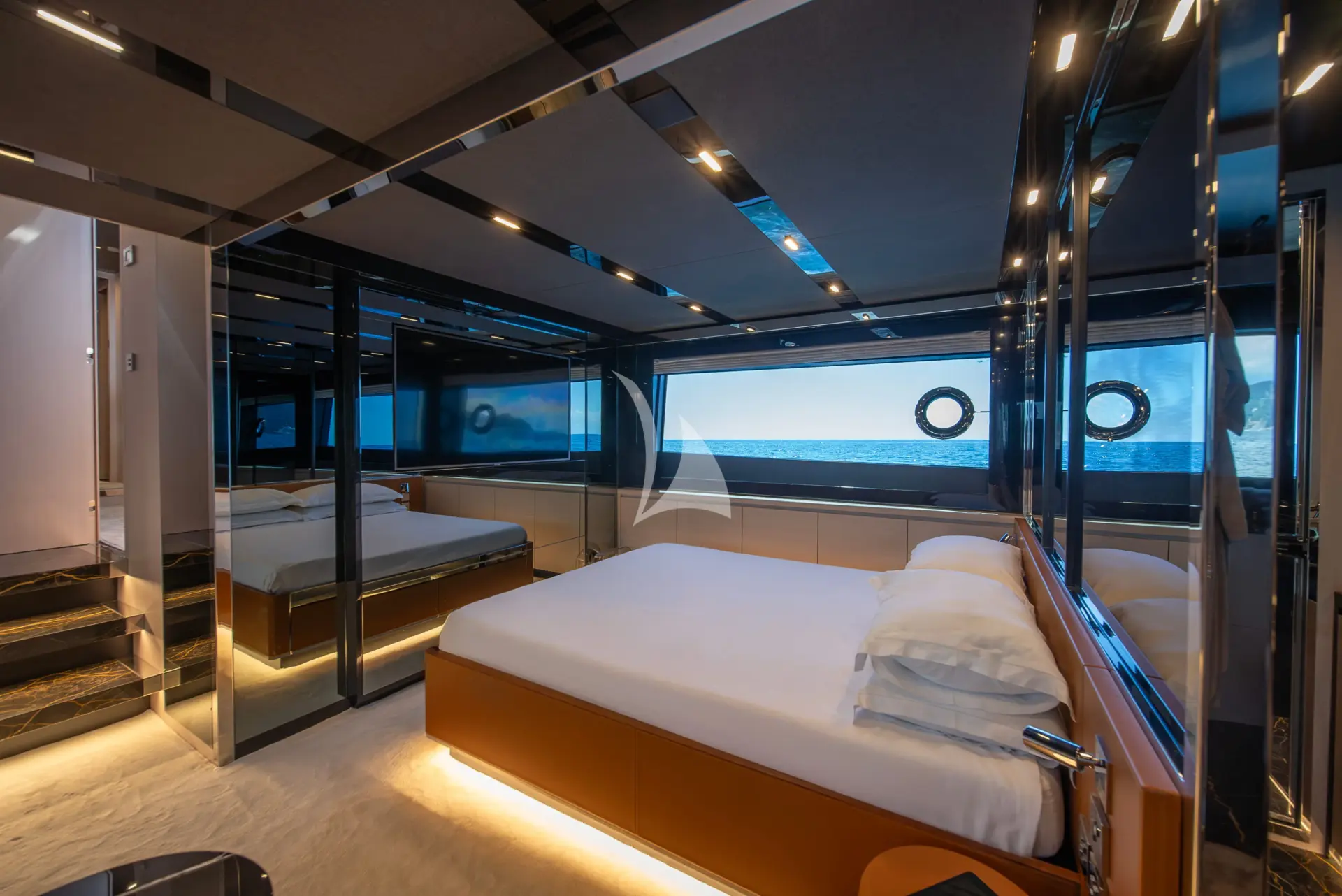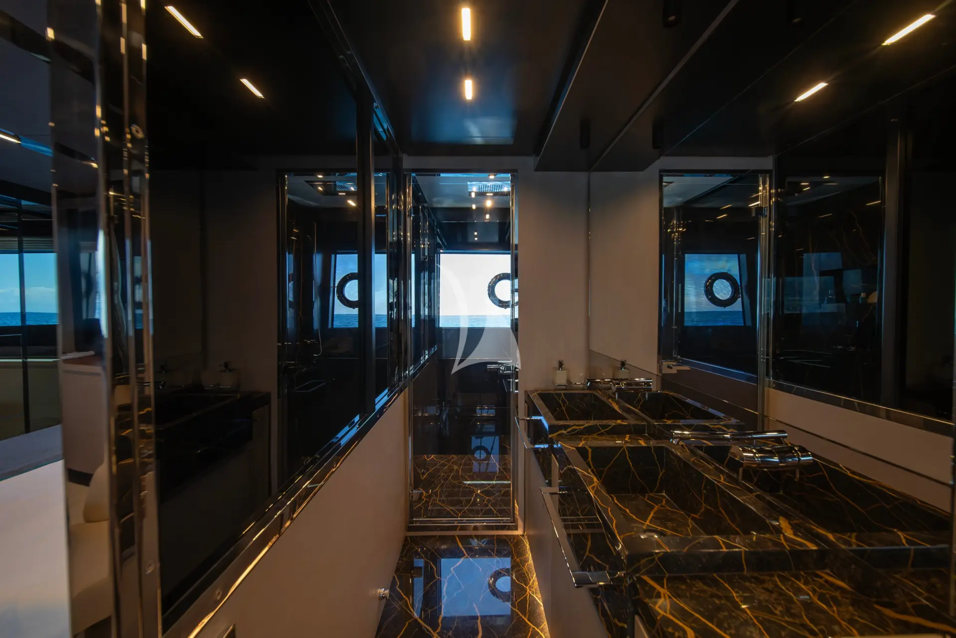The full beam Owner’s suite, located amidships, features a king size bed, a generous ensuite bathroom in black marble spanning the yacht’s full beam, and a spacious walk in wardrobe.