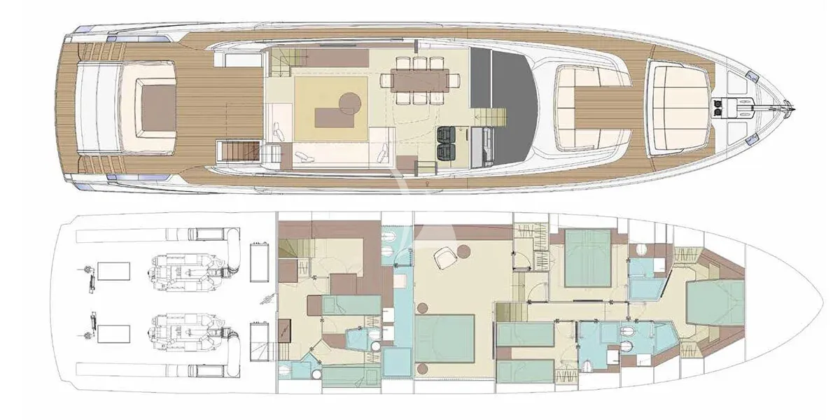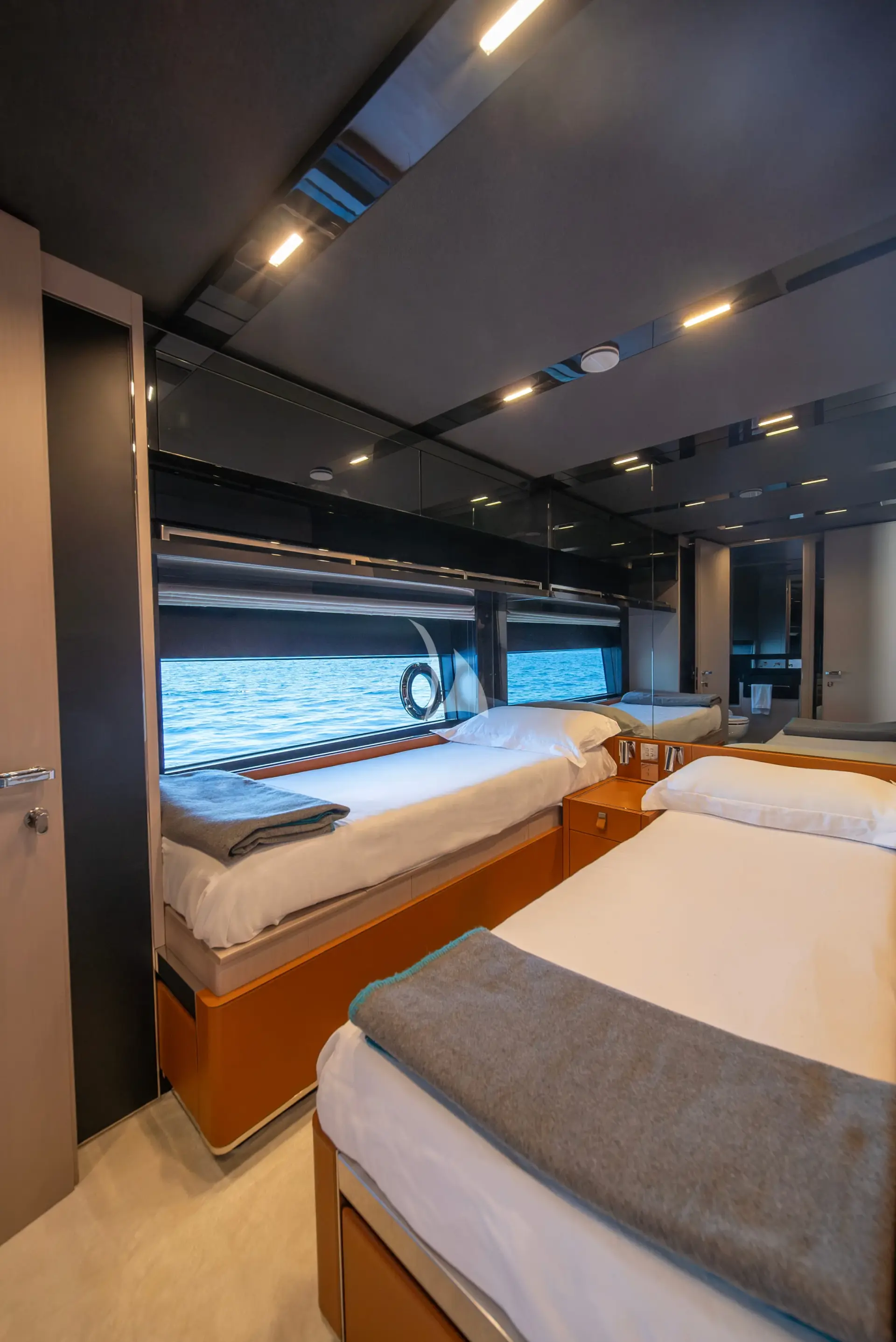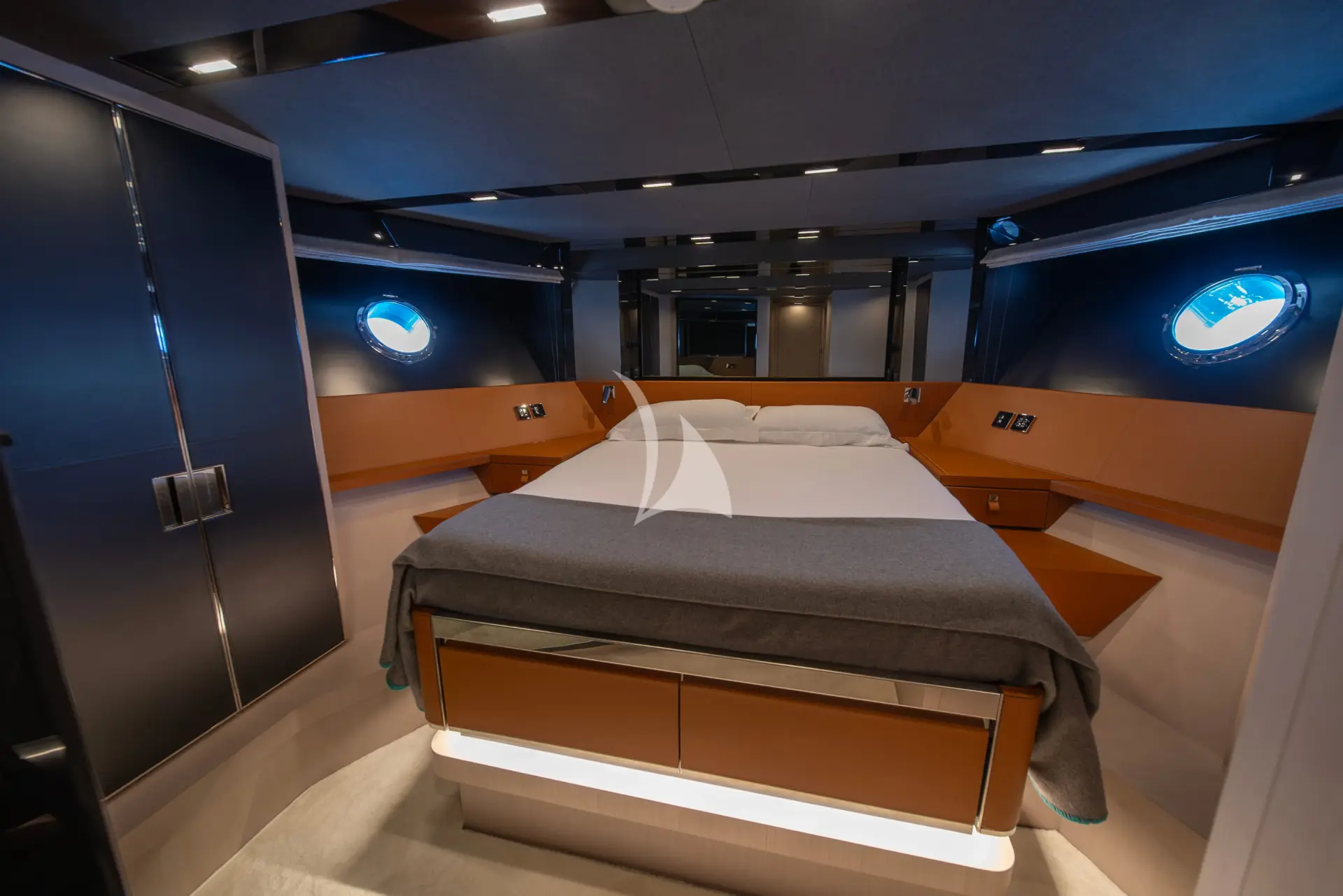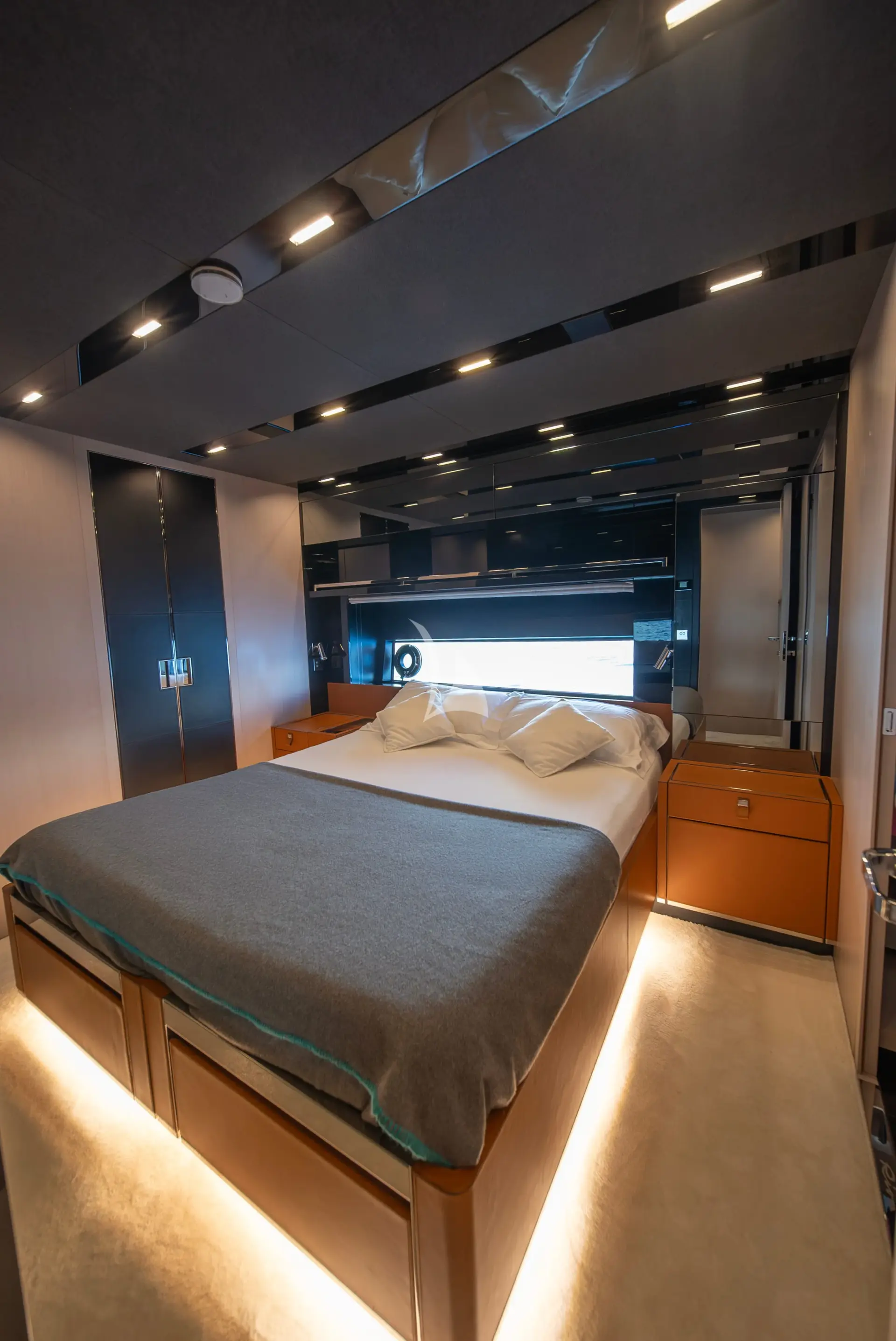 The full beam Owner’s suite, located amidships, features a king size bed, a generous ensuite bathroom in black marble spanning the yacht’s full beam, and a spacious walk in wardrobe.