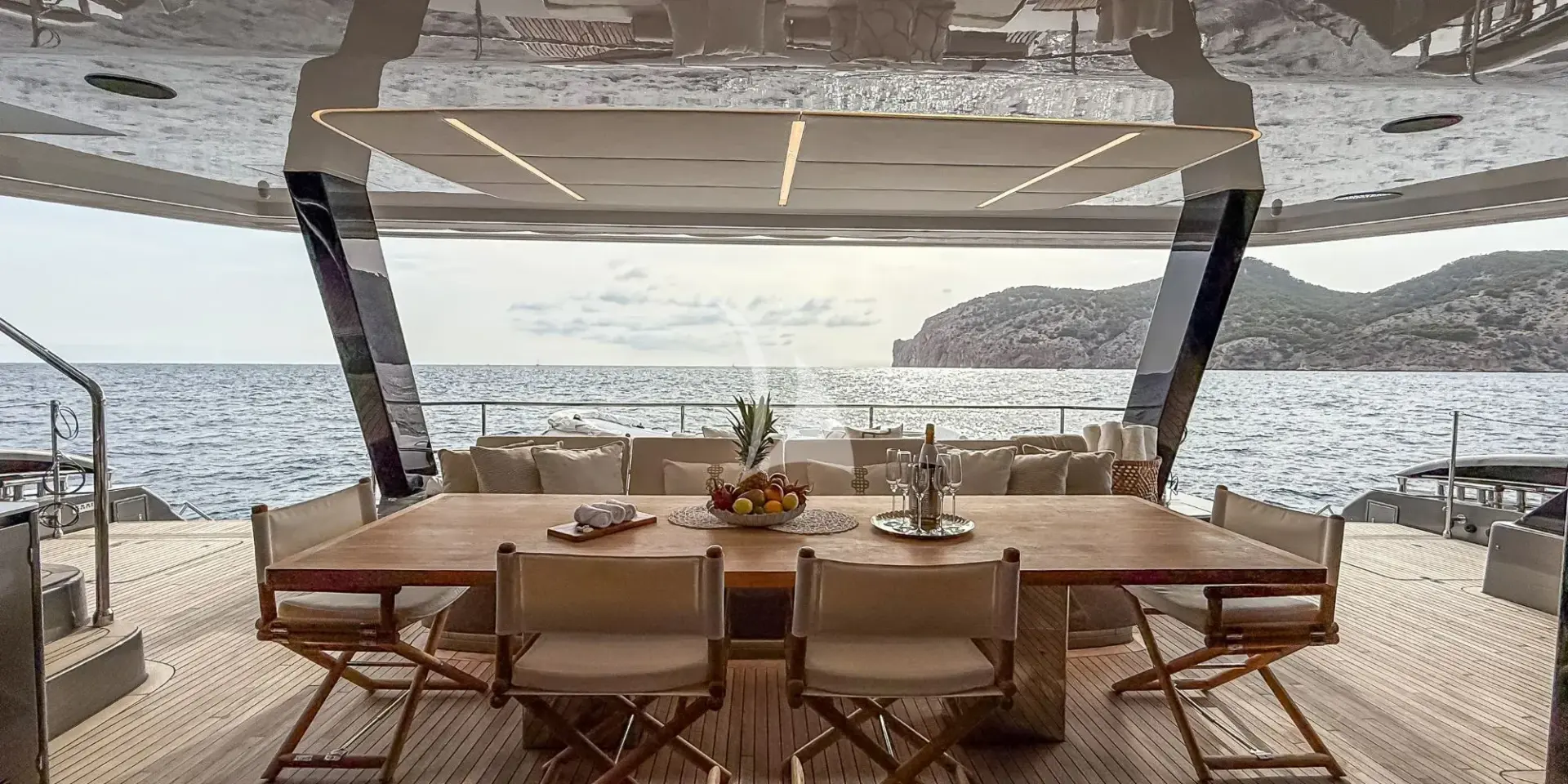 This catamaran's outdoor decks offer countless seating areas for socialising, or for peacefully admiring the ocean view, a particular highlight being the jacuzzi. Guests have a number of outdoor dining areas to choose from, all perfect settings for enjoying a delicious meal, prepared and delivered by the dedicated crew of 4. Much of the deck is shaded, making sitting outside an all the more pleasurable experience. Furthermore, large sliding doors to the saloon facilitate indoor-outdoor living, allowing guests to feel truly at one with the scenery which surrounds them.