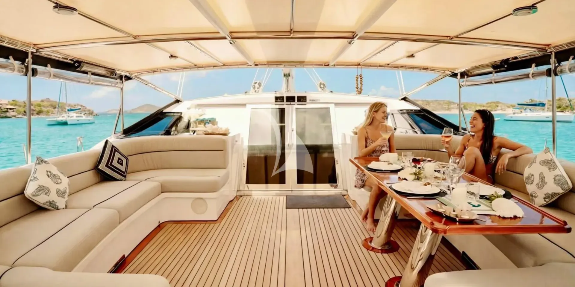Very spacious ‘relaxing’ area with two sofas to port, coffee tables