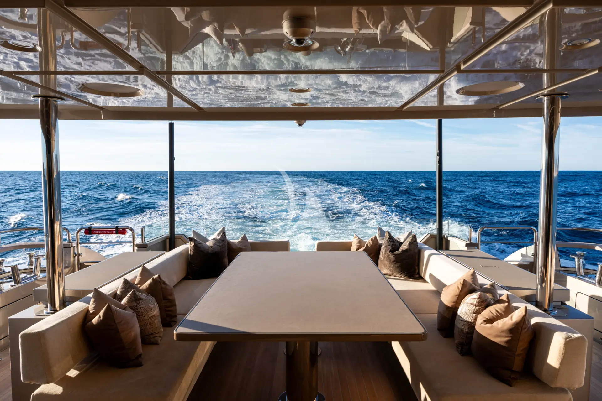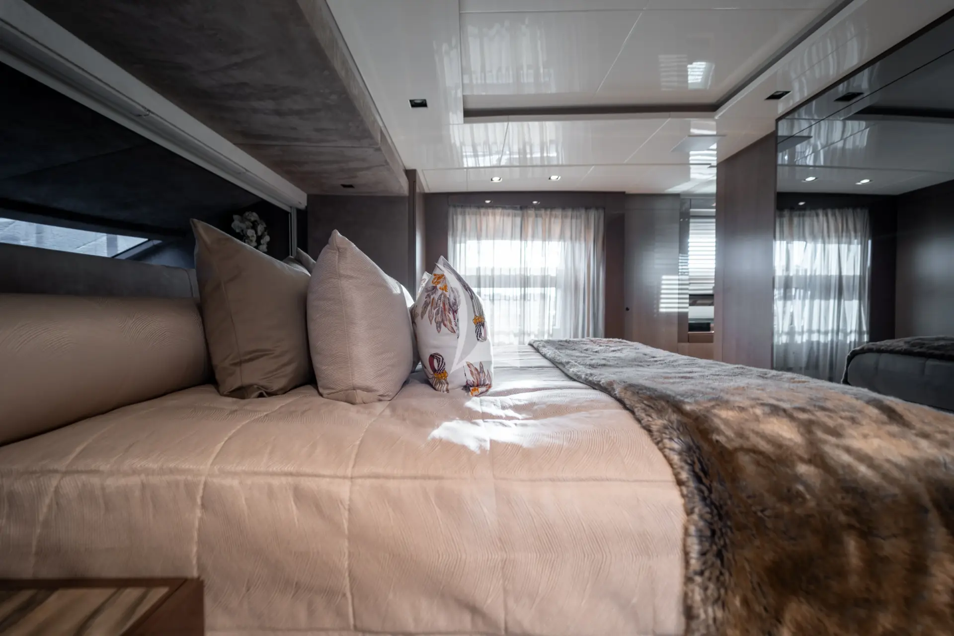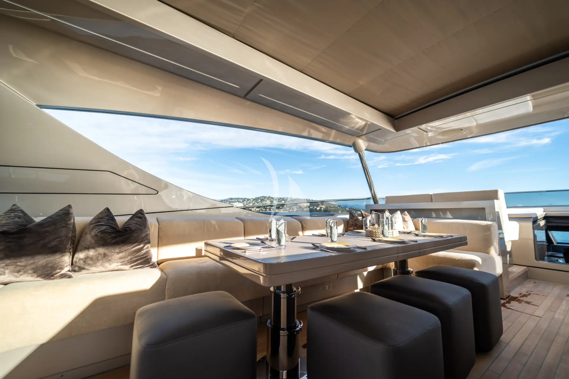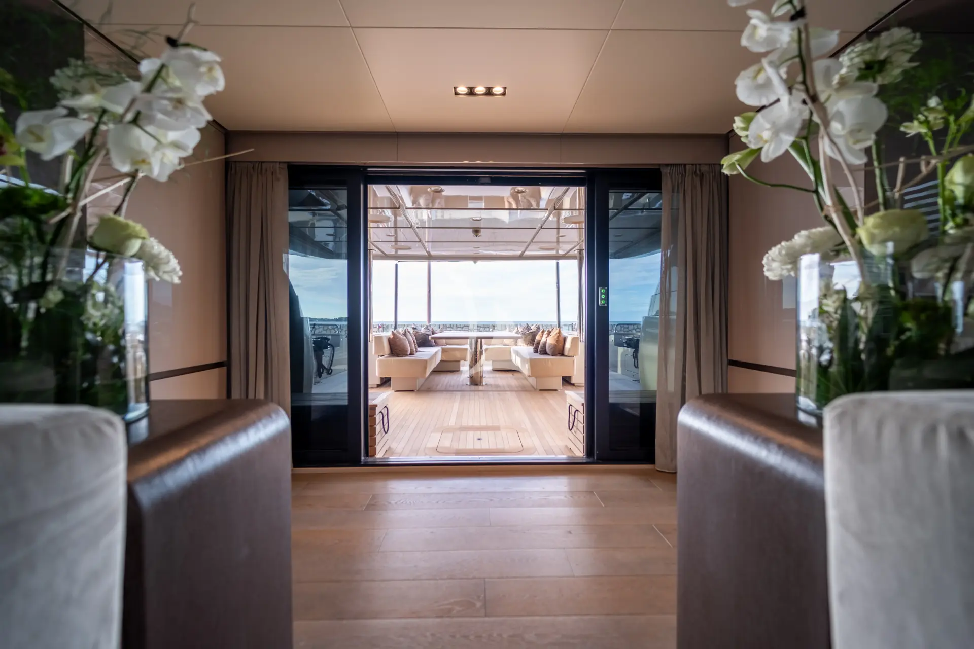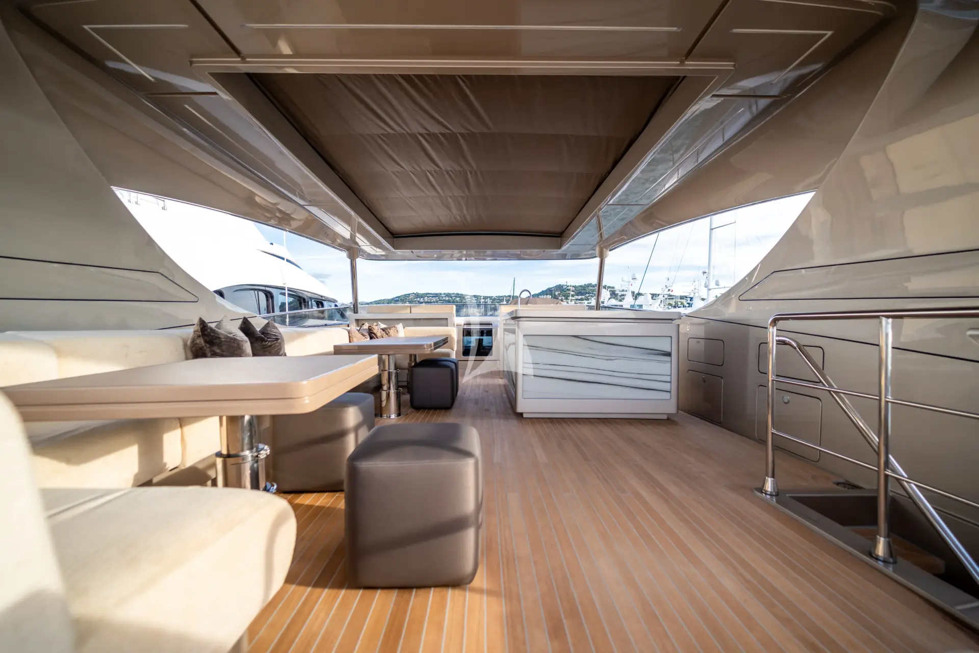 A key highlight is her full-beam master cabin, enhanced by double extendable balconies that open directly out to the sea. This rare feature creates a unique indoor-outdoor experience, giving the owner a private waterfront terrace on both sides and flooding the space with light, sea air, and panoramic views.