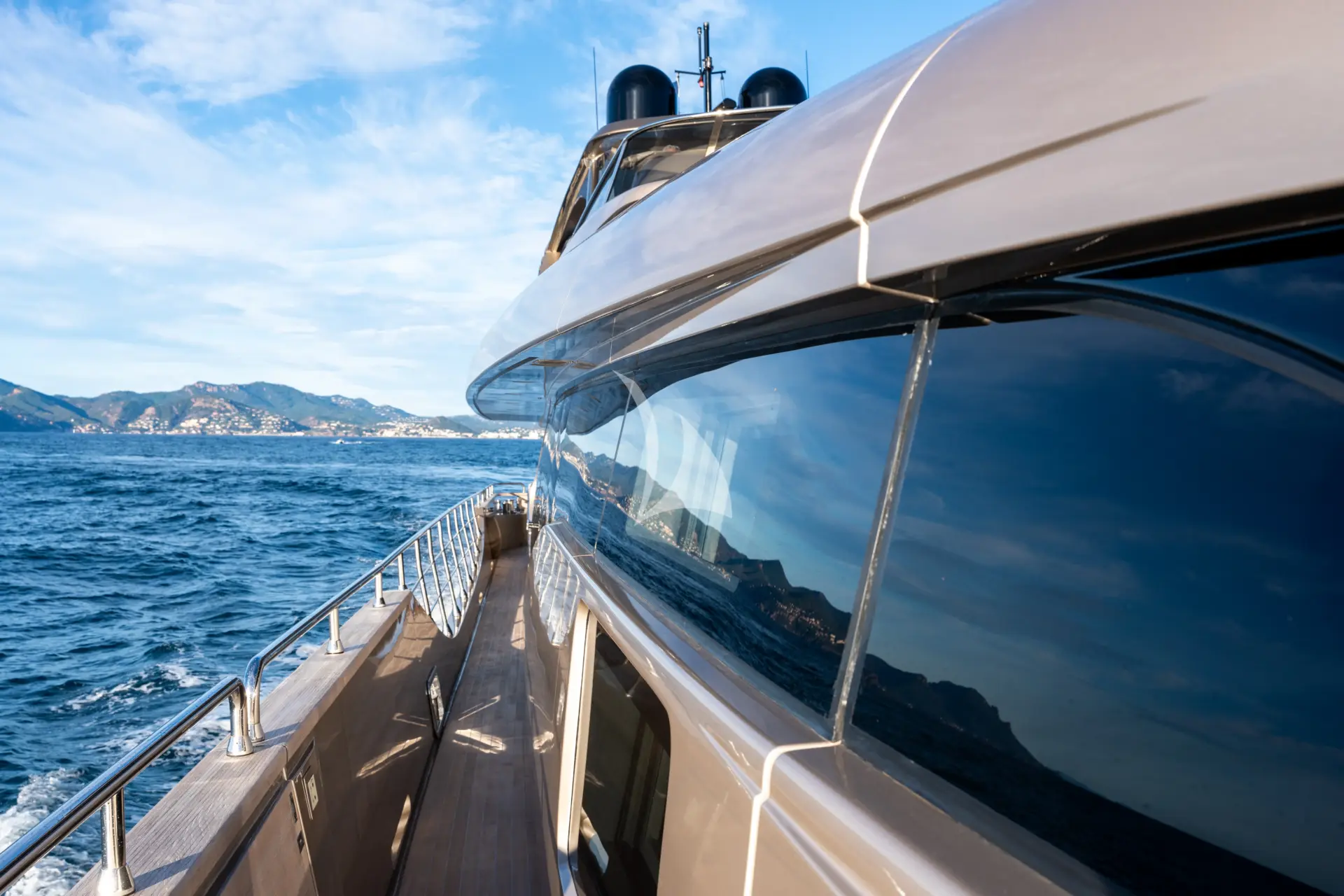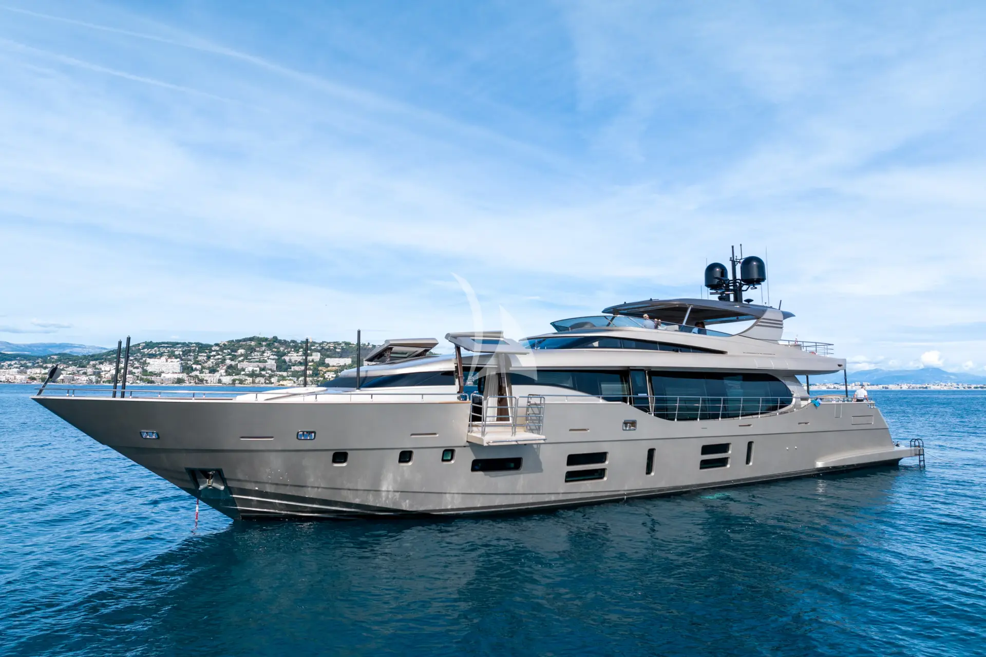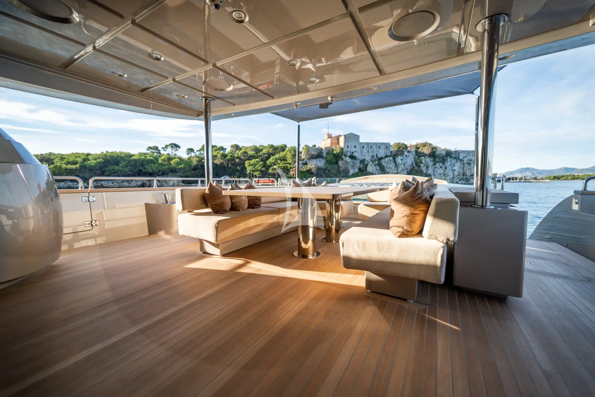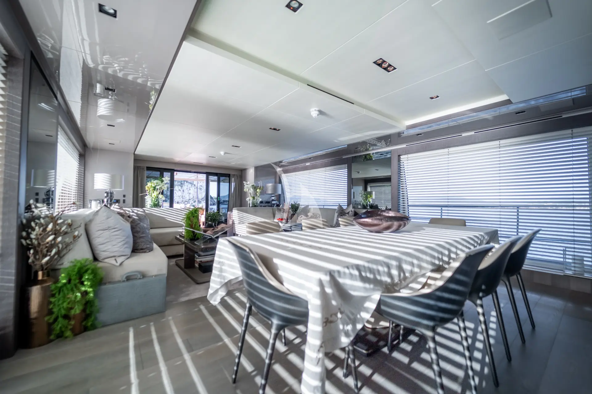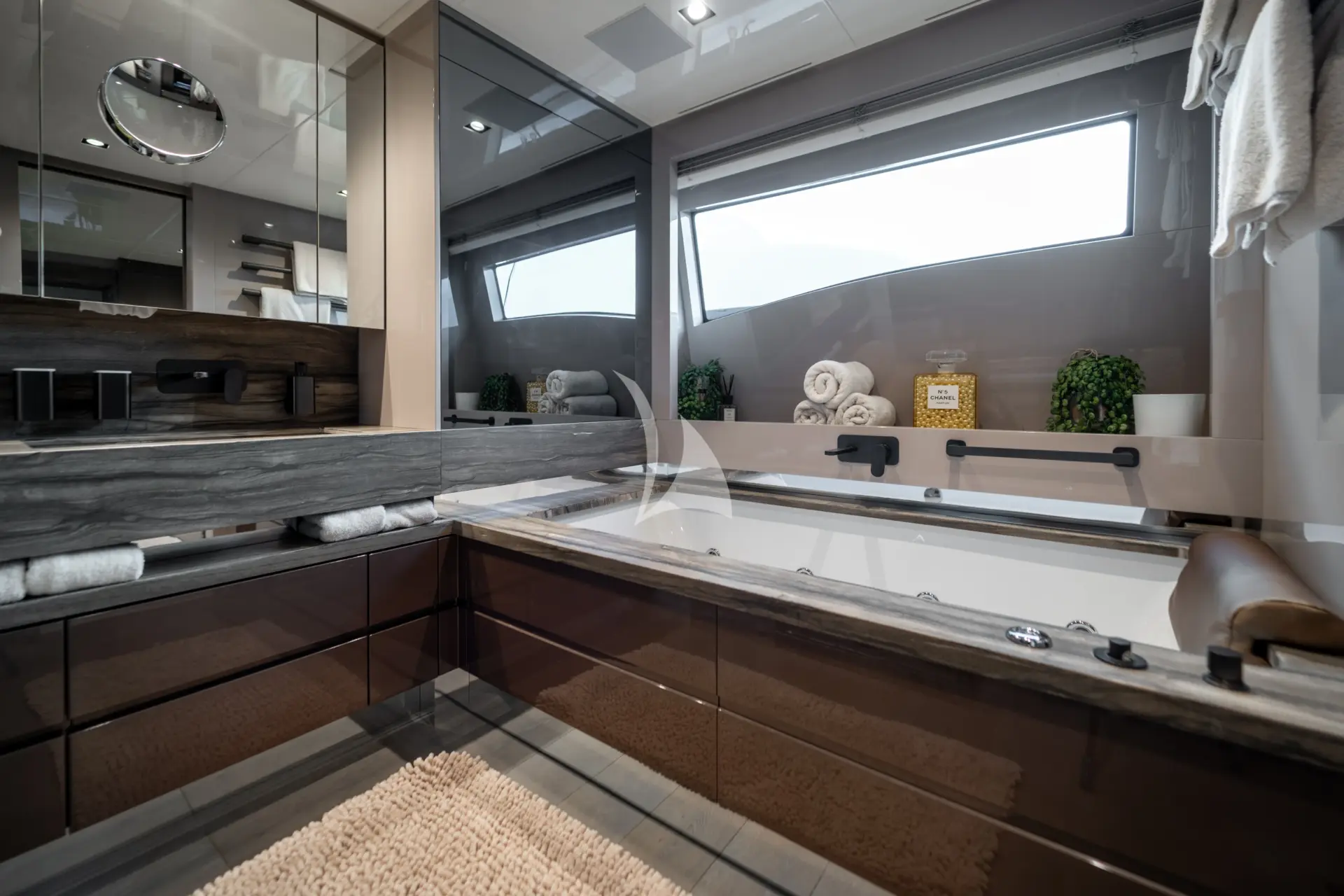 A key highlight is her full-beam master cabin, enhanced by double extendable balconies that open directly out to the sea. This rare feature creates a unique indoor-outdoor experience, giving the owner a private waterfront terrace on both sides and flooding the space with light, sea air, and panoramic views.
