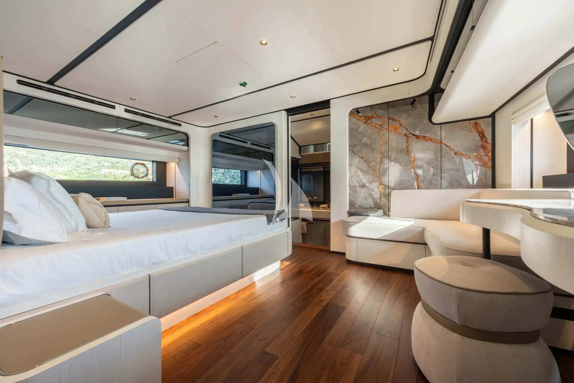 TOGETHER is a 2025 Ferretti 940 and a standout choice in the sub-30m charter category. Delivered in June 2025, she offers a rare combination of generous interior volume, expansive deck space, and a layout that has been thoughtfully optimized for guest comfort. Designed by Ideaeitalia, her interiors are calm, contemporary, and elegant, with full-height windows, warm wood flooring, and a seamless connection to the sea. Guest accommodation includes a full-beam master suite on the main deck, three VIP doubles, and a convertible twin — all en suite — making her perfect for both families and couples.