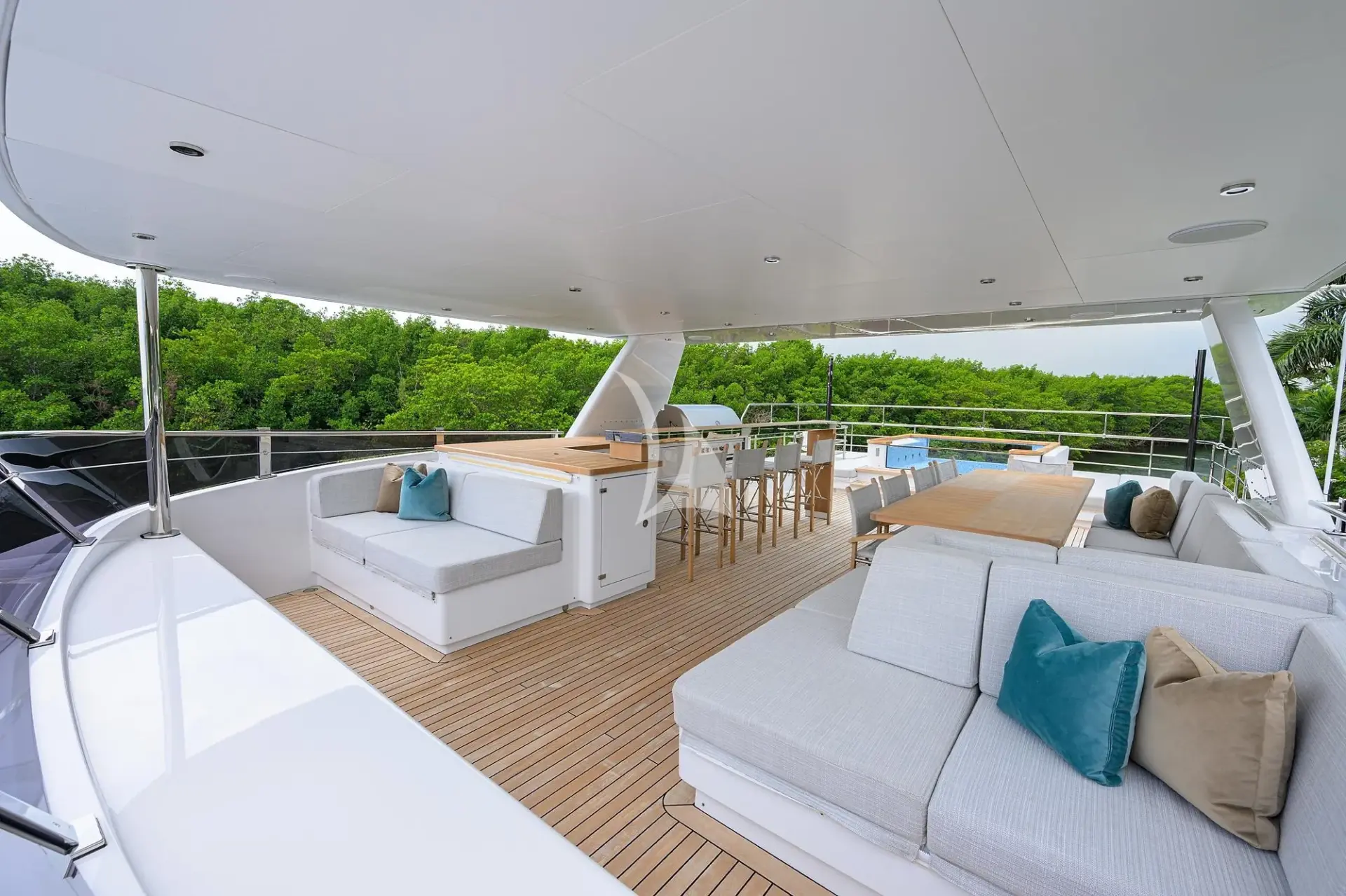 The aft deck and extended swim platform form the social heart of the yacht, doubling as a serious sportfishing cockpit or an inviting lounge area perfect for afternoon dips and water toy fun. Wide side decks lead forward, giving guests a seamless connection to every exterior space. Up top, the expansive sundeck is a true retreat, complete with a mosaic-tiled Jacuzzi surrounded by sunpads, a full bar, barbecue setup, and shaded lounge seating ideal for sunset cocktails or relaxed dining under the stars.
