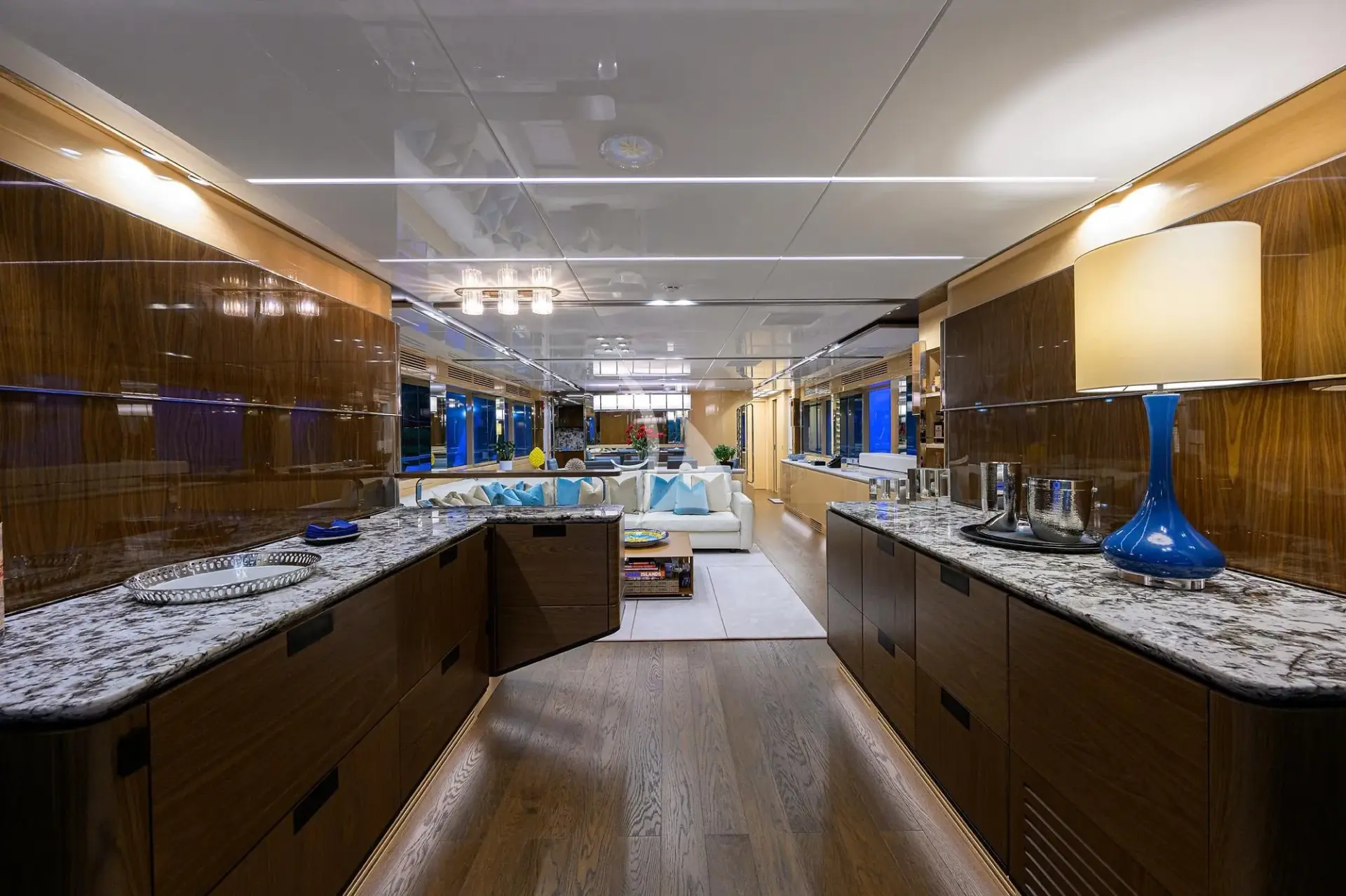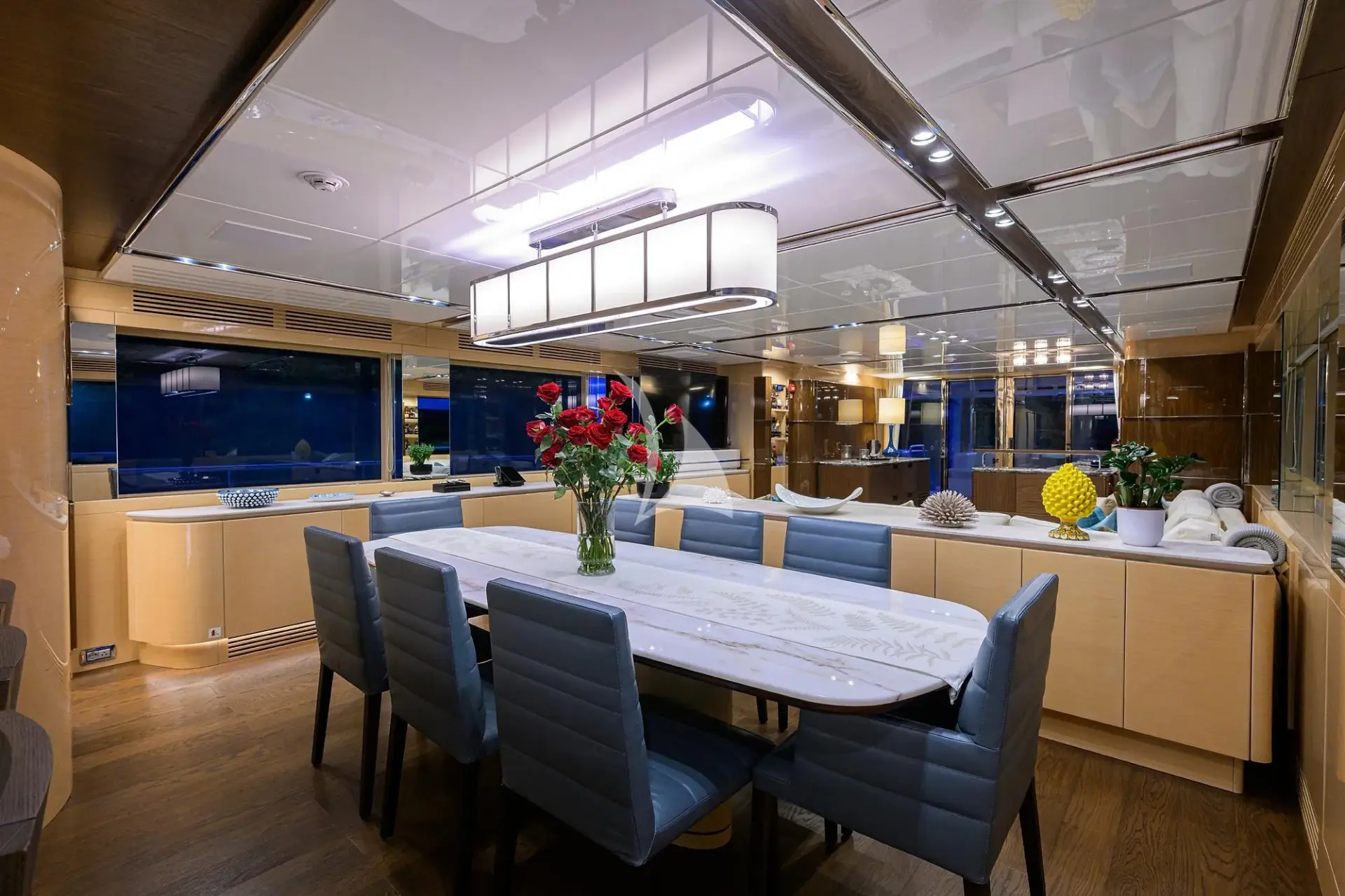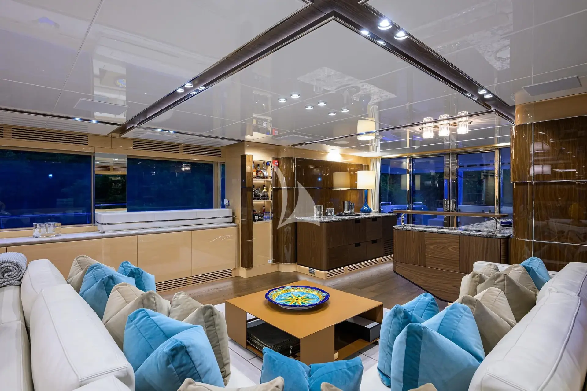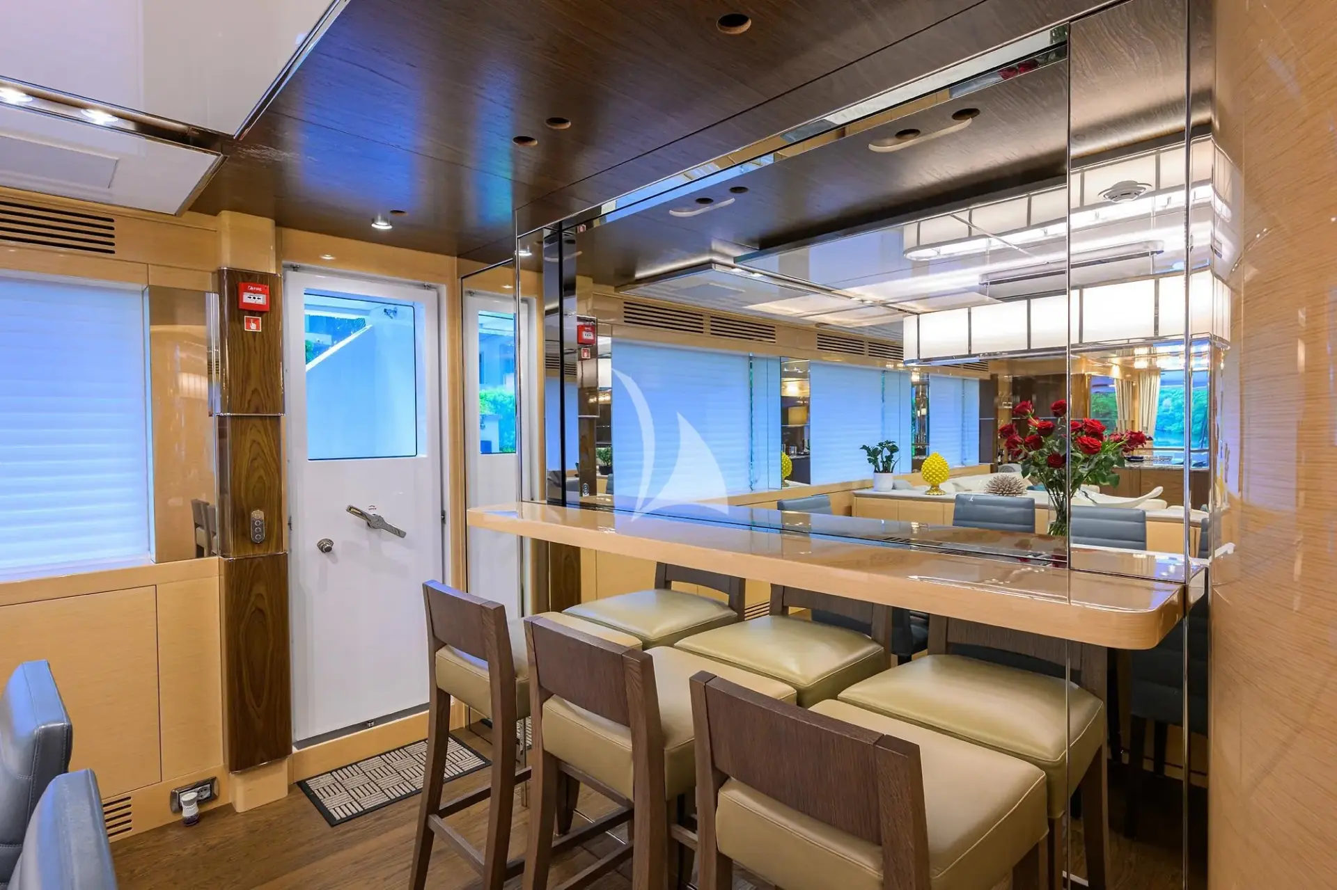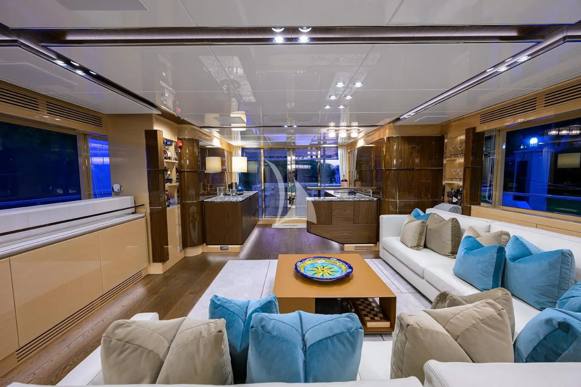Inside, TROPA’s interior combines contemporary elegance with warmth and sophistication. Large windows flood the main salon with natural light, highlighting rich wood finishes, custom details, and a spacious open layout that connects a comfortable lounge, formal dining area, and an adaptable galley that can be either open for social interaction or closed for private service.