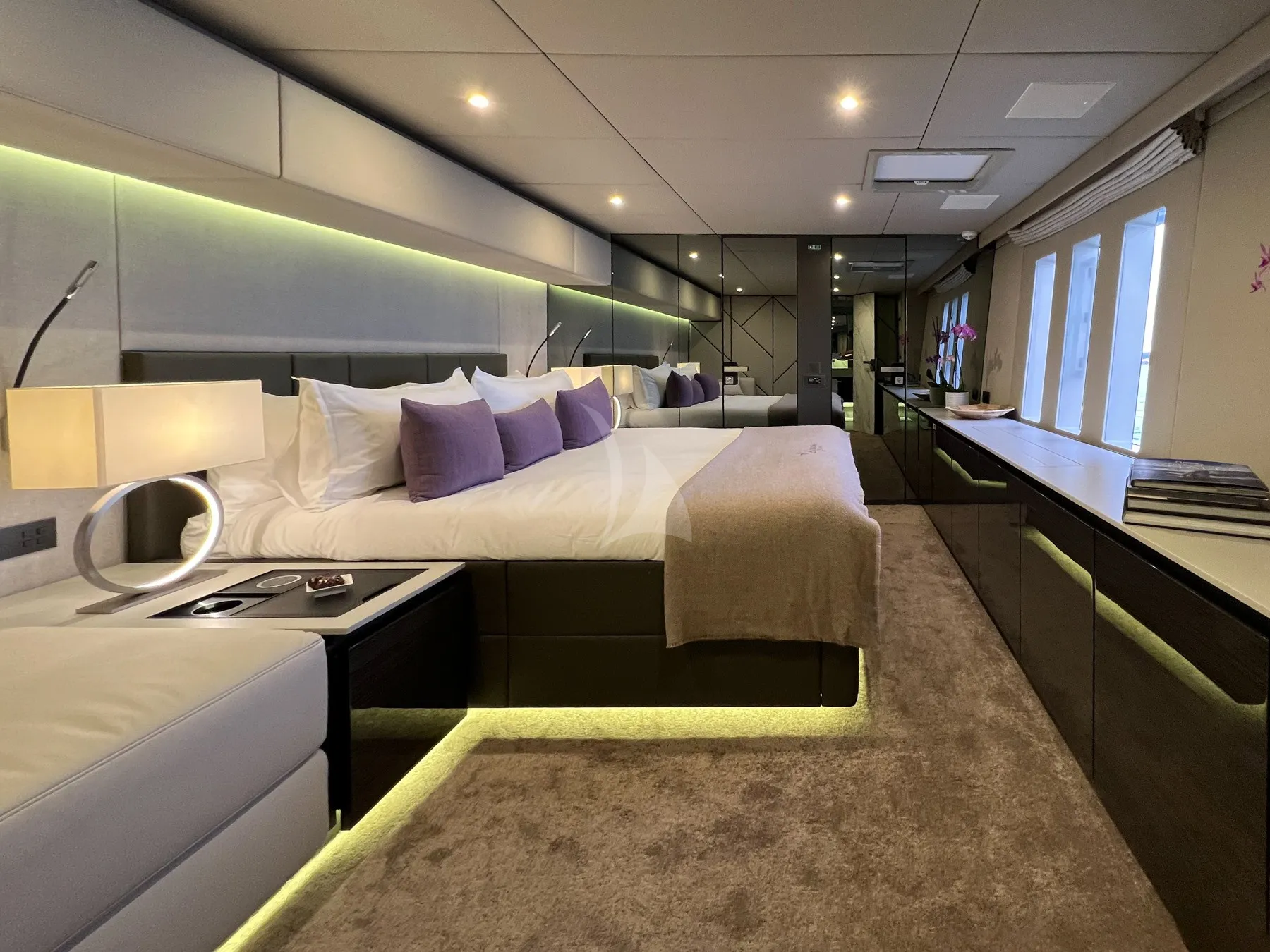 TURKISH DELIGHT can accommodate eight guests across four cabins, including a master cabin with sea views from the king-sized bed, a plush marble bathroom and a dressing room. The remaining three double cabins all have queen-sized beds, and all cabins are connected to the yacht’s Yamaha sound system and come with their own TV.