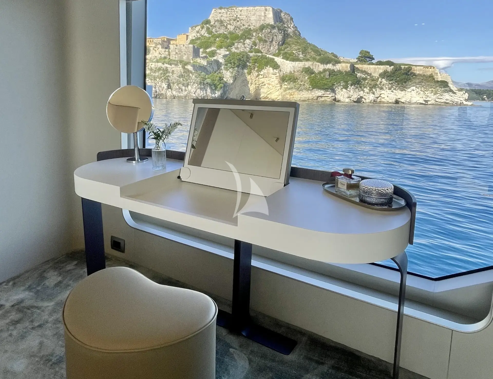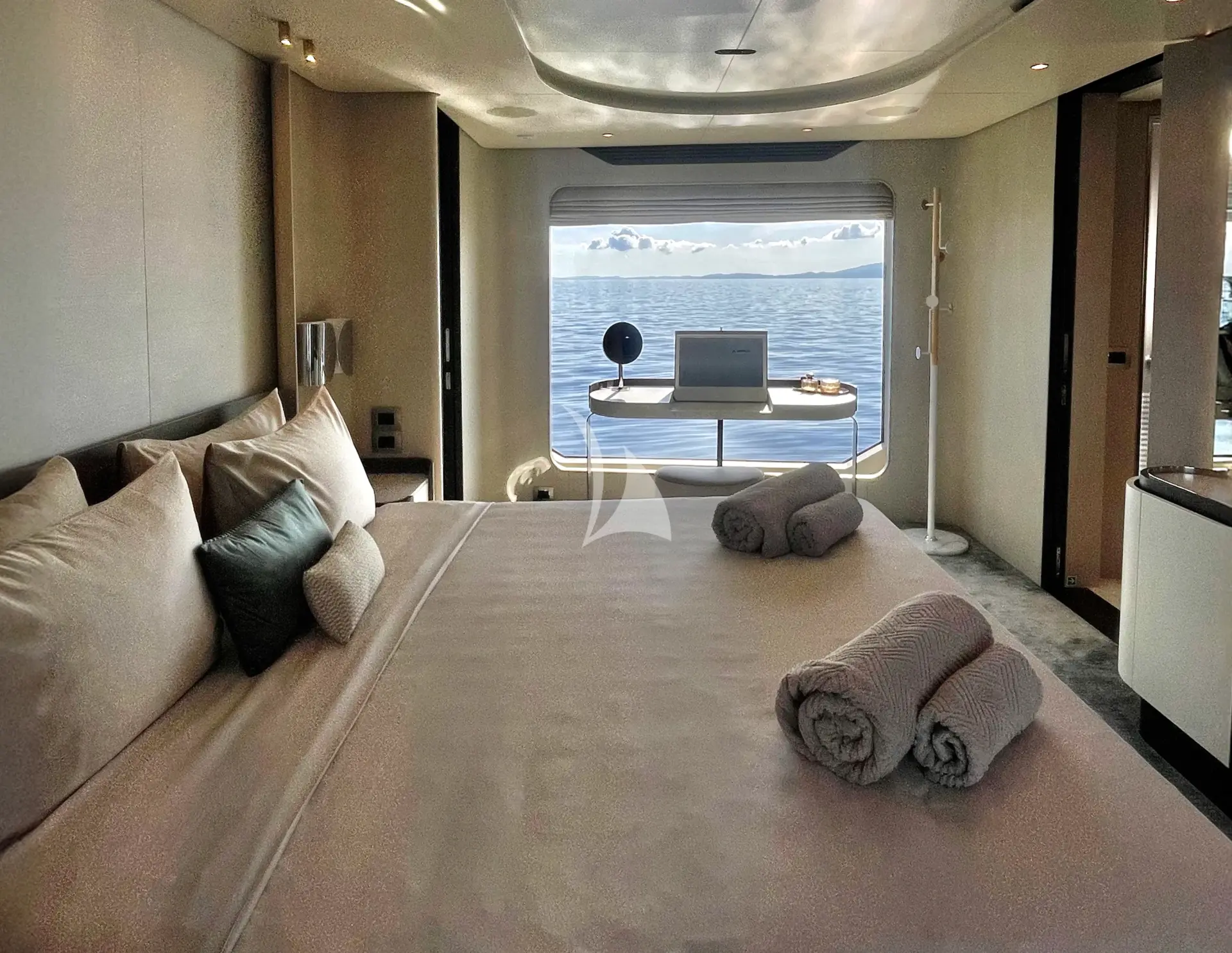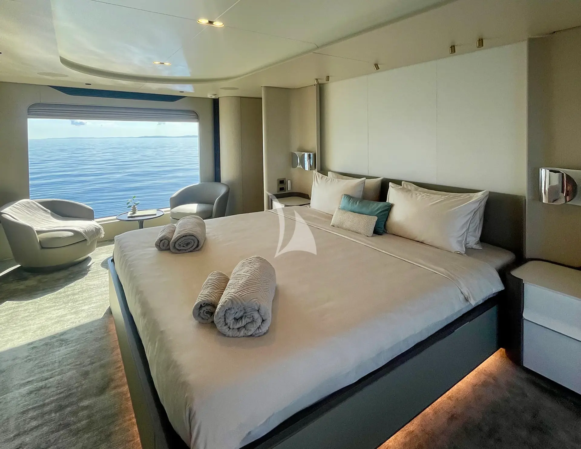 The Owner’s suite offers a truly incomparable sense of connection to the sea, thanks to extraordinary full-length windows on both sides that frame breathtaking, uninterrupted views. This luxurious sanctuary features a king-size bed and a beautifully appointed en-suite bathroom with a spacious walk-in shower and elegant vanity unit.