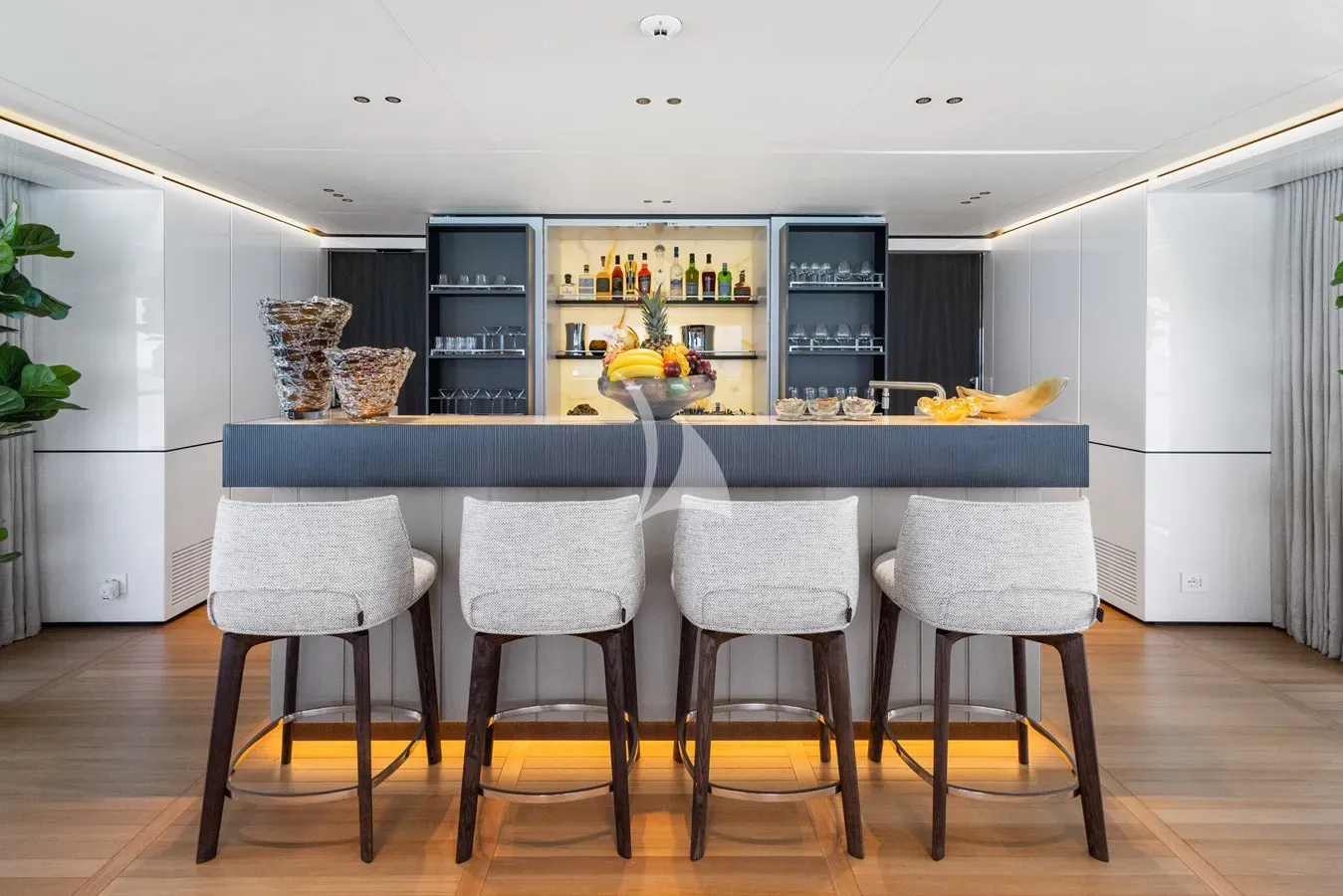 Indoor spaces include an elegant main deck salon with curved white sofas and an a striking illuminated Onice marble bar, a comfortable sky lounge for movie nights, and a wellness cabin that can also be used as a gym.