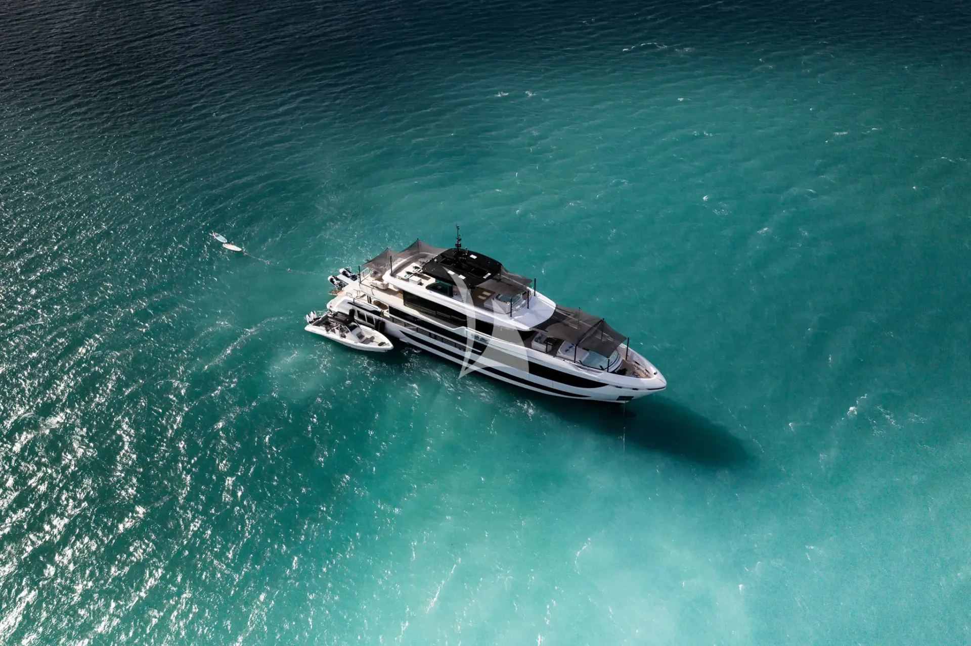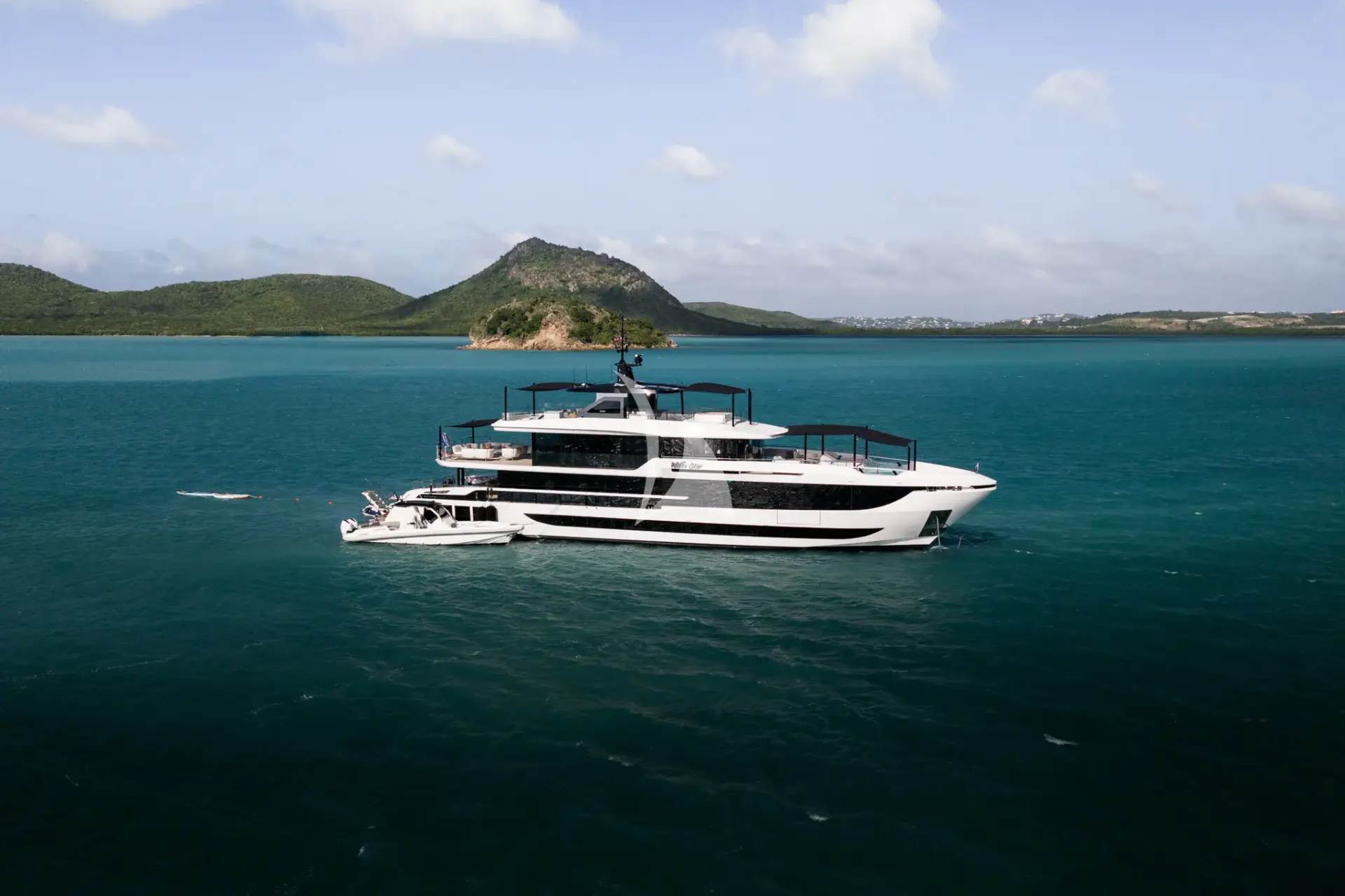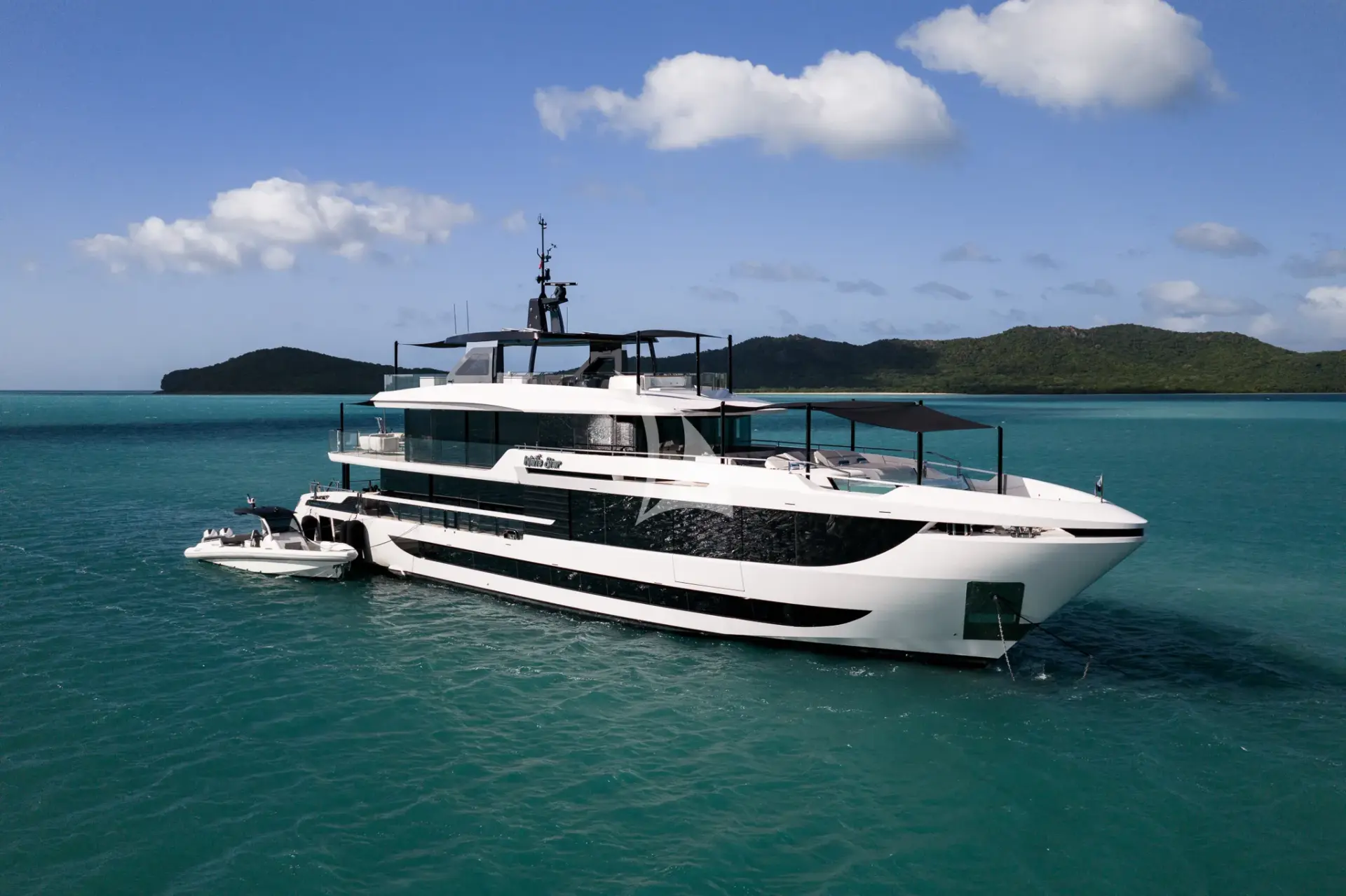 WHITE STAR is a 129ft (39m) motor yacht built by Mangusta (overmarine) in 2025, with design by Overmarine. She accommodates up to 10 guests in 5 cabins comprising 3 single and 2 convertible, with a professional crew of 7 ensuring an exceptional charter experience. Available for charter in North America, The Caribbean and the Bahamas. Notable features include she had generous interior and exterior volume due to her 28 foot beam., she is fully automated throughout with state-of-the-art AV, air conditioning, lighting and related., over 50 speakers located inside and out with 5 Surround Sound TV systems., 2023 Skipper 38' Tender (Twin Mercury 450R(1000HP total)), and 6 Person jacuzzi on sundeck.