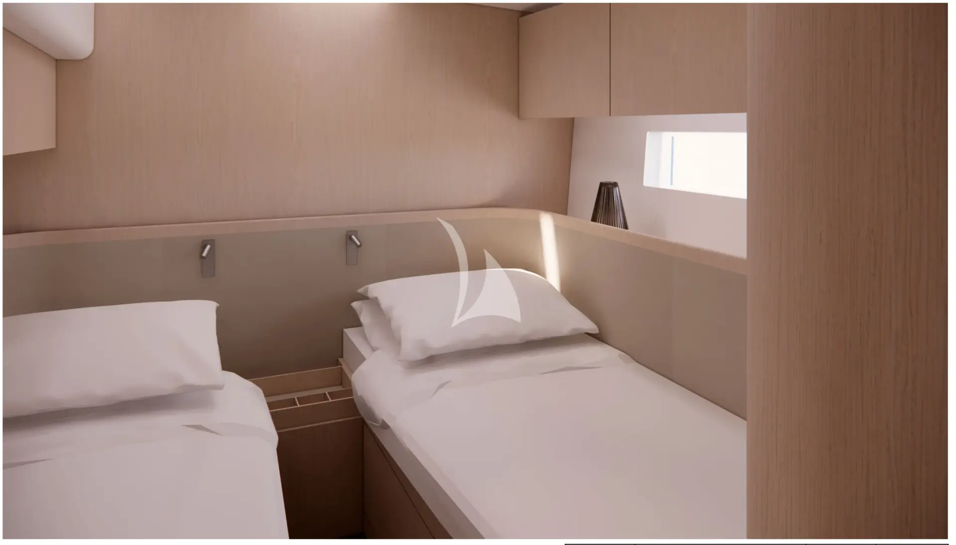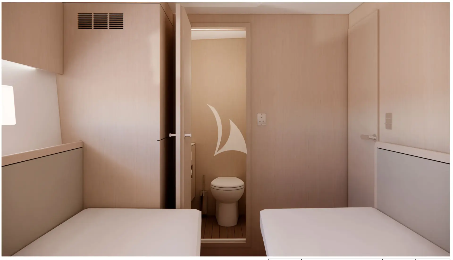 The layout also ensures a clear separation between crew and guests thanks to a dedicated crew mess — a rare feature on a sailing yacht of this size — with the engine room accessible from the crew area for discreet and quiet maintenance during the charter.